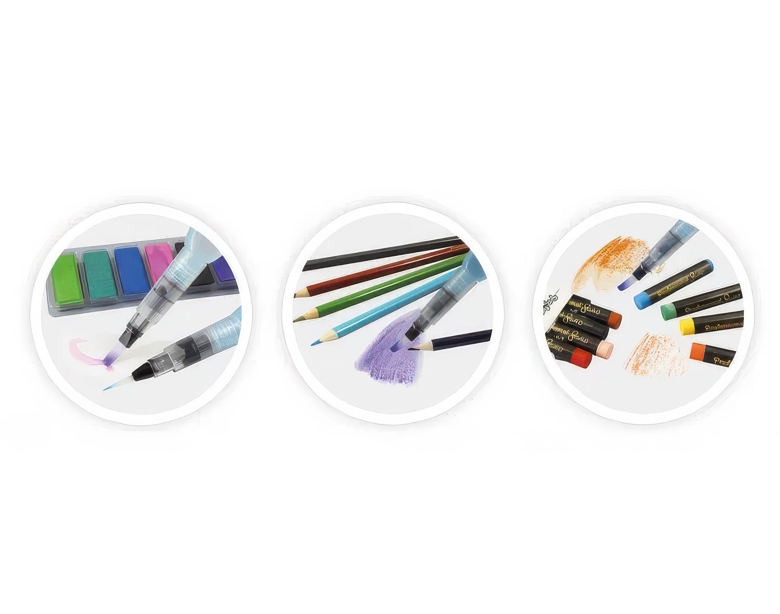 The 2 refillable water brushes make it easy to paint with the 12 cakes of paint, and the crayons and pastel crayons are easy to use too.
