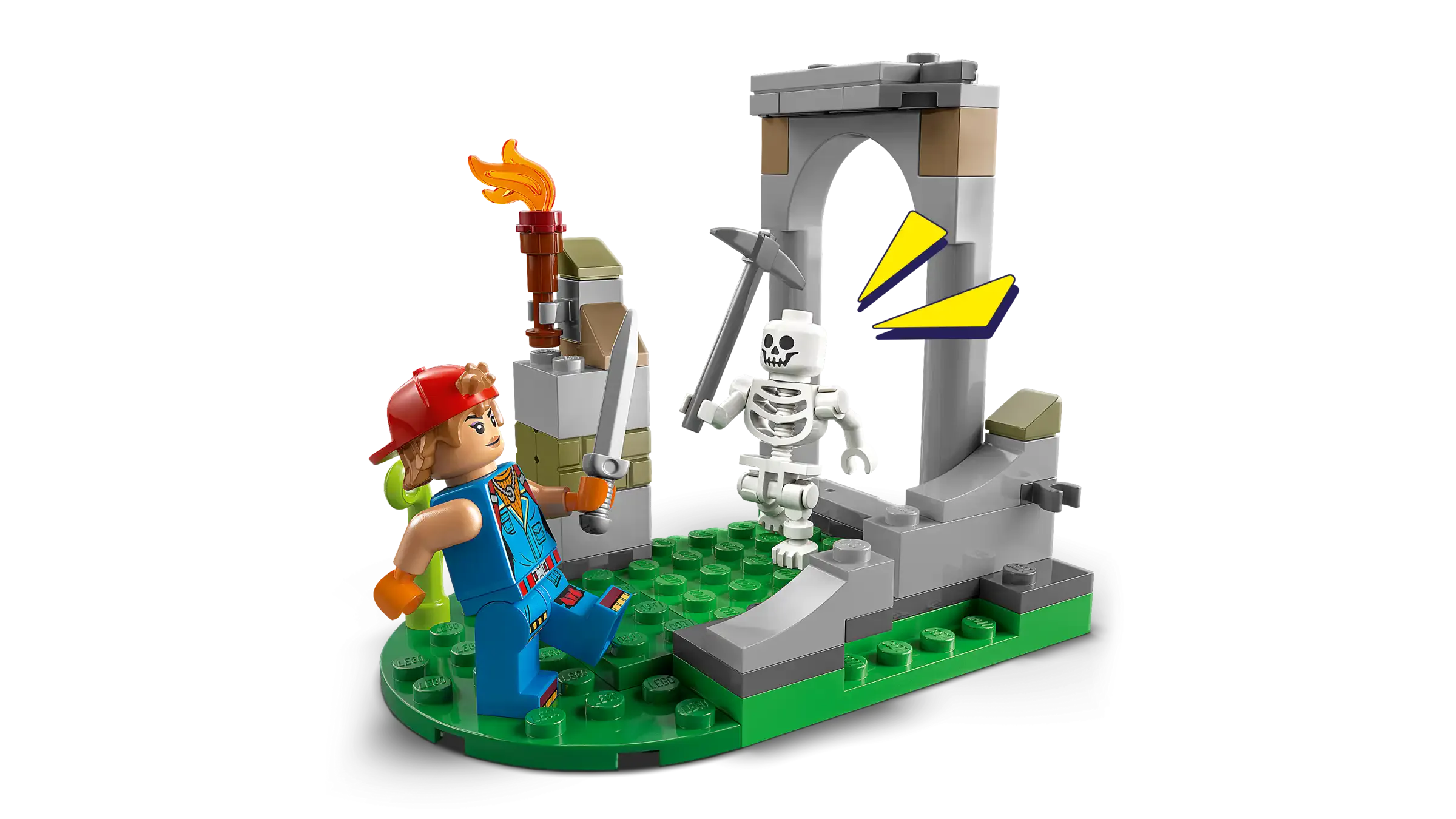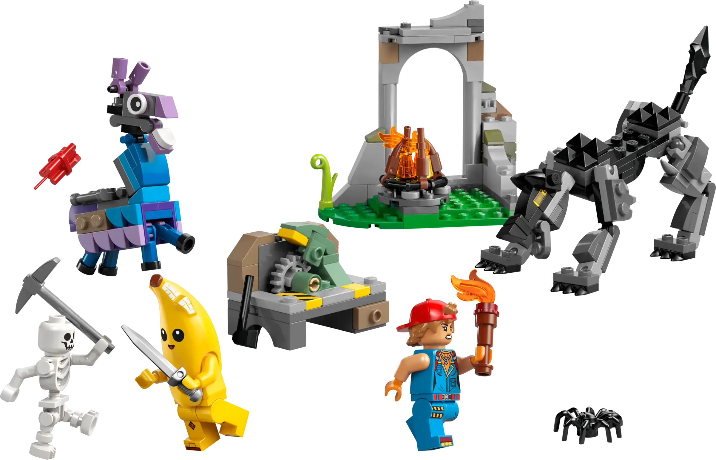 The playset replicates the first challenges players encounter in the LEGO Fortnite Odyssey video game, and boys and girls will have fun building the campfire, a workbench, and ruins that can be deconstructed and reconfigured. It also features a Supply Llama figure and a wolf figure with a movable tail and legs. The action is brought to life by minifigures of Peely, Sparkplug and a skeleton, who come with weapon accessories to encourage imaginative role play.