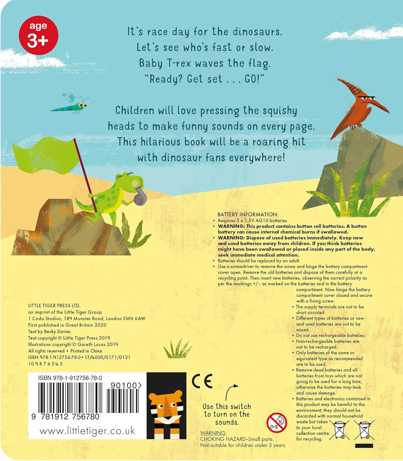 Get ready for a prehistoric adventure with the My First Touch and Feel Sound: Roar! Roar! Dinosaur Board Book! This interactive board book invites young readers to explore the thrilling world of dinosaurs through engaging textures and captivating sounds. As Baby T. rex waves the flag to start the race, children can press the squishy dinosaur heads to hear them roar, bringing the story to life in an exciting and educational way.
