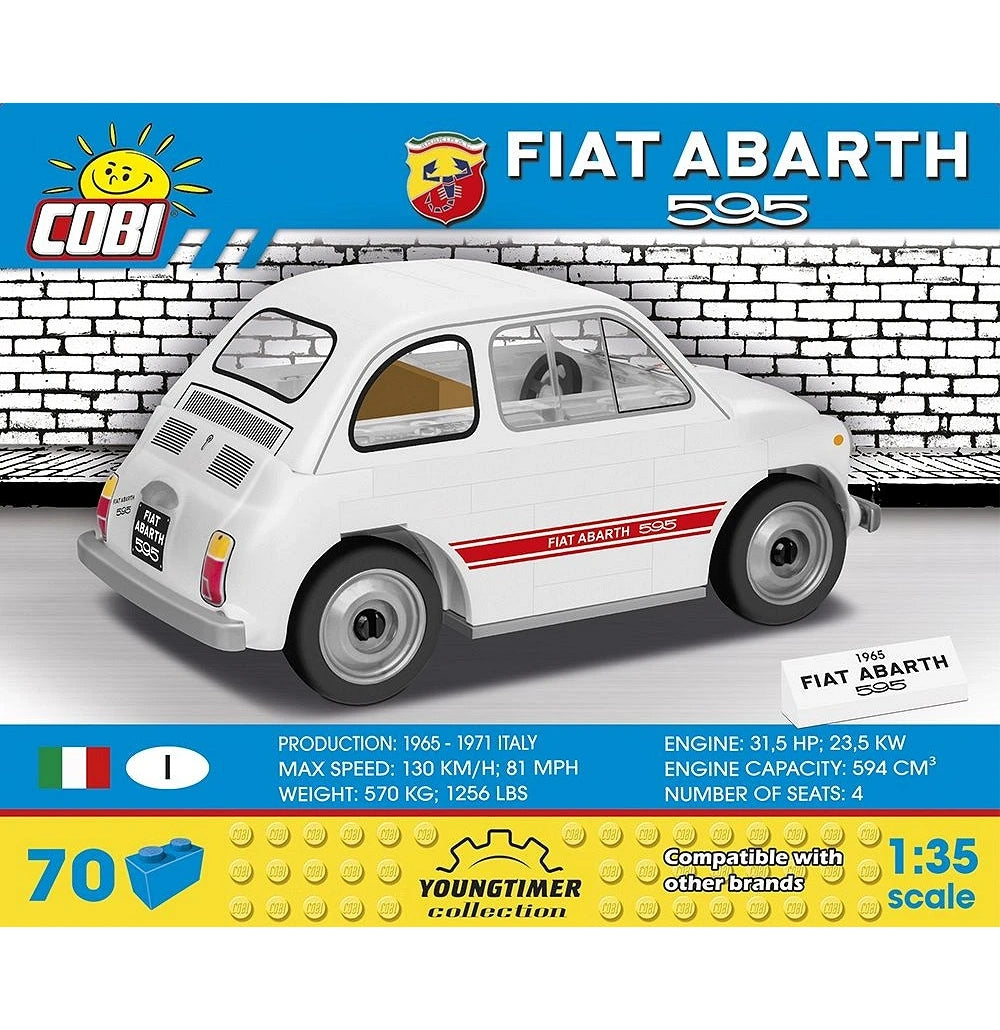 The 1:35 scale model, made up of 100% COBI bricks, very faithfully reflects the distinctive shapes of the original Fiat Abarth 595. With 70 bricks, minor modifications and modifications of the vehicle are possible. Using high quality prints to reproduce the markings on the car, this model will really please those builders who like detail in their kits. The high quality of this kit means that the prints do not wear after time or with play from little one’s hands. Rotating wheels equipped with tires are ideal for moving the model during play.