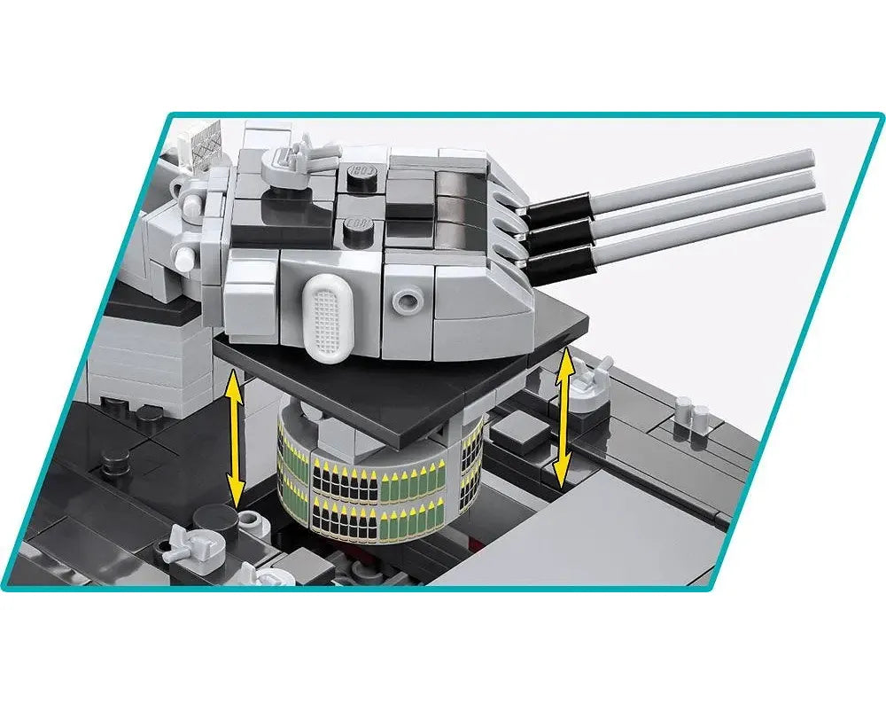 A model made of COBI construction blocks in a scale of 1: 300 is a real challenge for all builders. It consists of 2685 elements and requires several hours of intense and exciting assembly. It is exactly 92 cm (36.2 “) long and 20.5 cm (8”) high. It has movable elements such as artillery turrets and gun barrels, propellers and a rudder. High-quality prints make it possible to capture even more details that make the block-shaped ship look extremely attractive! Thanks to the intuitive instructions based on illustrations, the construction is simple and does not cause any problems. During construction, you choose one of four possible ship variants. The set includes a special block display stand with the names of the ships printed on four different plates. The model looks very impressive on it, no one will be unimpressed! The legendary Iowa-class battleship will be a unique decoration for any collection of history, maritime vessels and military enthusiasts. Build history, piece by piece, with COBI.