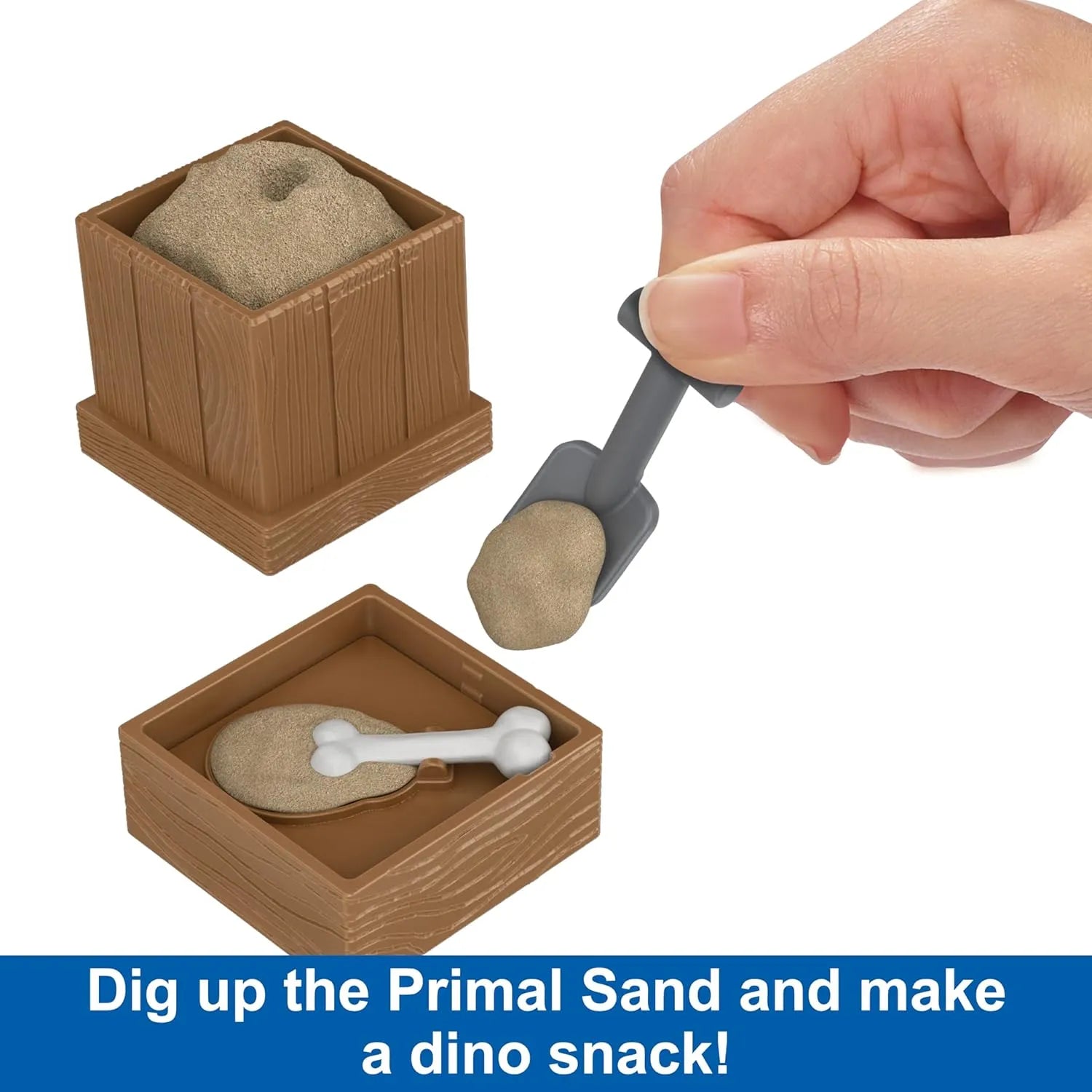 • Press the Primal Sand into the mould on the sandbox lid to create a dino snack! The spring-loaded jaws on the dinosaur figure allow feeding play with the moulded Primal Sand snack food.