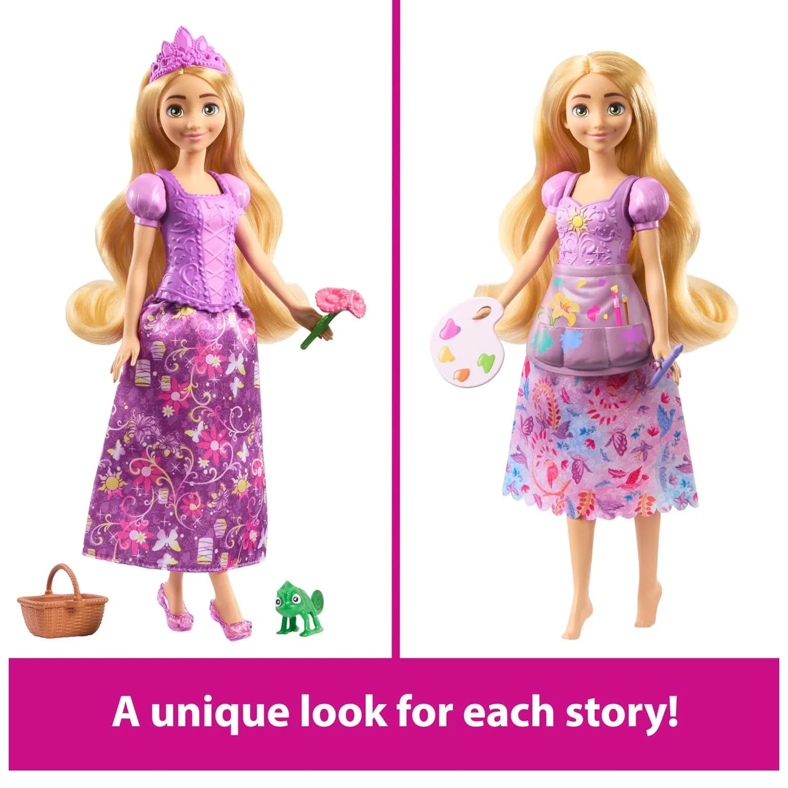 • Disney Princess 2-in-1 Stories Rapunzel fashion doll set has themed fashions and accessories for kids to play out two unique stories.