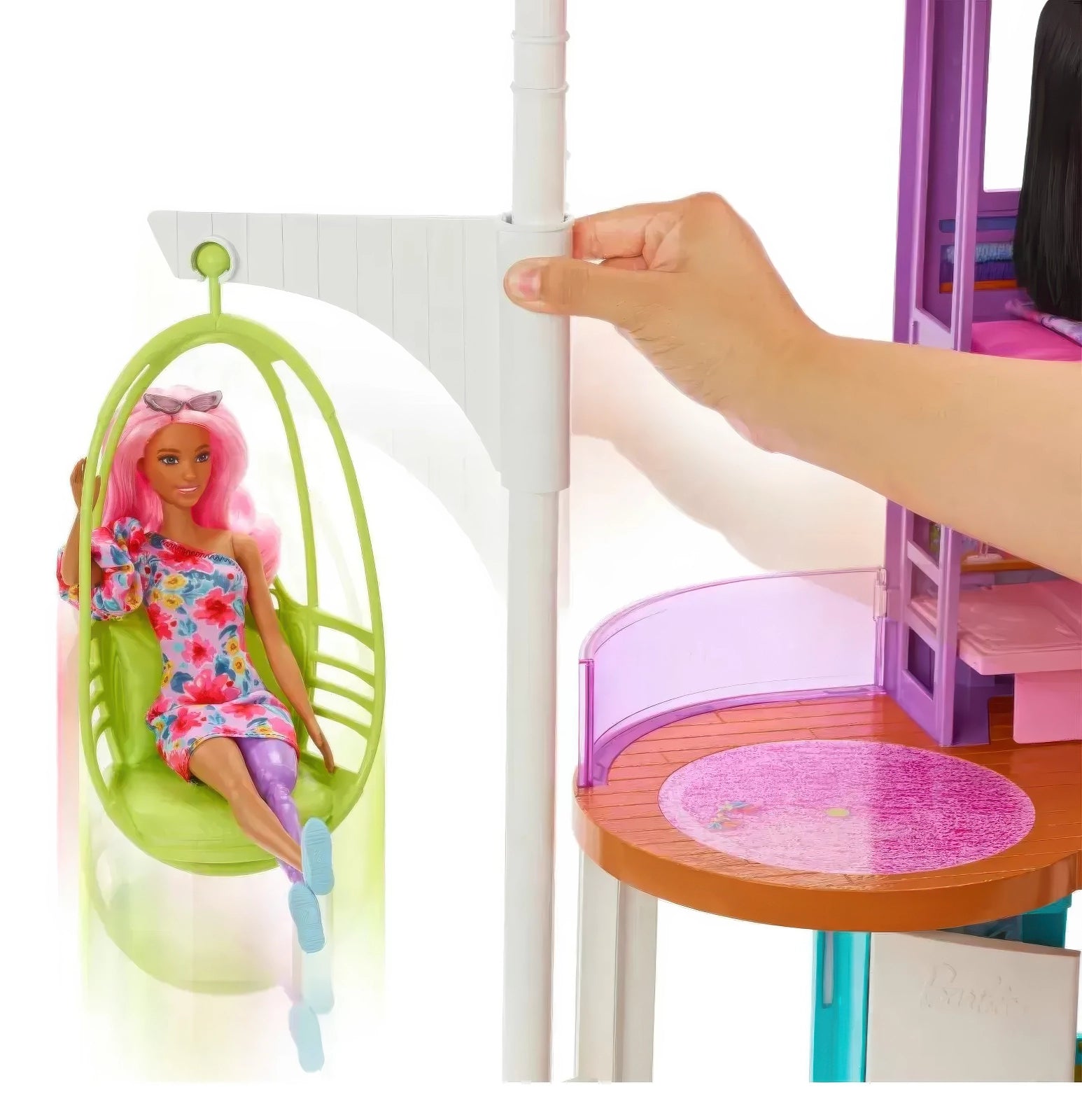 Kids can play out their dream vacations with the Barbie® Vacation House playset! When imaginations step inside this 2-story Barbie® dollhouse, they'll discover endless playtime possibilities with six play areas including a bedroom, bathroom, kitchen, dining room, living room and closet. This Barbie® house opens the door to storytelling fun with a modern, stylish design and cool features, like a swinging chair that doubles as an elevator and a wall that flips up and down to set the scene for a movie night or a birthday party!