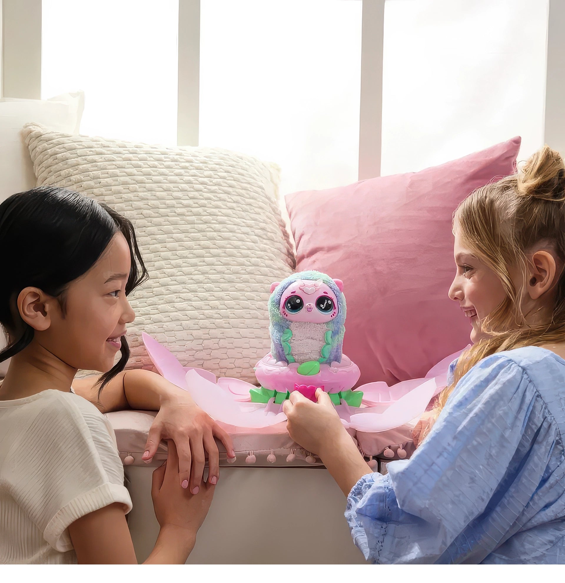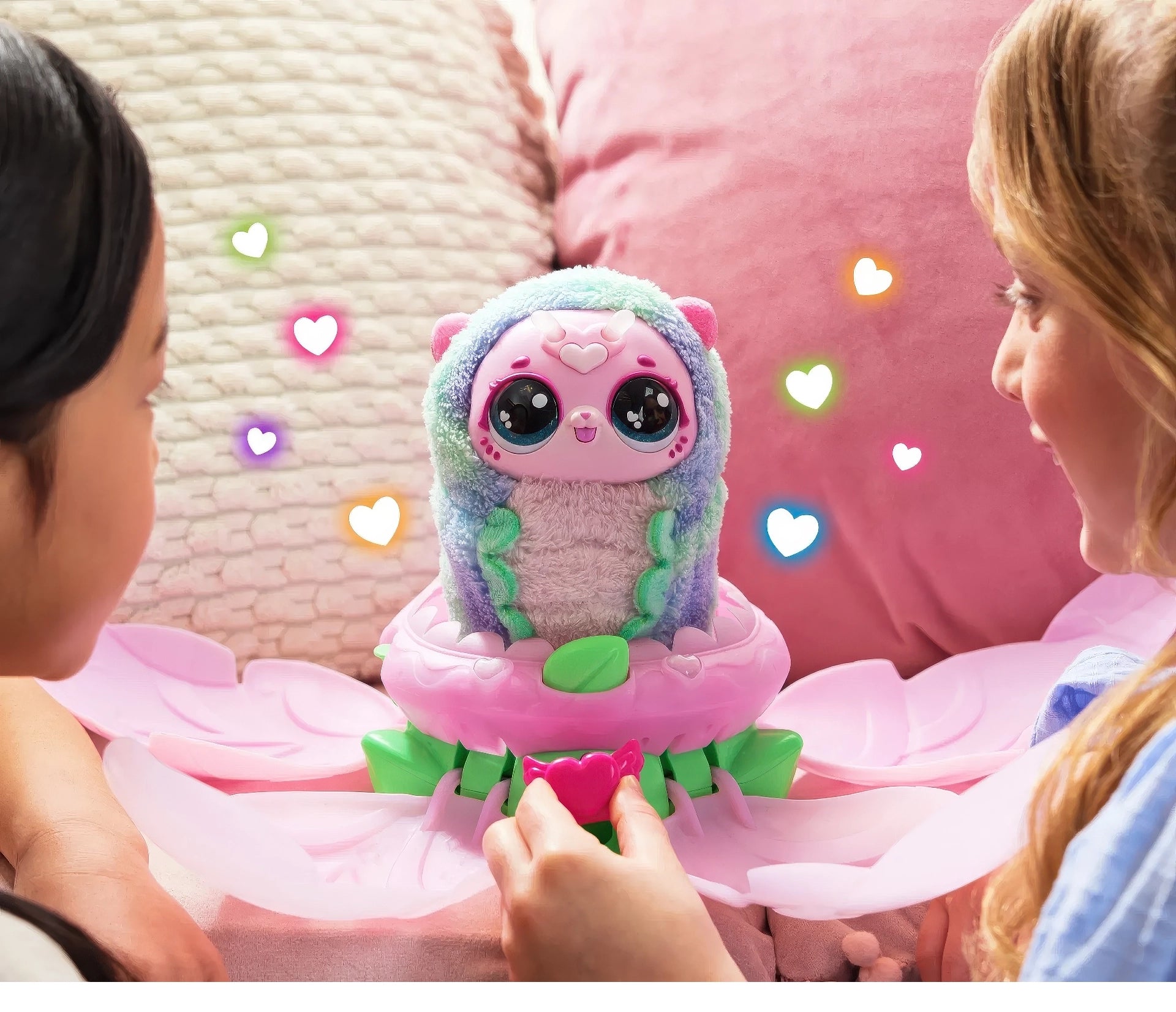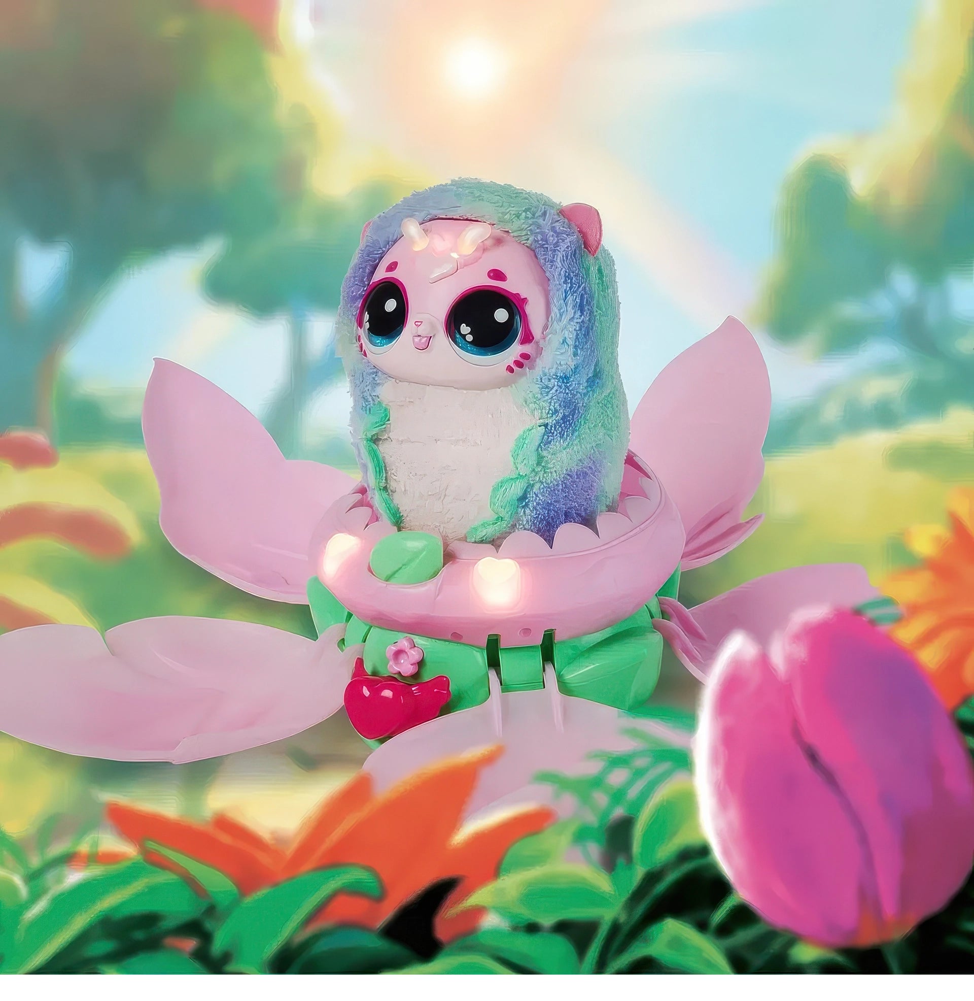 Shower the magic flower with love using the watering can accessory, until it glows with rainbow light and the petals bloom to reveal your adorable Hatchipillar! Use the leaf to feed your new plush pet, and explore unique interactive features as you cuddle and play. When her antenna glow with rainbow light, she's ready to transform. Just place her back inside the flower, and watch the musical light show begin!