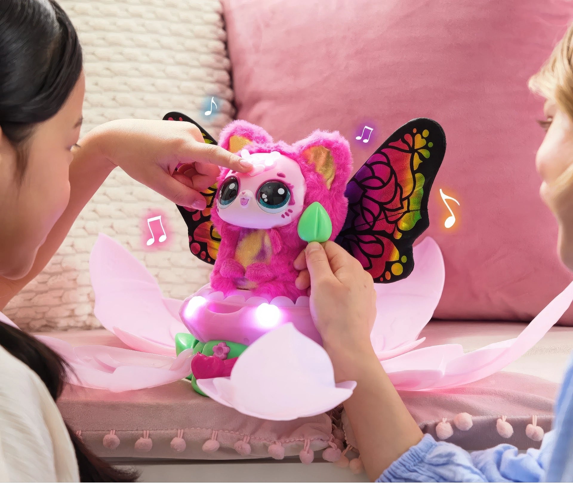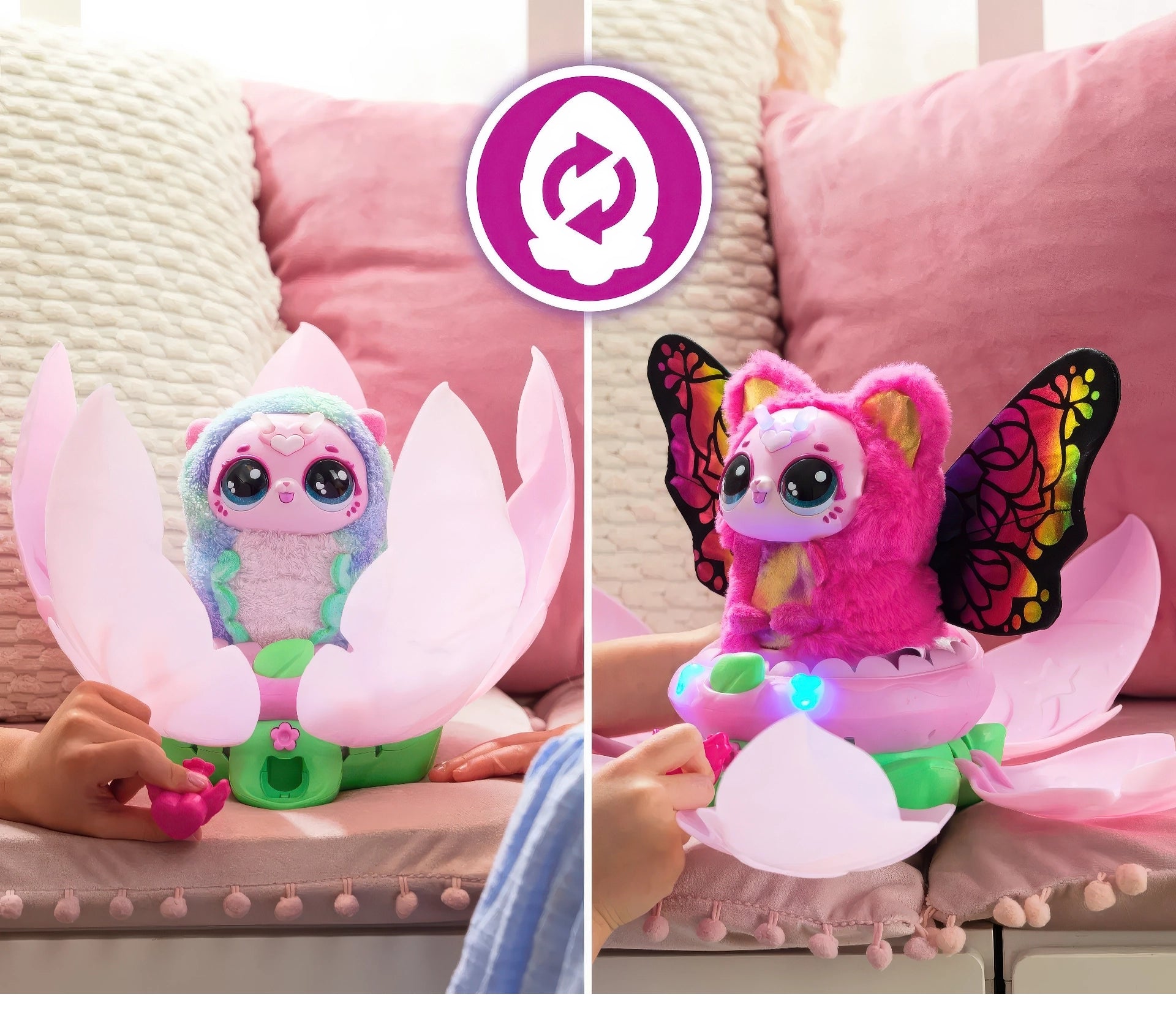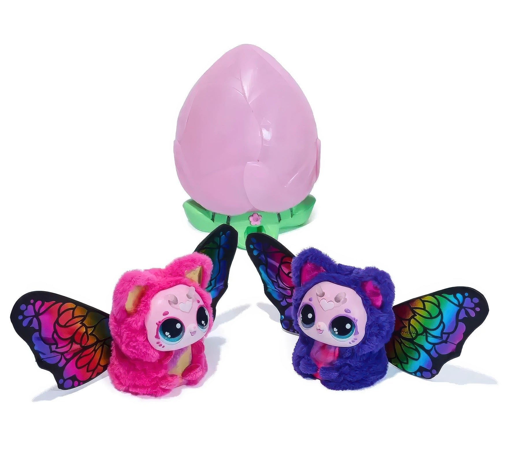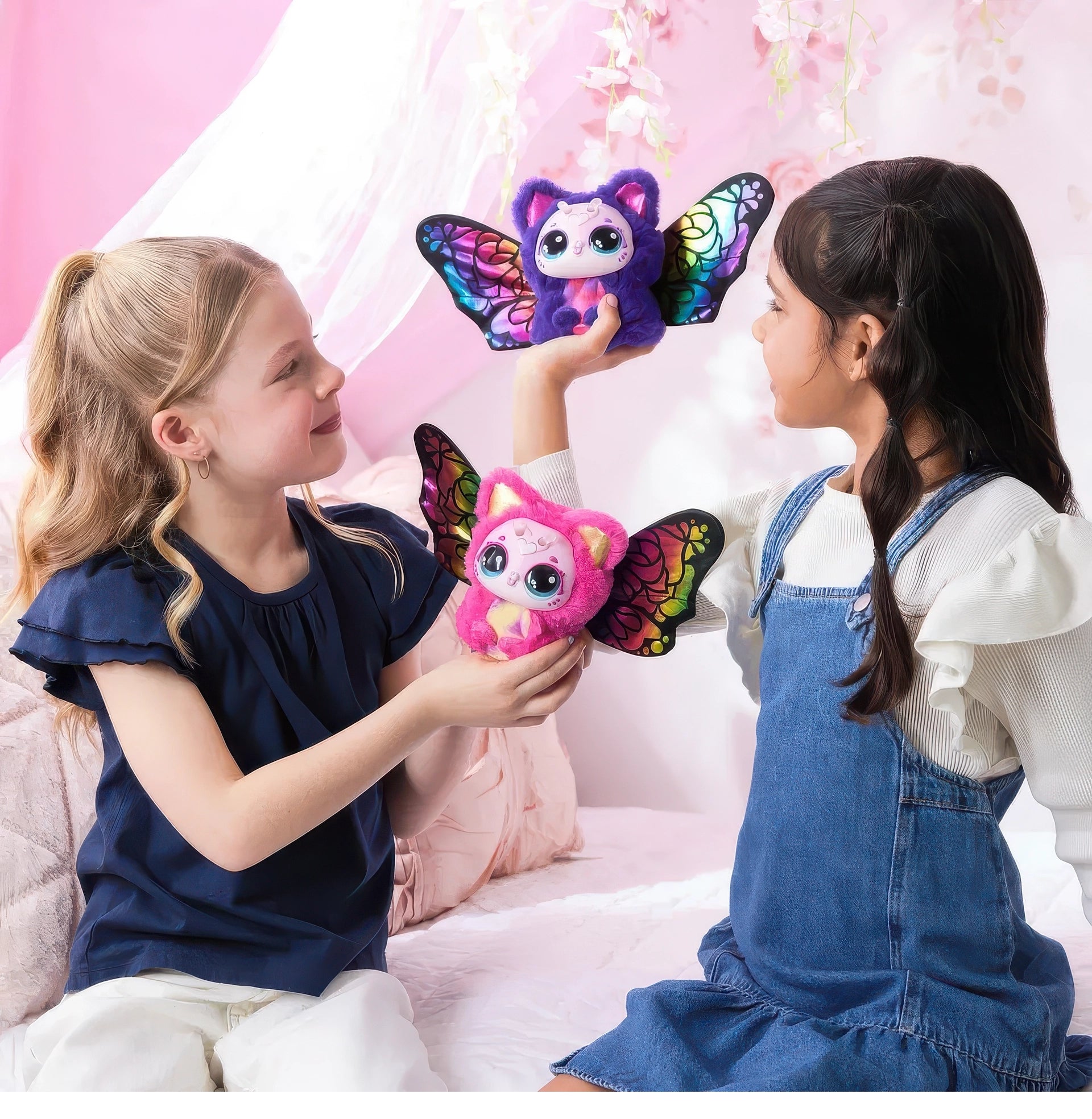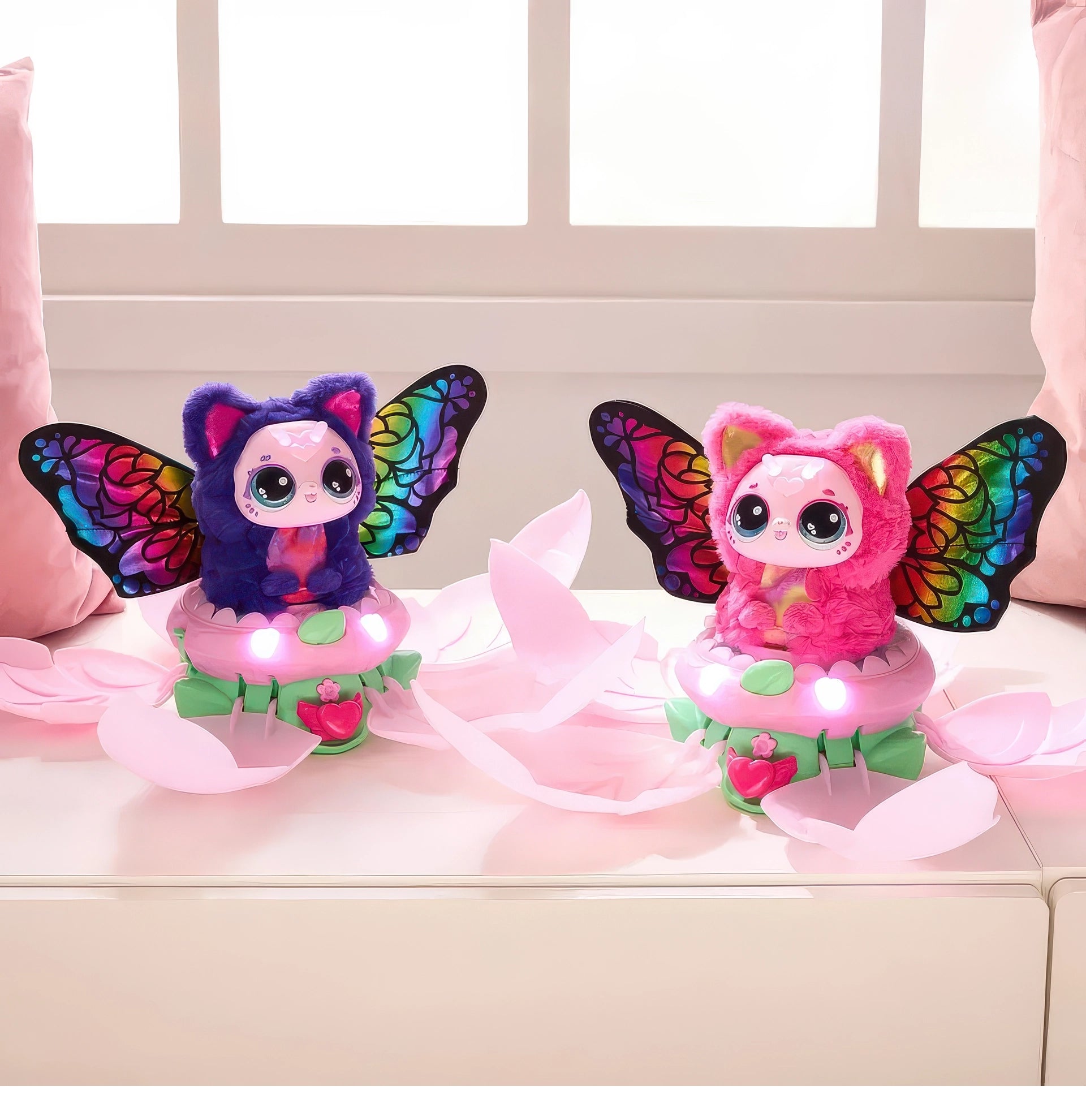 Will you discover Violet or Rosie? With 2 plush pet characters to unbox and collect, each Kittyfly has over 100 interactive play features to explore, with a repeatable blooming reveal for endless plush pet fun!