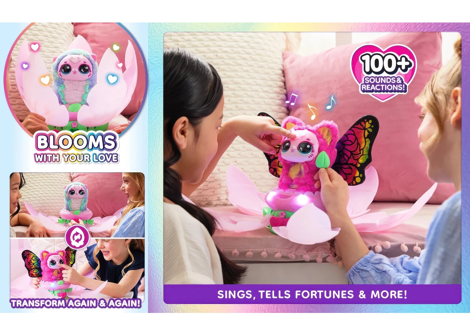 With exciting lights, your fluttery friend blooms again to reveal a transformed Kittyfly with rainbow wings. Tickle her, sing songs together, ask Kittyfly questions to reveal your tell fortunes and much more! You can repeat the magical reveal again and again for endless fantasy playtime fun.