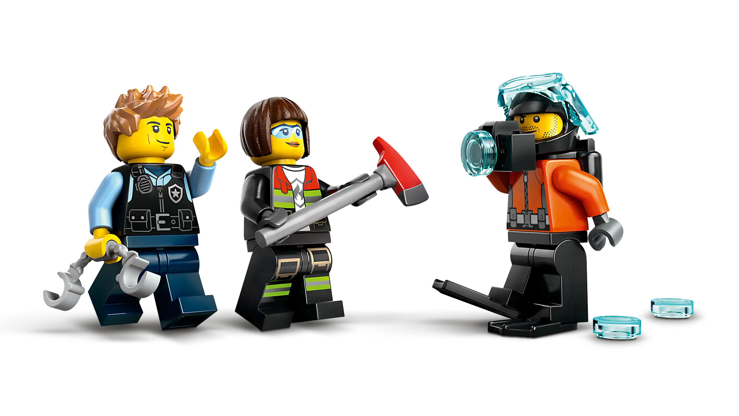 • What’s in the box? – Everything kids need to build a toy helicopter, submarine and fire truck, plus police officer, helmsman, and firefighter minifigures