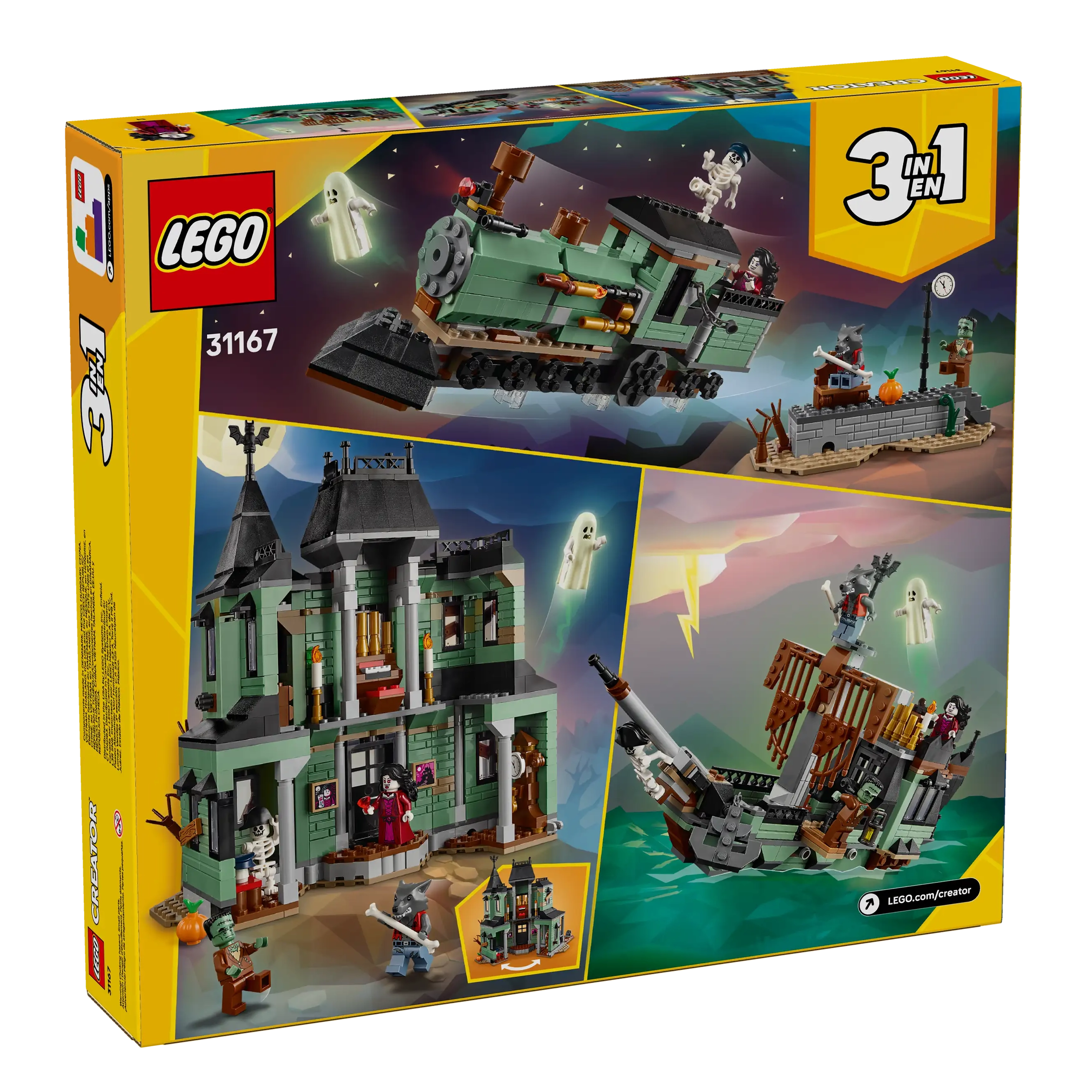Play out scary stories with the LEGO® Creator 3in1 Haunted Mansion (31167) house building toy. The 2-story haunted house is packed with cool details and features, including an opening front gate, a graveyard, a detachable scary tree, an organ, a hidden ghost revealed by turning a wheel, and an opening back for more play value.