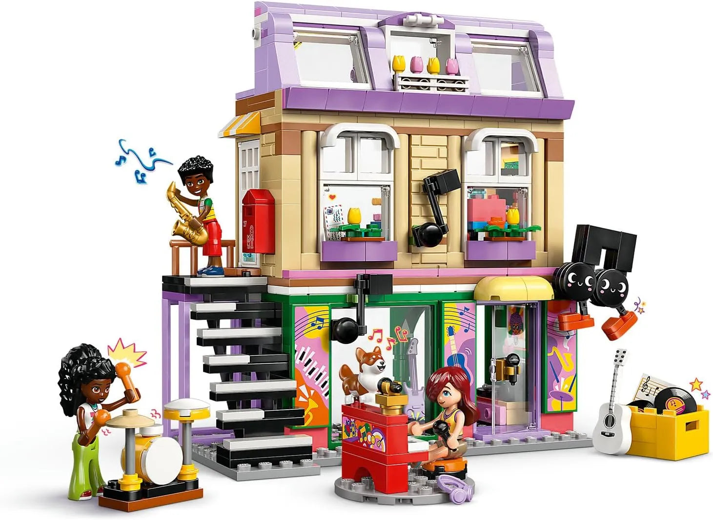 • 3 LEGO® Friends characters and corgi figure – This set is packed with personality and comes with Paisley, Zac and Elsa D mini-dolls, a corgi figure, musical note mascot, piano-key staircase and more