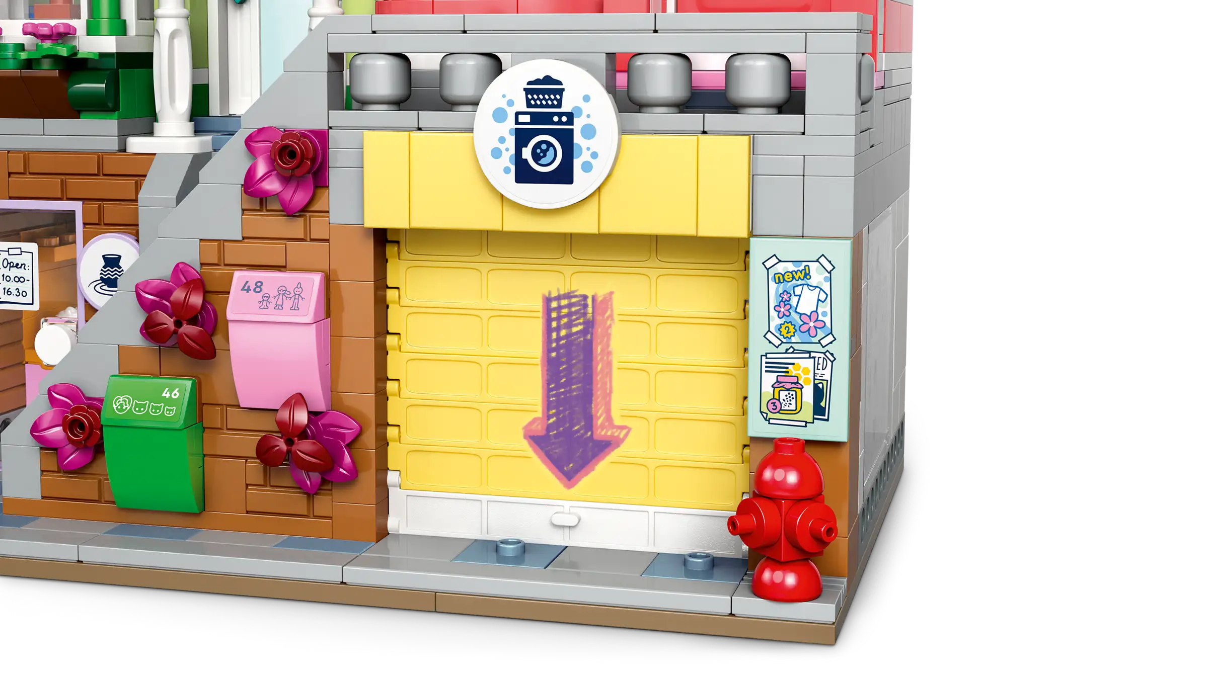 • Explore the stores – The community scene includes a bakery, a ceramics studio with a spinning pottery wheel and a launderette with a rolling door and 2 spinning washing machines
