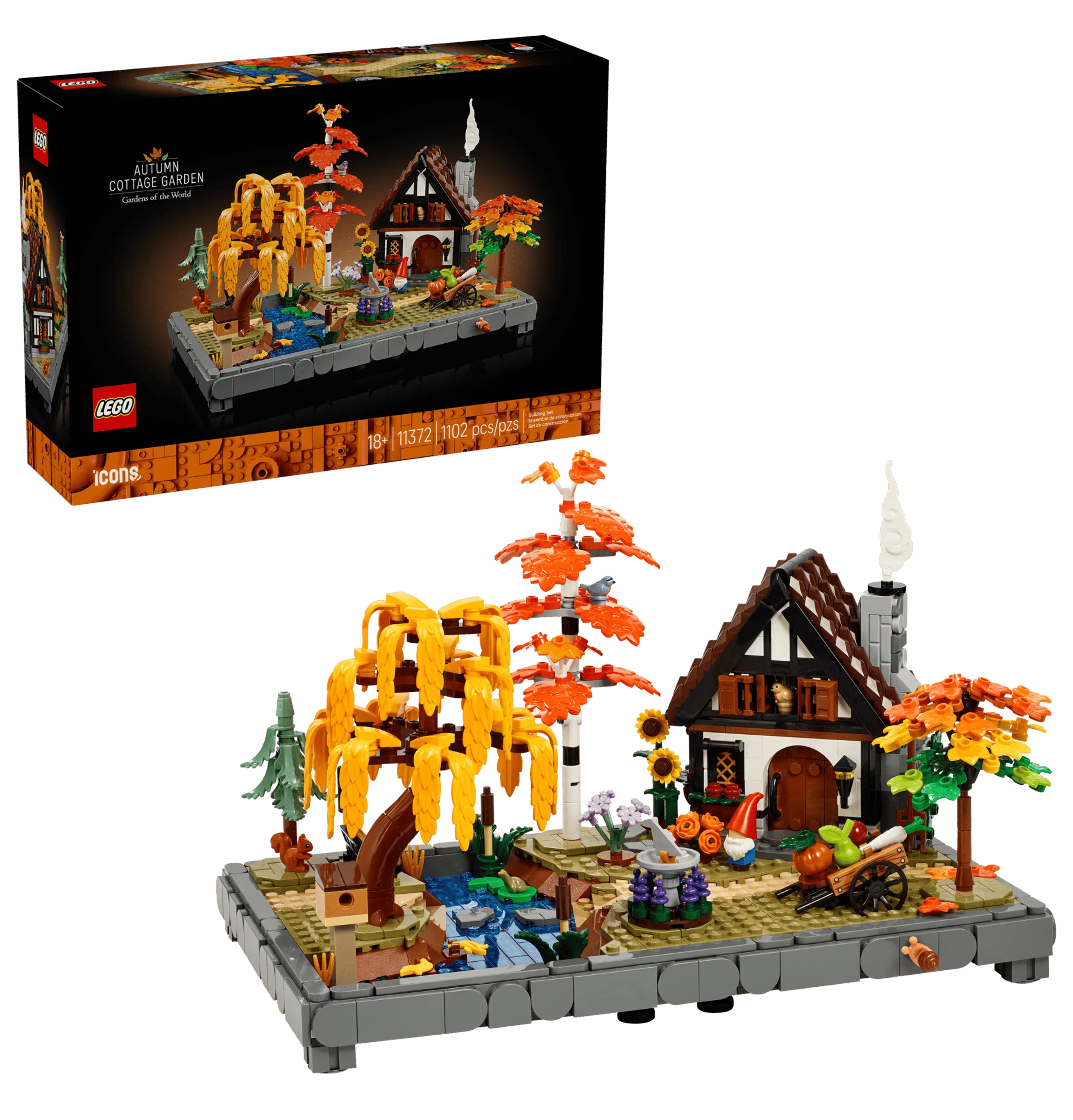 • DIMENSIONS – The 1,102-piece LEGO® Icons Autumn Cottage Garden model measures over 19 cm (7.5 in.) high, 29 cm (11.5 in.) wide and 18 cm (7 in.) deep