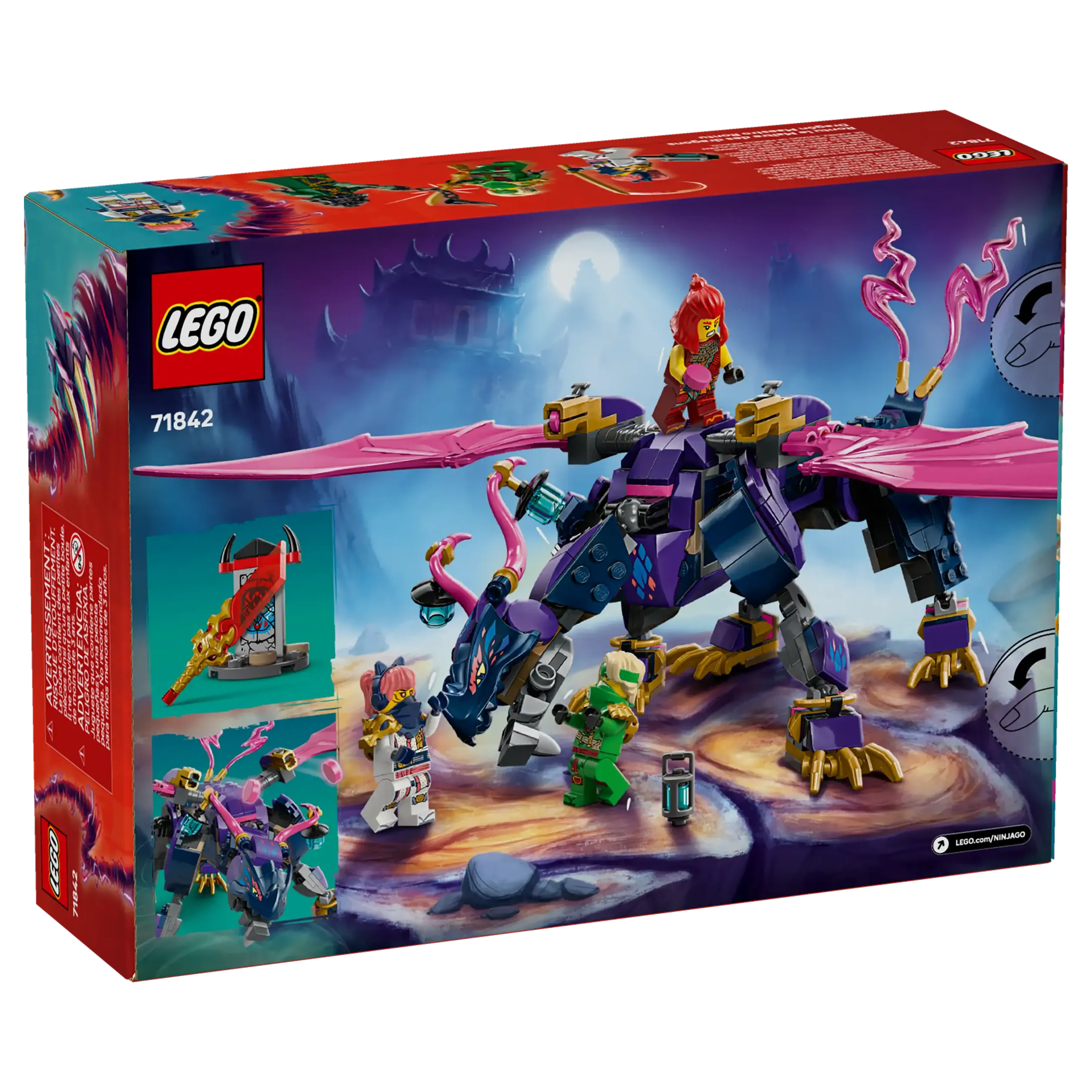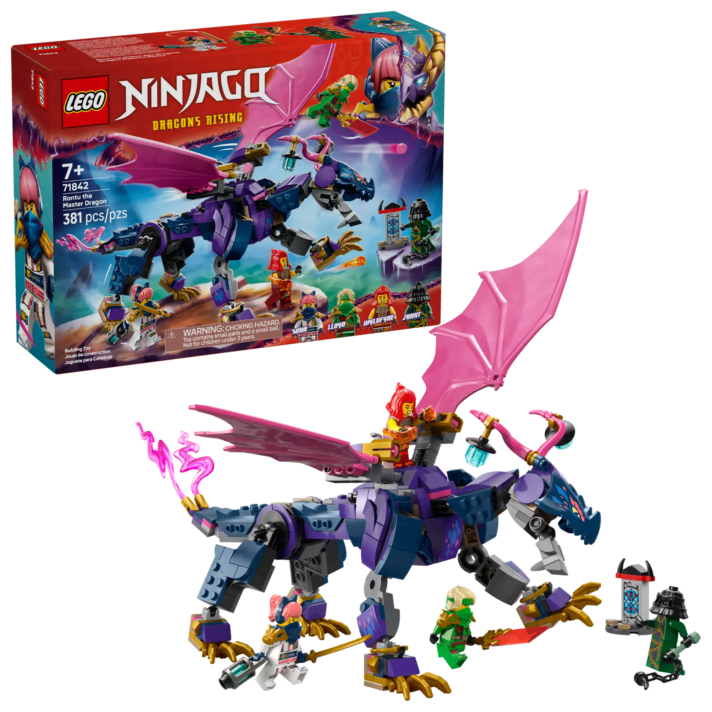 LEGO® NINJAGO® Rontu the Master Dragon (71842) toy lets ninja fans aged 7 and up recreate action-packed scenes from season 3 of the NINJAGO Dragons Rising TV show. This building set for kids features a dragon toy with a posable tail, legs, wings, head and jaw, 2 positions to place a minifigure on its back and a stud shooter under each wing.