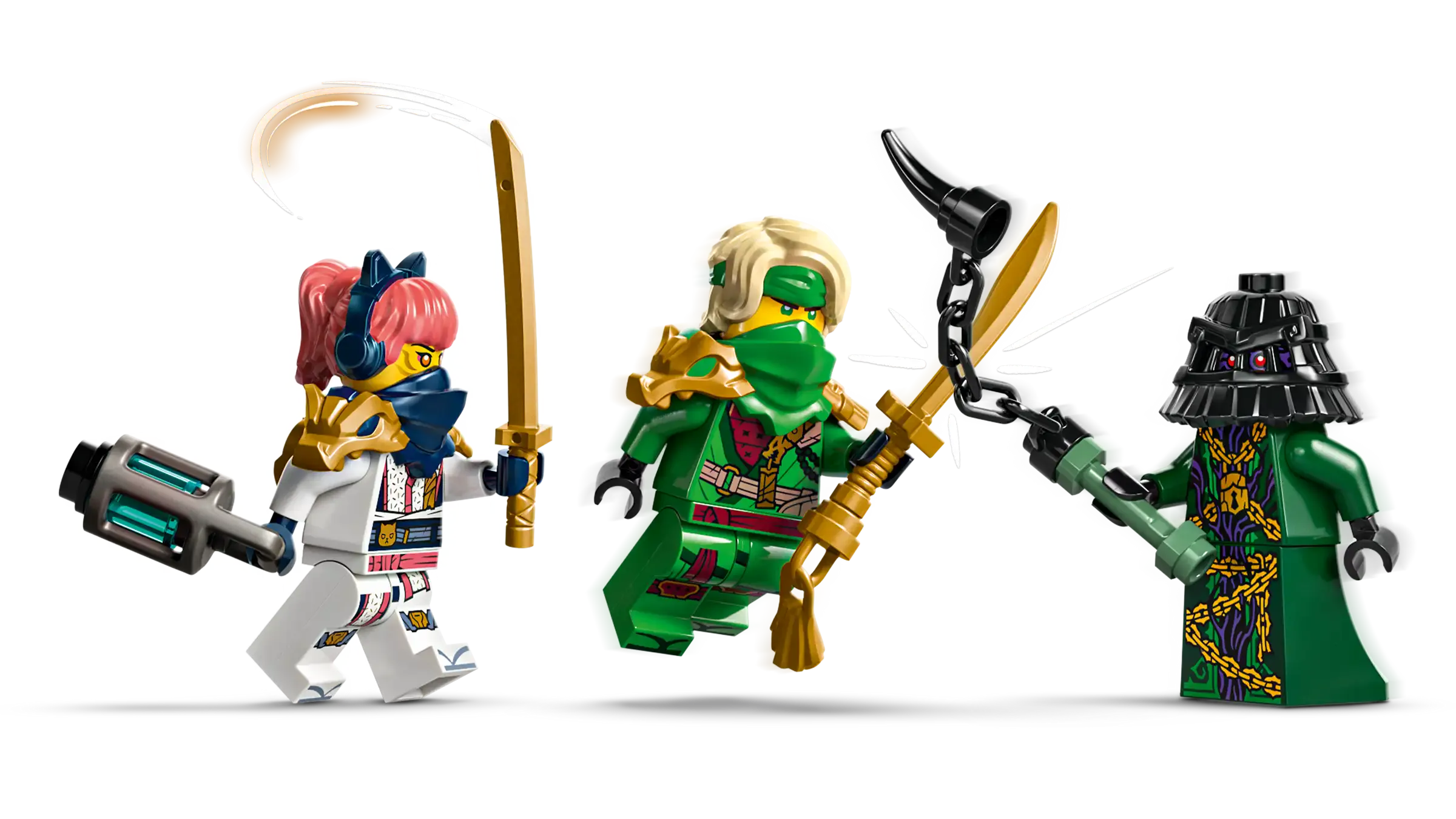 4 NINJAGO minifigures are included in the LEGO playset: ninja warriors Lloyd, Sora and Wyldfyre, each with a ninja weapon accessory, plus Master of Misfortune, Zarkt, for kids to play out epic good vs. evil battles. There is also a brick-built mini shrine with a secret message that Lloyd reveals with his translucent reveal blade accessory.
