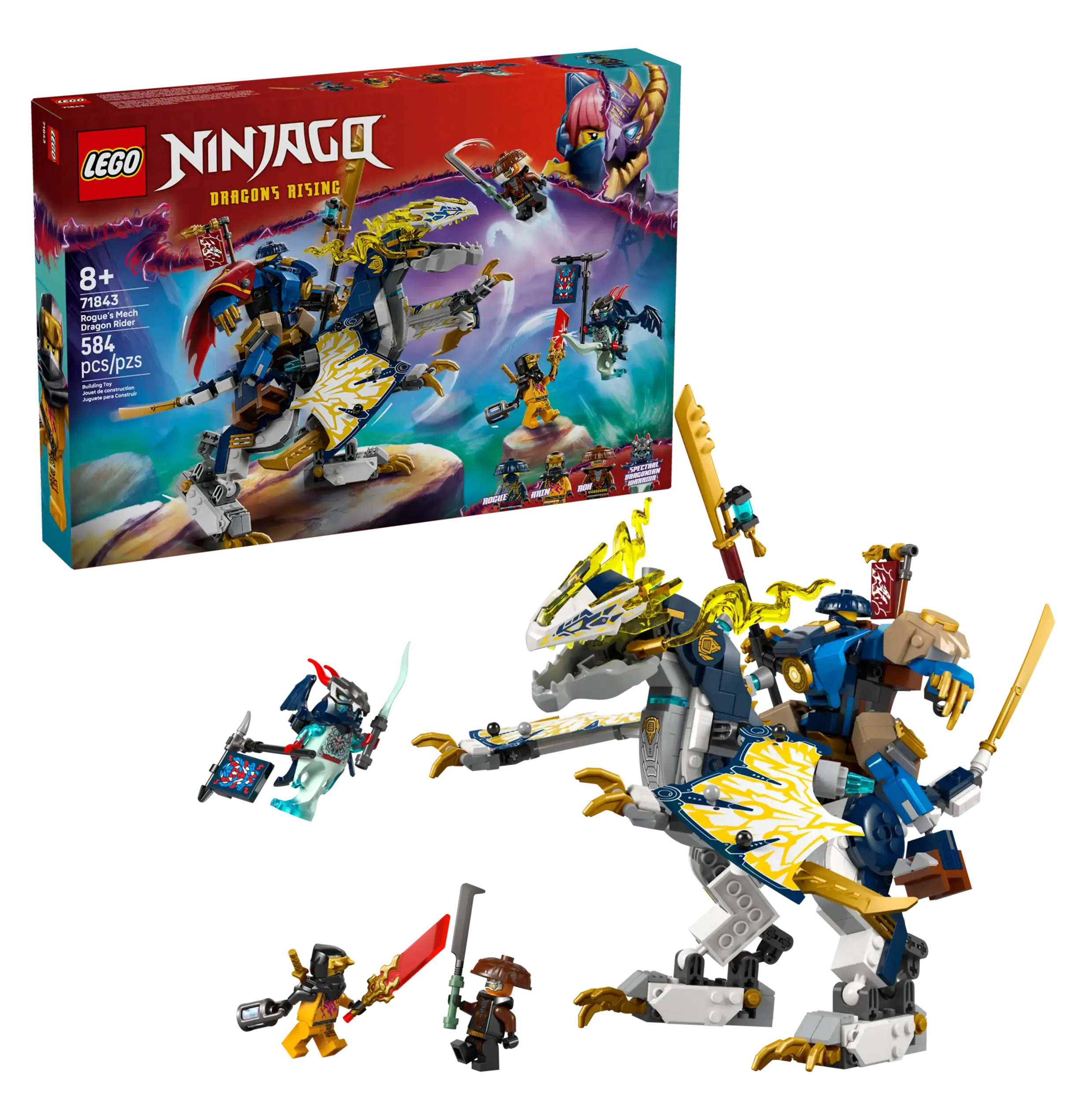 Rogue’s Mech Dragon Rider (71843) combo ninja toy lets boys and girls aged 8 plus enact tales from season 3 of the NINJAGO® Dragons Rising TV show. Kids can separately play with a mech toy and the first-ever NINJAGO robot dragon toy before combining them into the awesome Rogue’s Mech Dragon Rider.