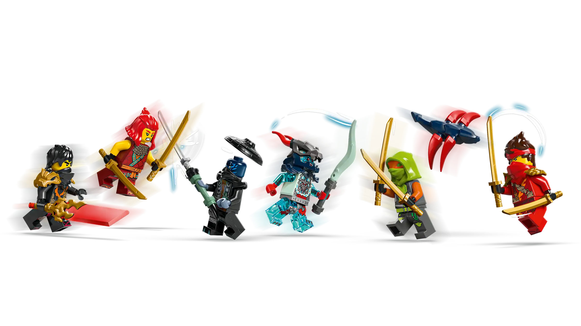 This LEGO® vehicle playset features 6 minifigures: Kai, Wyldfyre and, for the first time, Frak, each with 2 golden katana sword accessories, Cole with a translucent reveal blade accessory and Nokt and a Spectral Dragonian Scout, who each have a sword accessory, plus a glider vehicle toy and a critter model. The villainous duo also have a banner with a secret message that can only be revealed by Cole’s translucent reveal blade.
