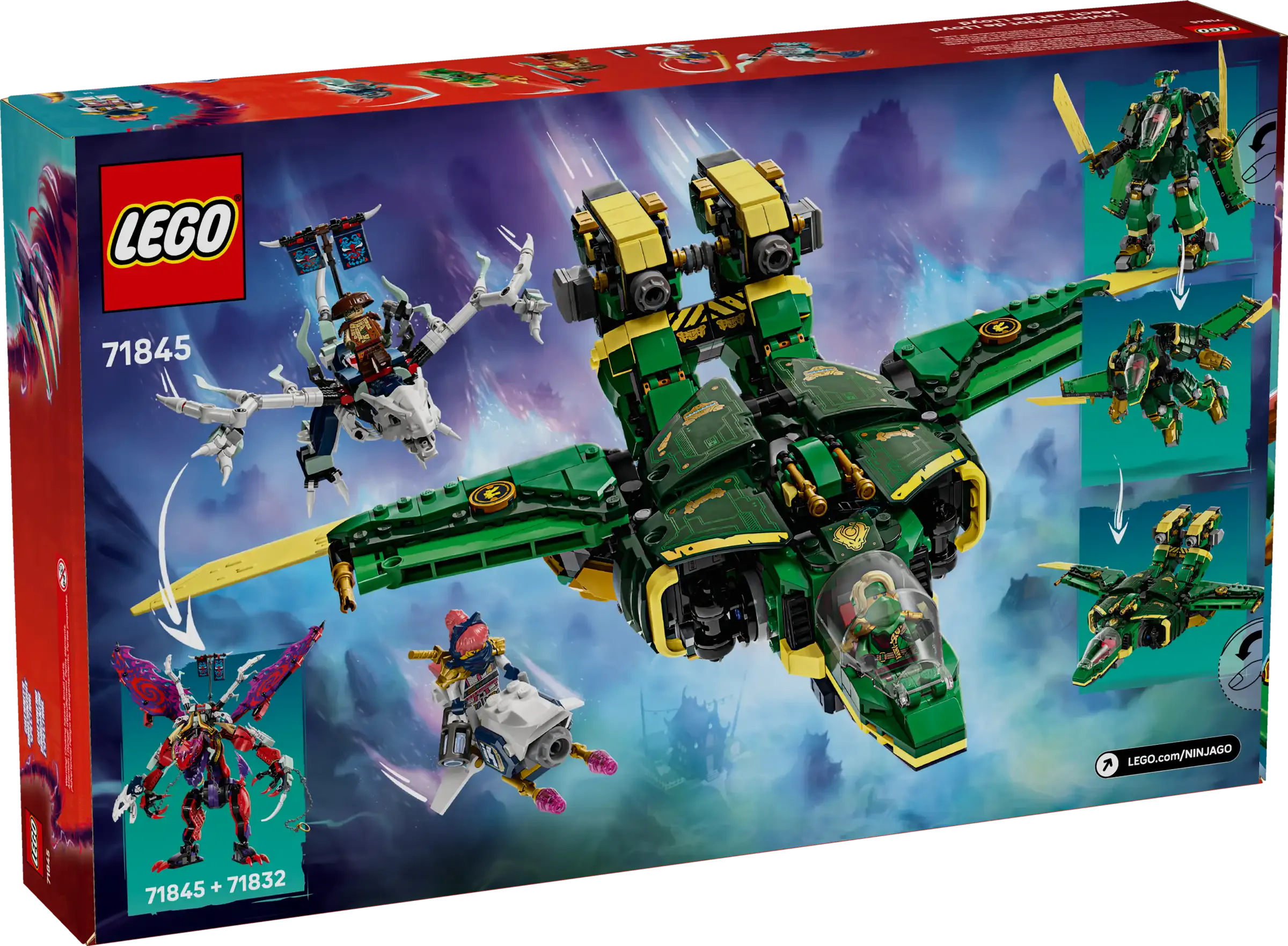 This adventure toy battle set features 5 minifigures: Sora and Lloyd armed with ninja weapon accessories to take on the villainous trio of Kur, Tyr and a Spectral Dragonian Warrior, who have a banner containing a secret message that can only be read using by Lloyd’s translucent reveal blade. Sora has a flying motorbike toy to ride, while the villains have a posable specter dragon toy, which can be combined with parts from the Thunderfang Dragon of Chaos (71832) playset (sold separately). Set contains 1,112 pieces.