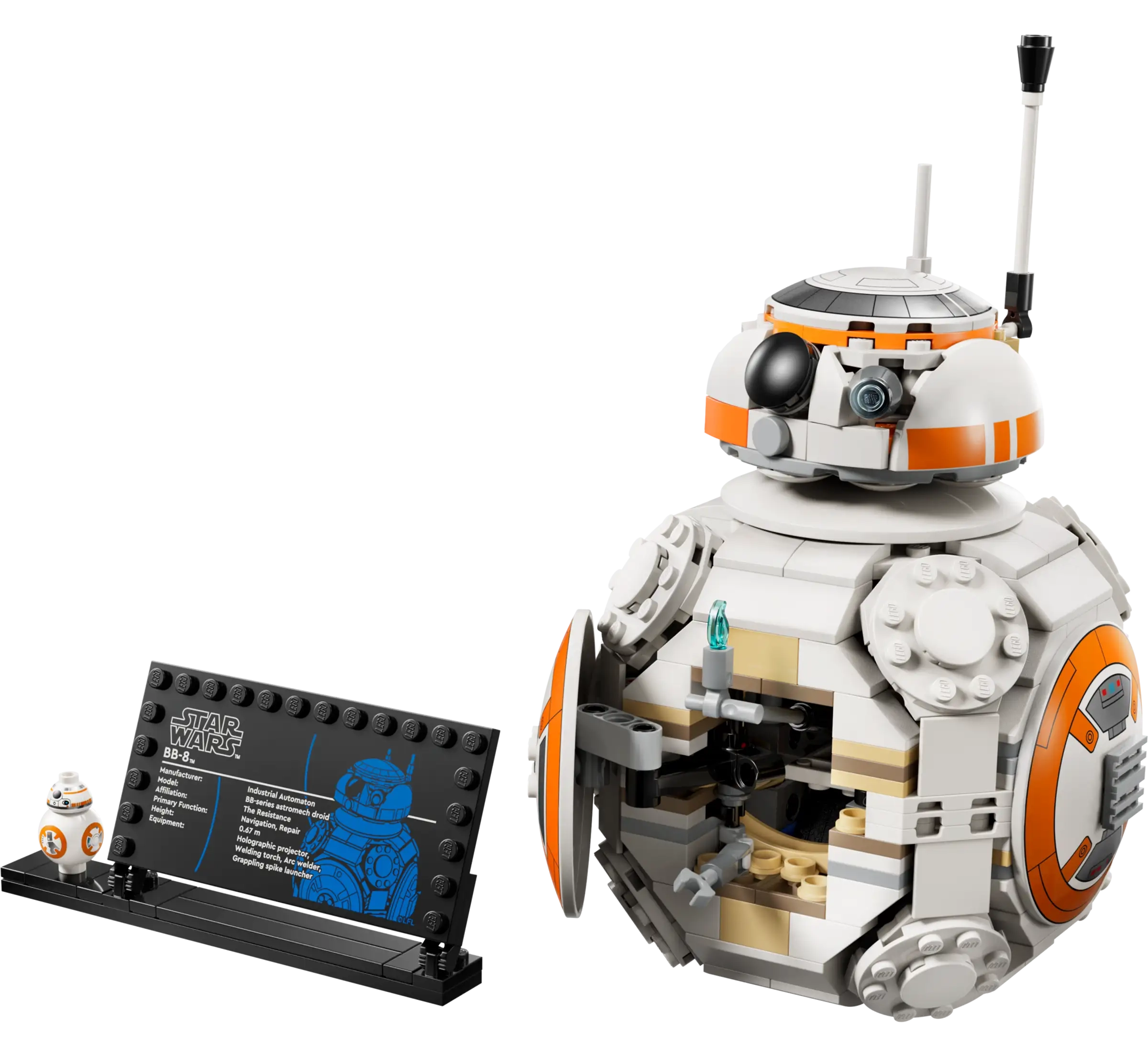 • BB-8 LEGO® FIGURE – Display the main buildable toy model with the BB-8 info plaque and standard-sized BB-8 LEGO figure