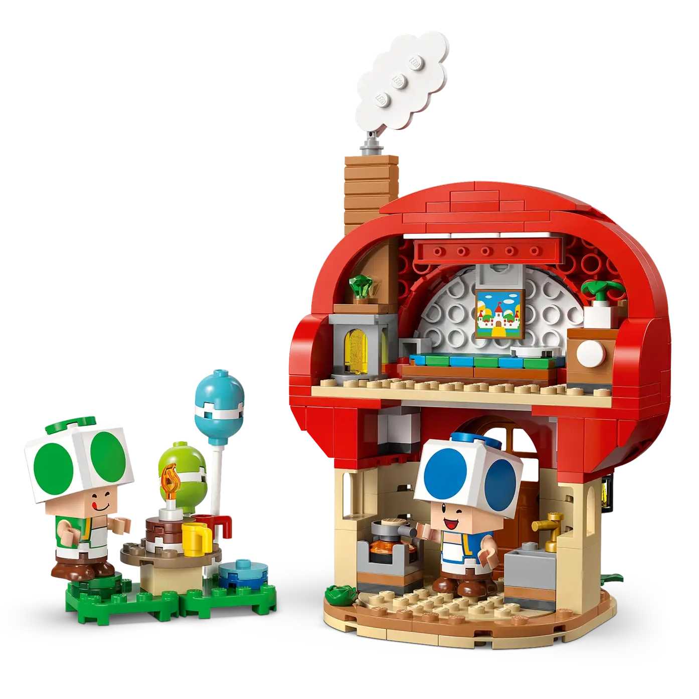 • Party time – The Toad House has a kitchen and bedroom (with a Peach’s Castle painting) and removable furniture for easy play, and the set also includes a picnic table, gramophone, and party accessories