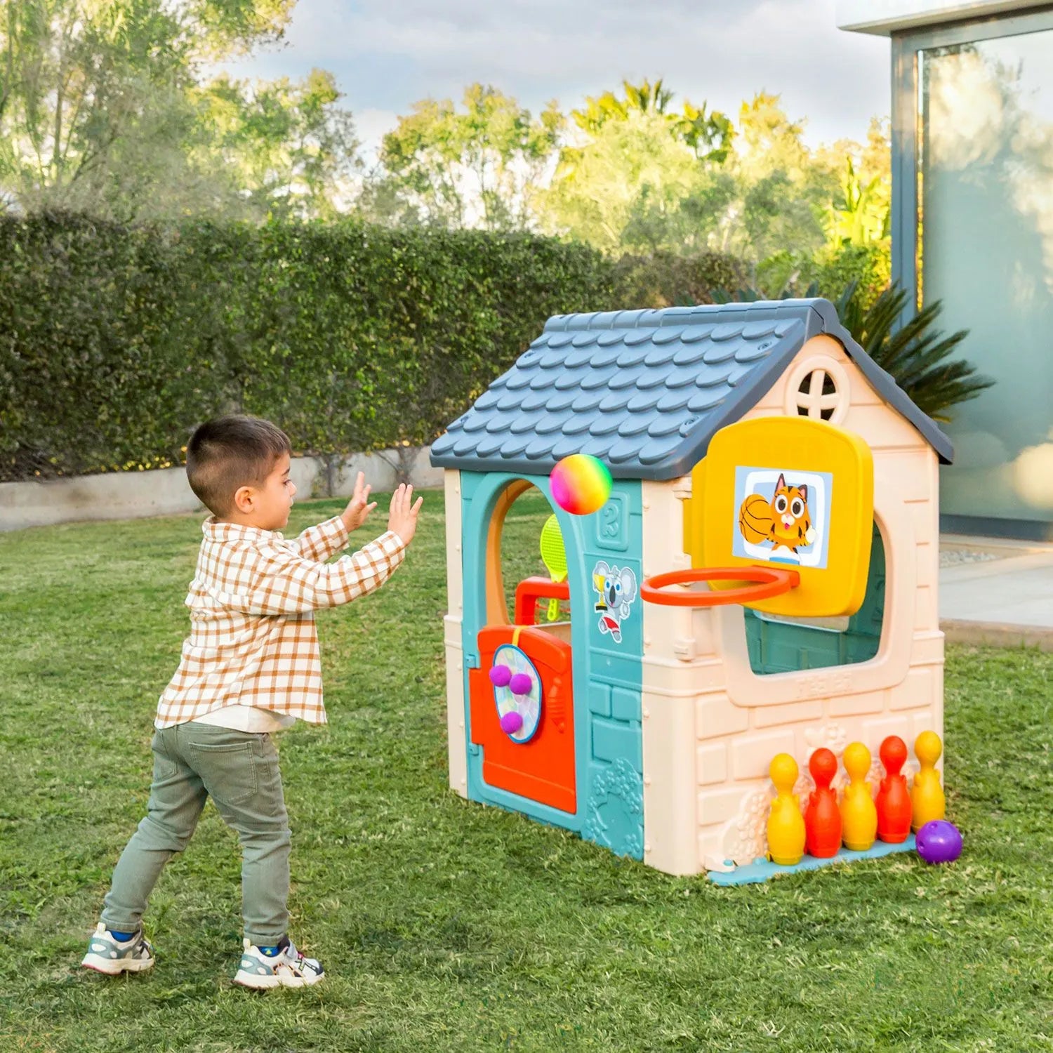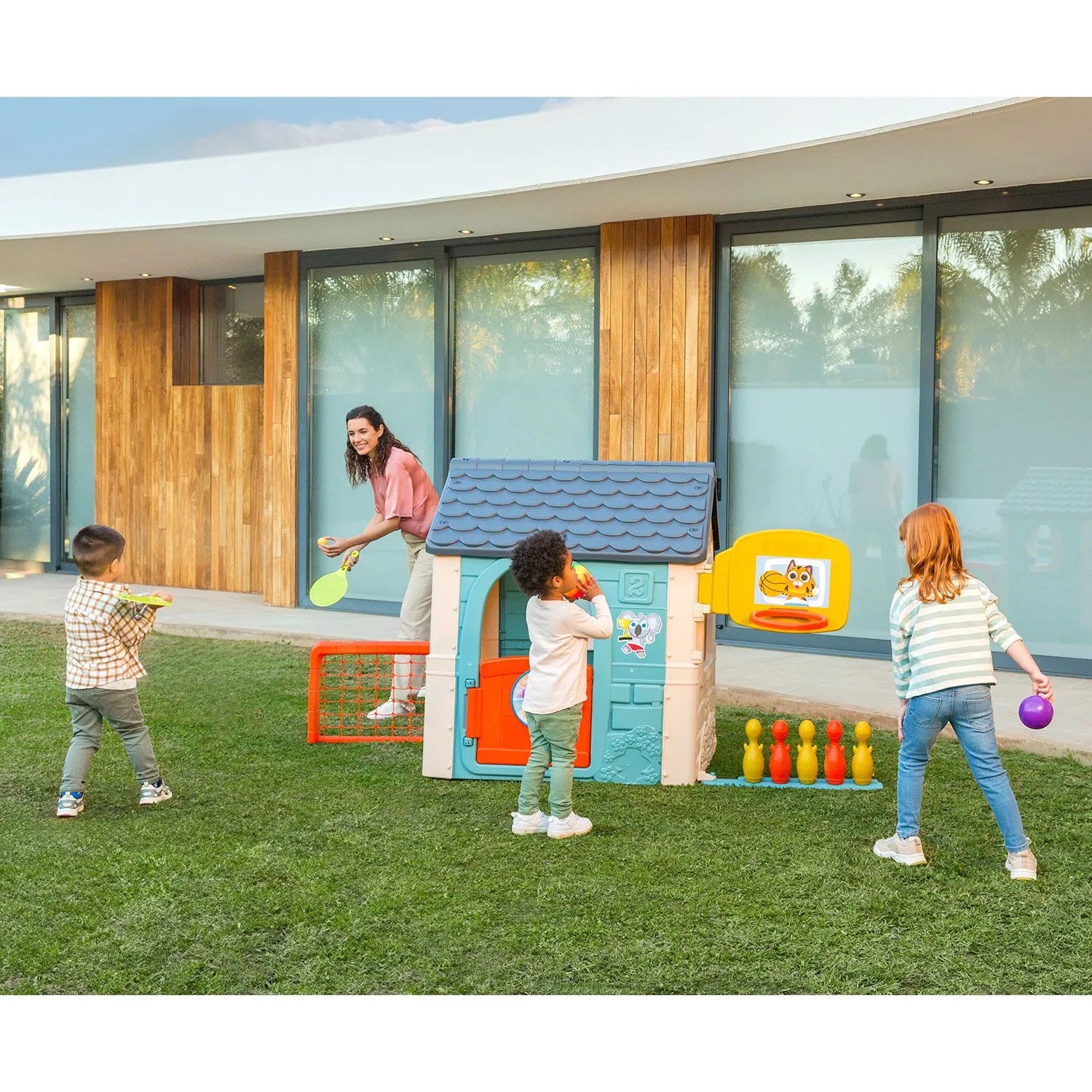 Playhouse with 6 super fun play activities: (1) bowling, (2) racket games, (3) football, (4) basketball with an adjustable basket, (5) dartboard with Velcro balls and (6) role-playing games with the house itself.