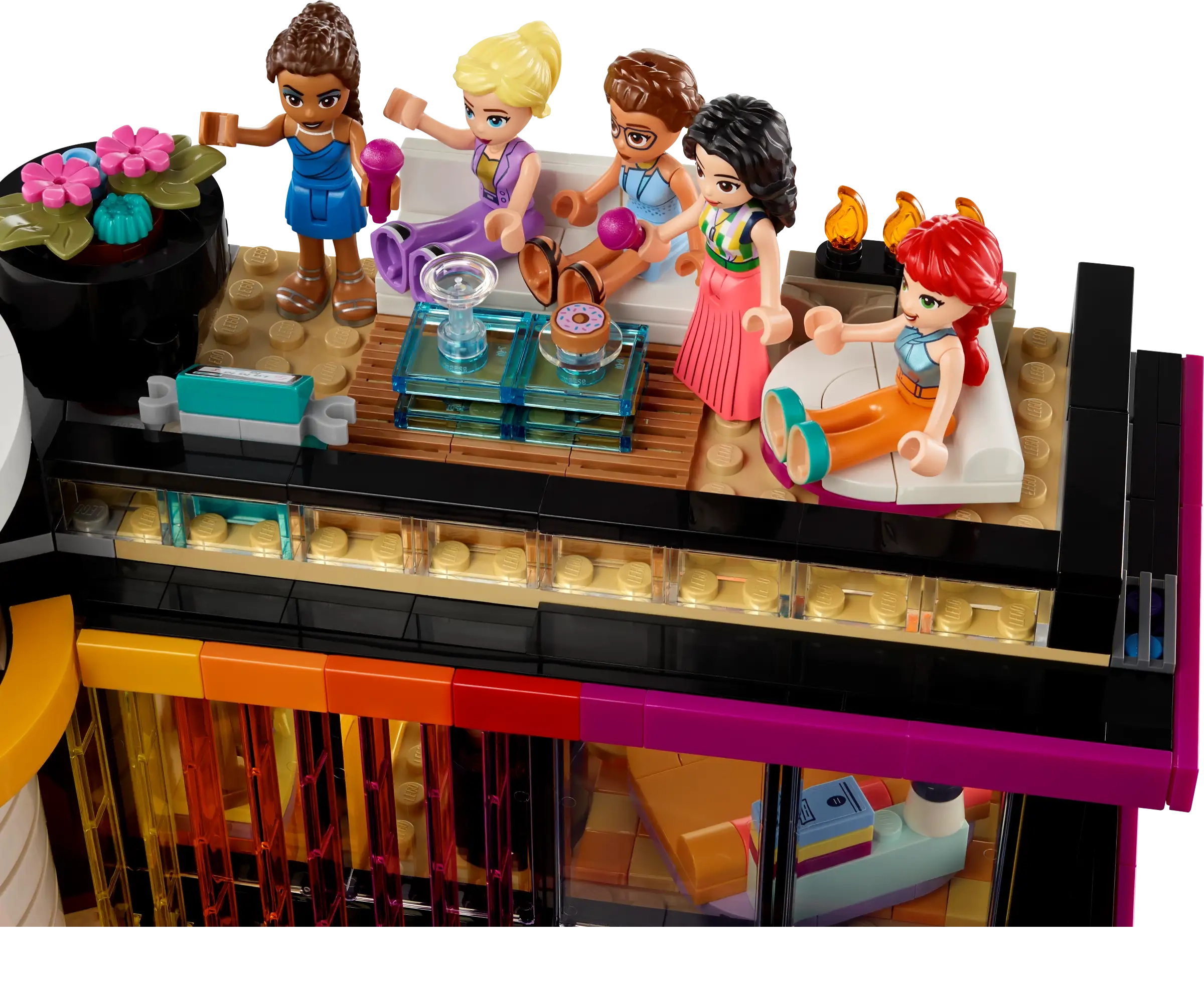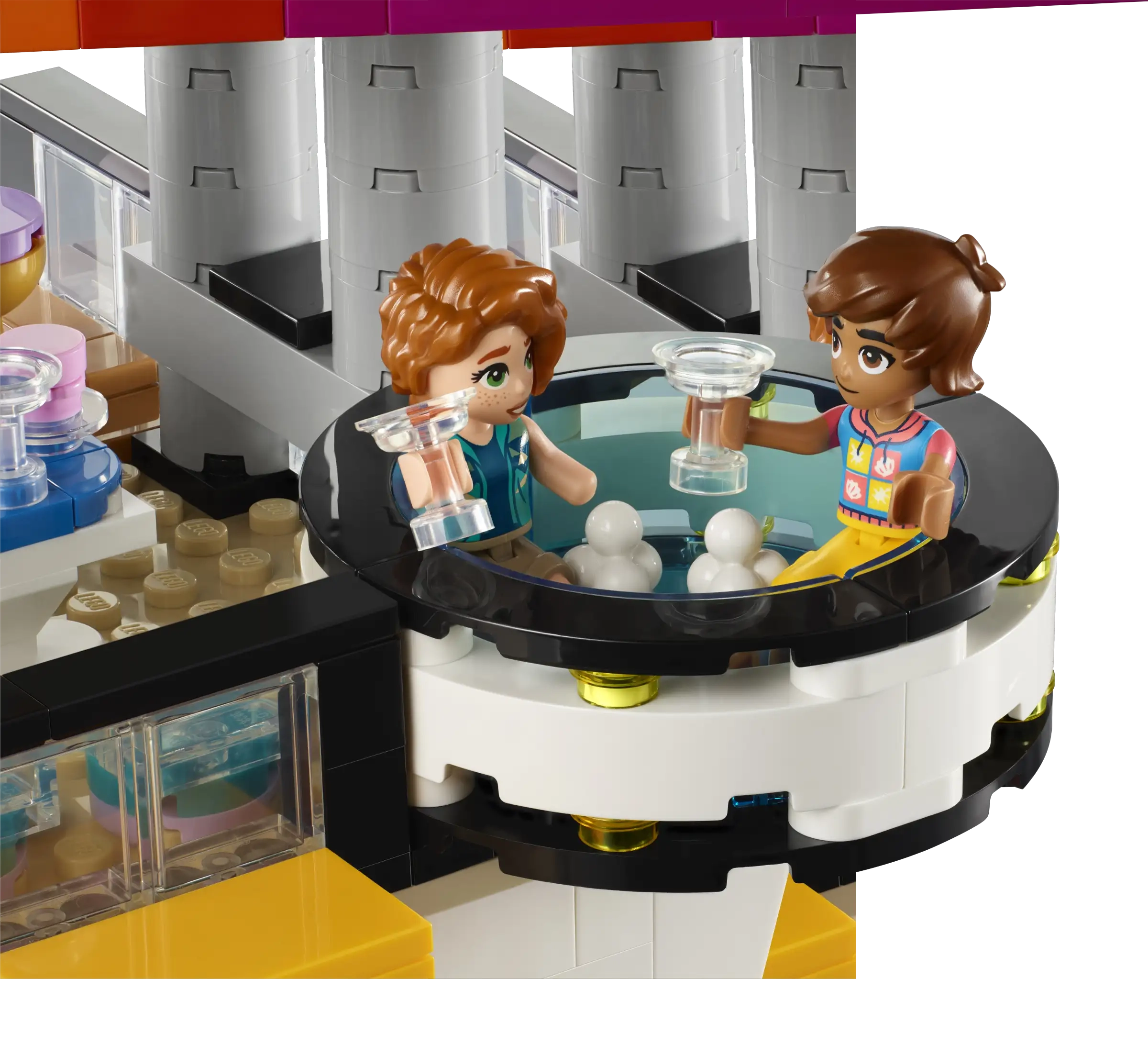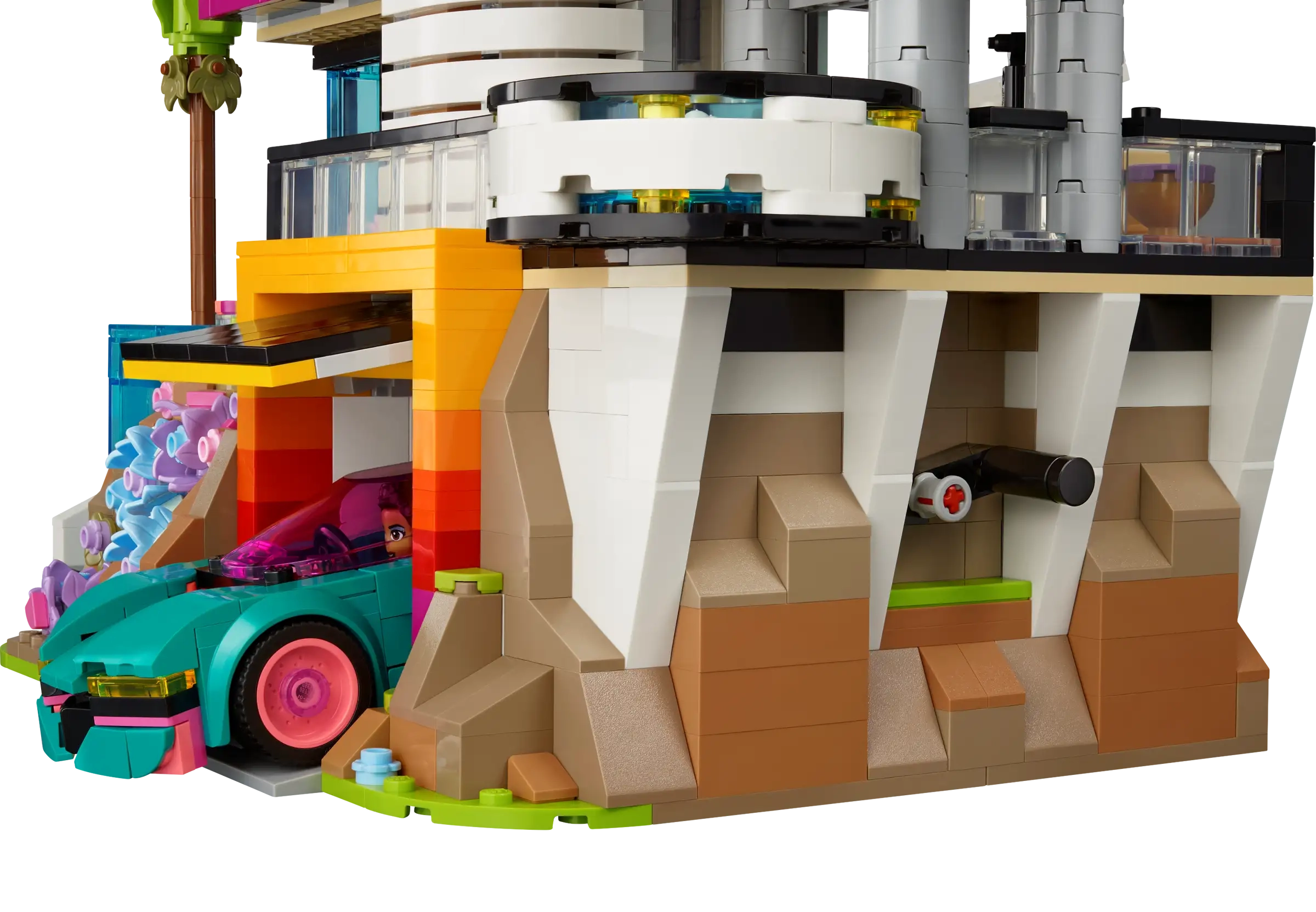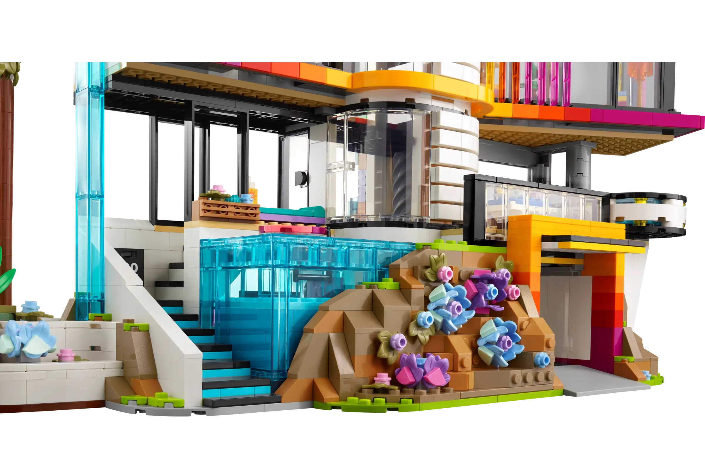 • Outdoor party zones – This four-story home is where LEGO® Friends character Andrea hosts parties for her friends and comes with a pool, hot tub, dining area, yoga, and music spaces and a waterfall