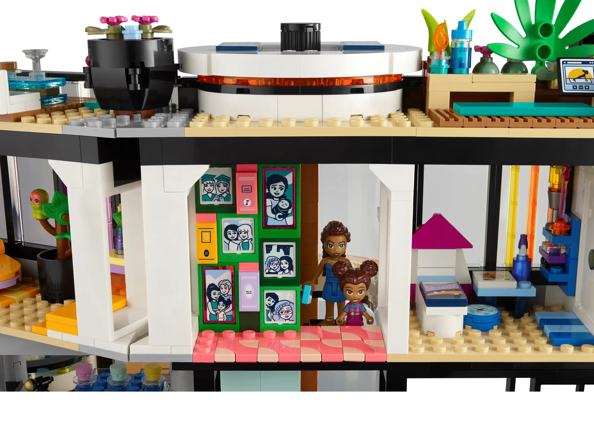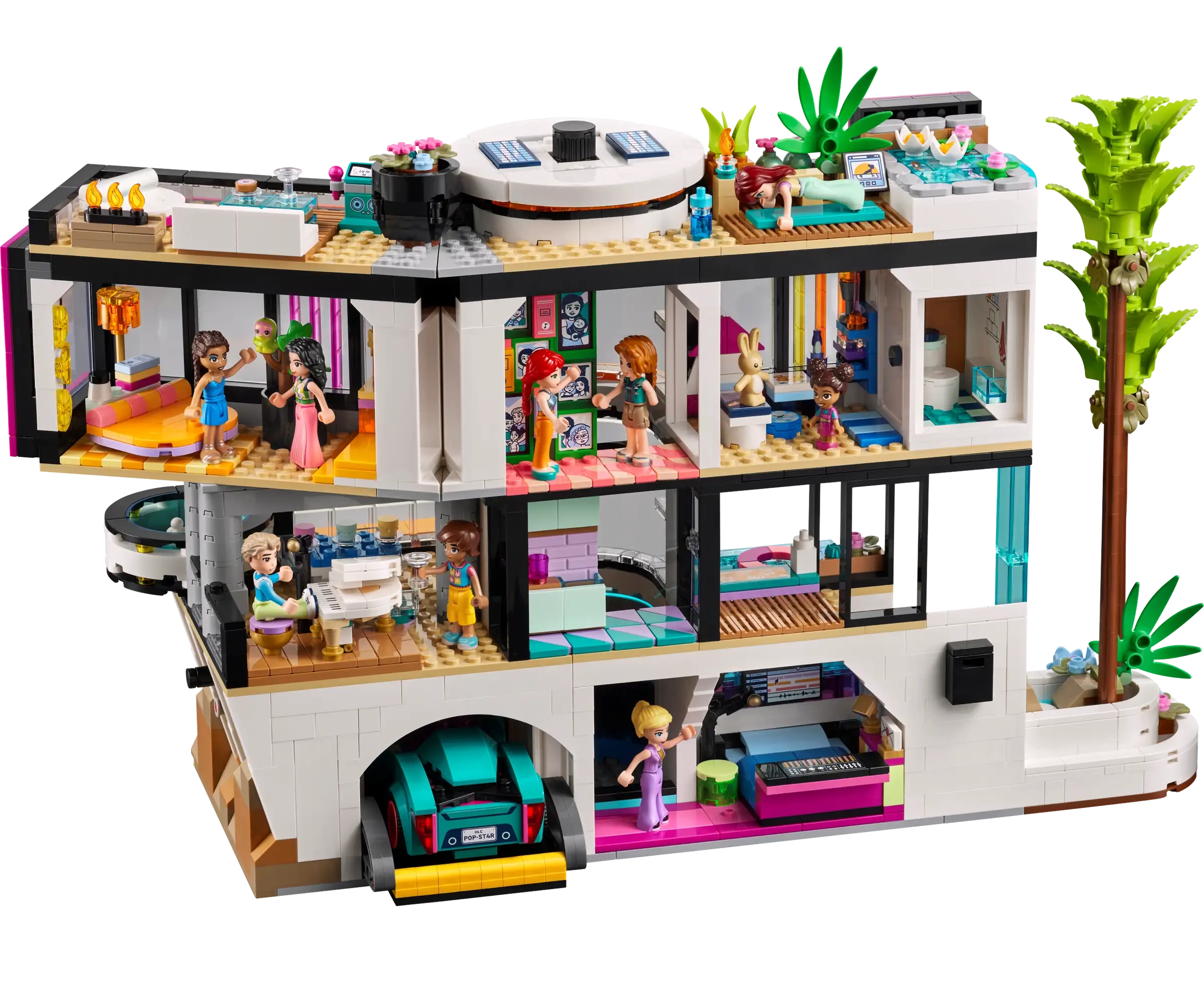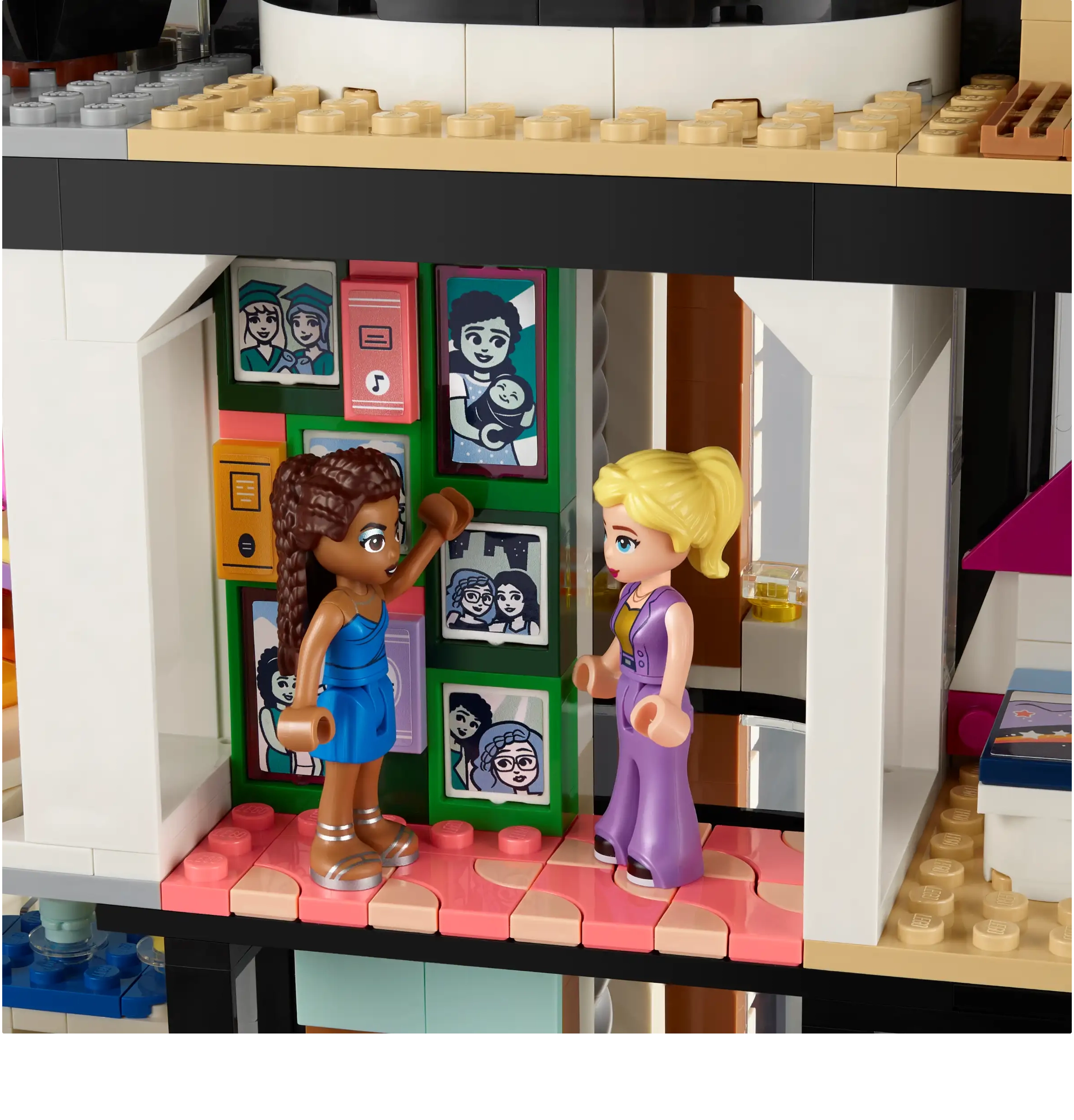 • Outdoor party zones – This four-story home is where LEGO® Friends character Andrea hosts parties for her friends and comes with a pool, hot tub, dining area, yoga, and music spaces and a waterfall