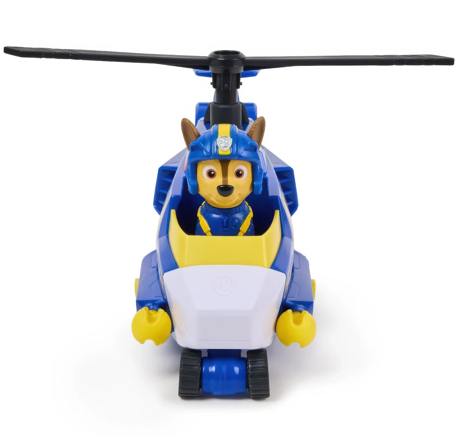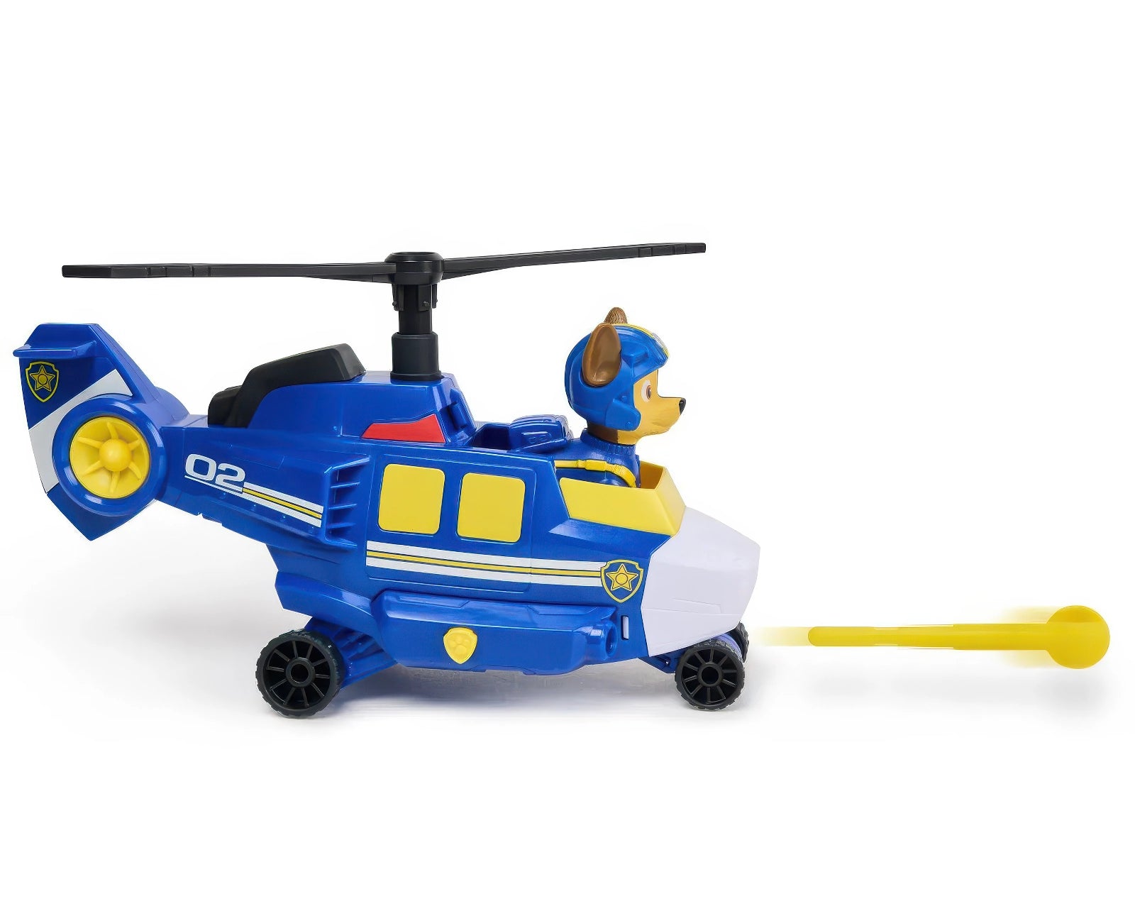 • HELICOPTER RESCUE VEHICLE: Clip Chase into position & spin the propellers, as you take to the air on your mission, then push the paw badge on the cannon to launch your projectiles & save the day!