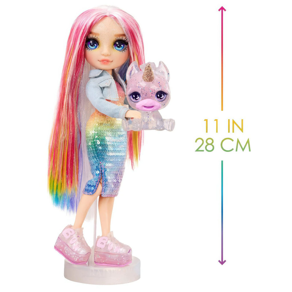 • Contents: 1x Rainbow High Classic Rainbow Doll, 1x handbag, 1x magical pet with a horn, 1x packet of slime and 1x packet of shimmer