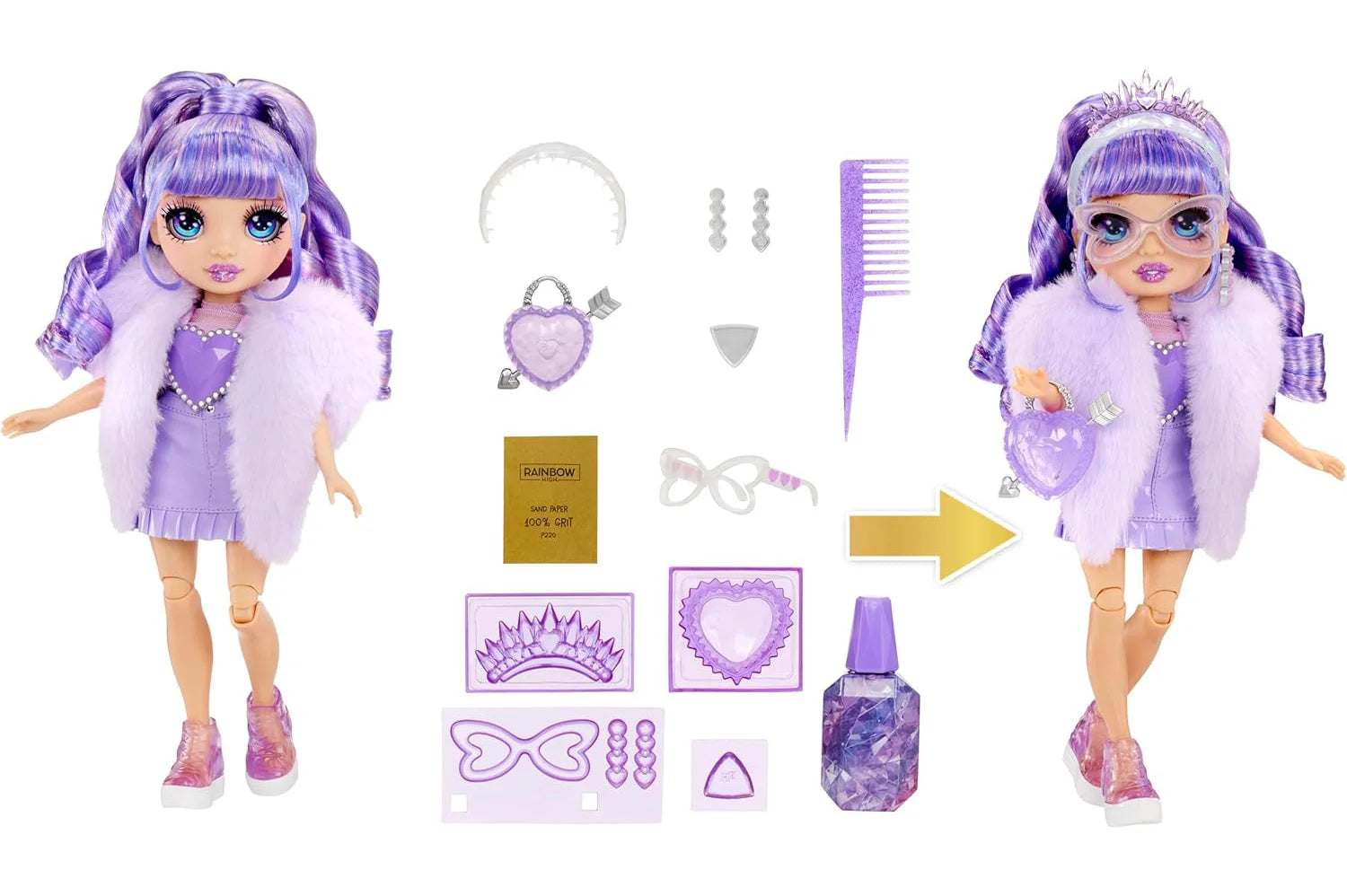 The Rainbow High Creative Crystals Fashion Doll Violet comes with everything you need to make 5 DIY crystal fashion accessories! Make sunglasses, earrings, a purse and a headband crystal accessory for your doll. And make a crystal ring for you! Violet is dressed in her signature purple from head to toe with lots of sparkles. This articulated doll has gorgeous, detailed features in her fashion, beautiful long purple hair, long eyelashes and glass eyes.