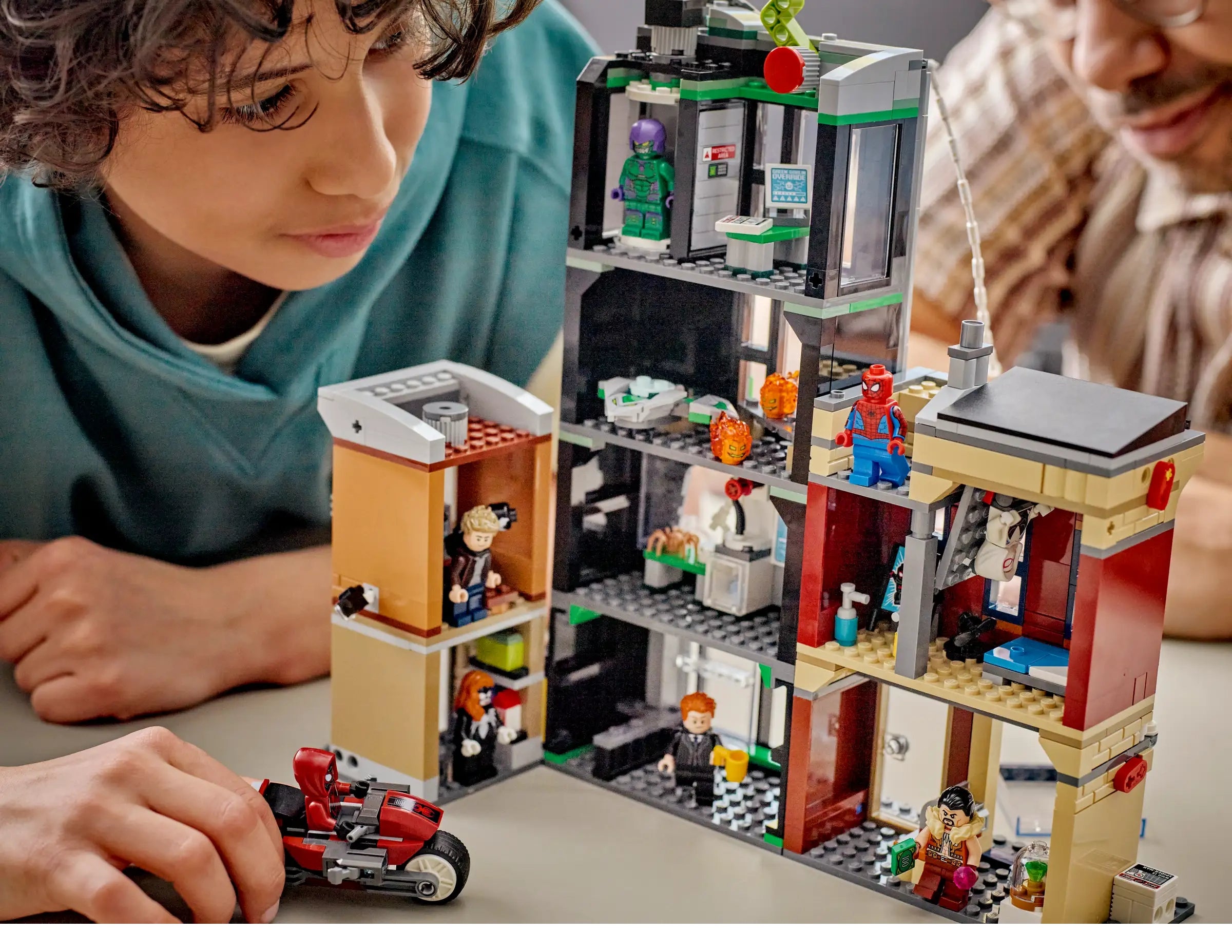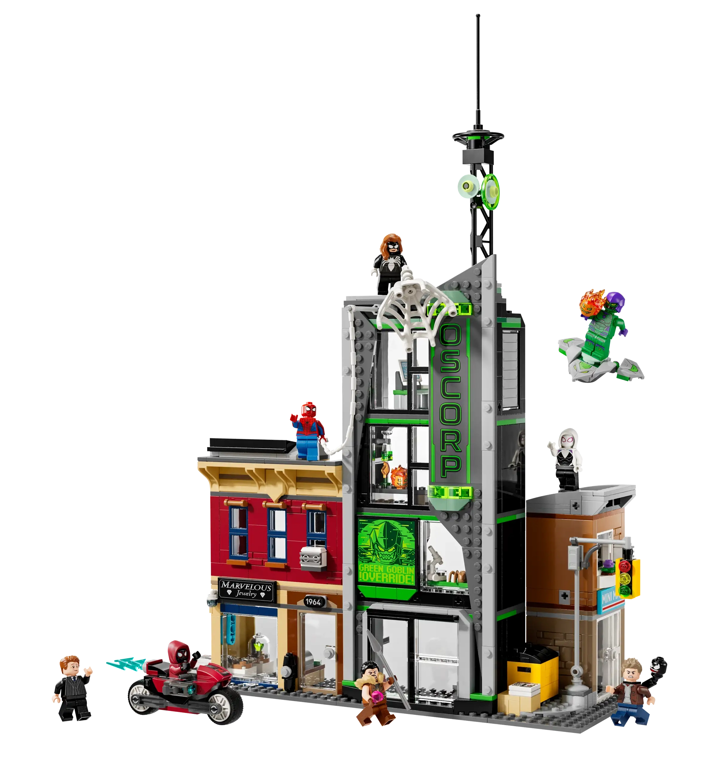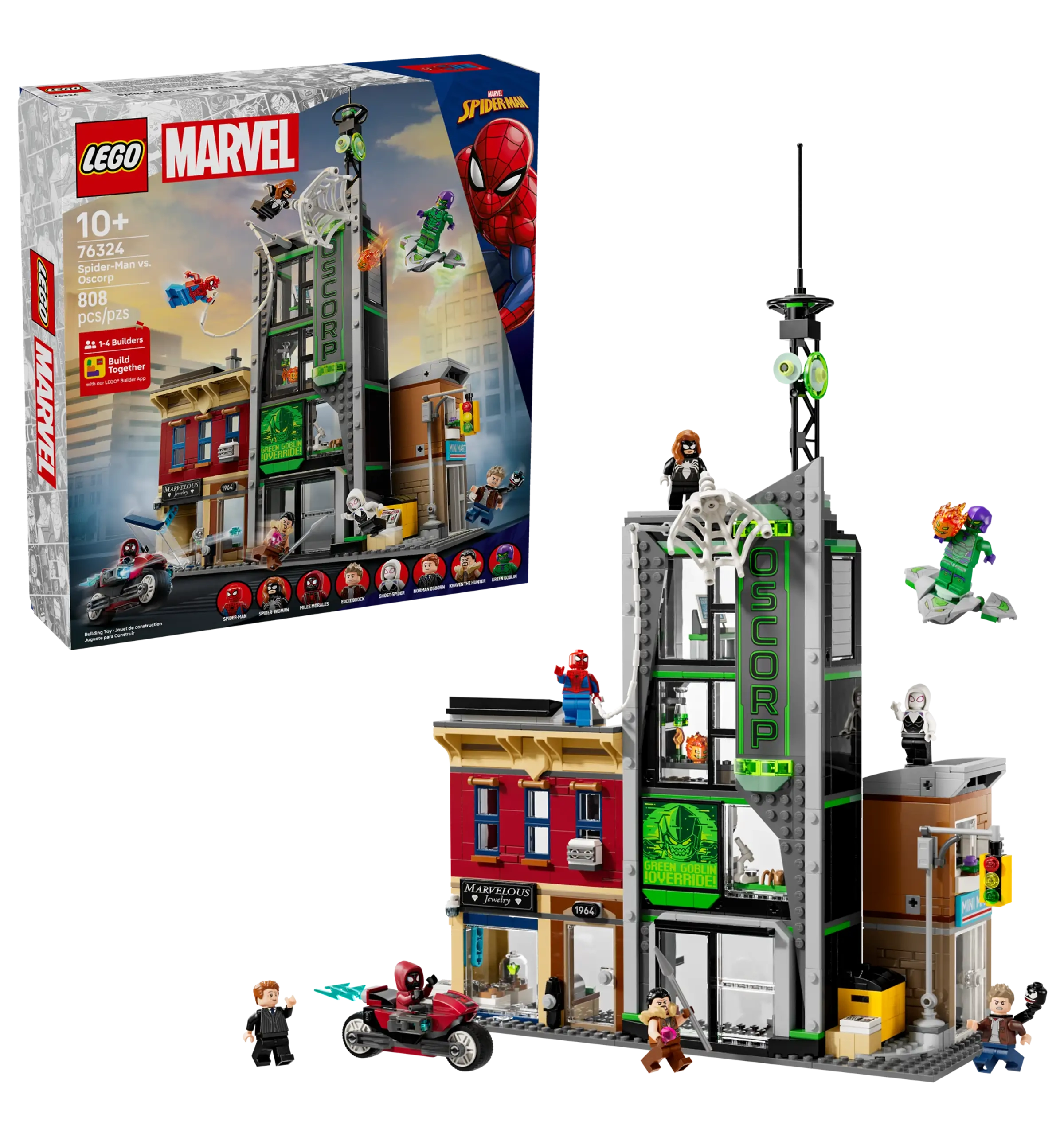 The street scene comprises 3 separate buildings: Miles Morales’s apartment with a jewelry store underneath, the Oscorp building, and Venom’s apartment with a convenience store below. Each room is furnished with relevant equipment and accessories. 8 LEGO minifigures from the Marvel movies ensure endless web-slinging action: Spider-Man, Spider-Woman, Miles Morales with his motorbike, Eddie Brock, Ghost-Spider, Norman Osborn, Kraven the Hunter and Green Goblin with his glider. Transparent sticks allow kids to position and pose characters with realistic ease. Build Together on the LEGO Builder app lets friends and family share the creative fun. Contains 808 pieces.