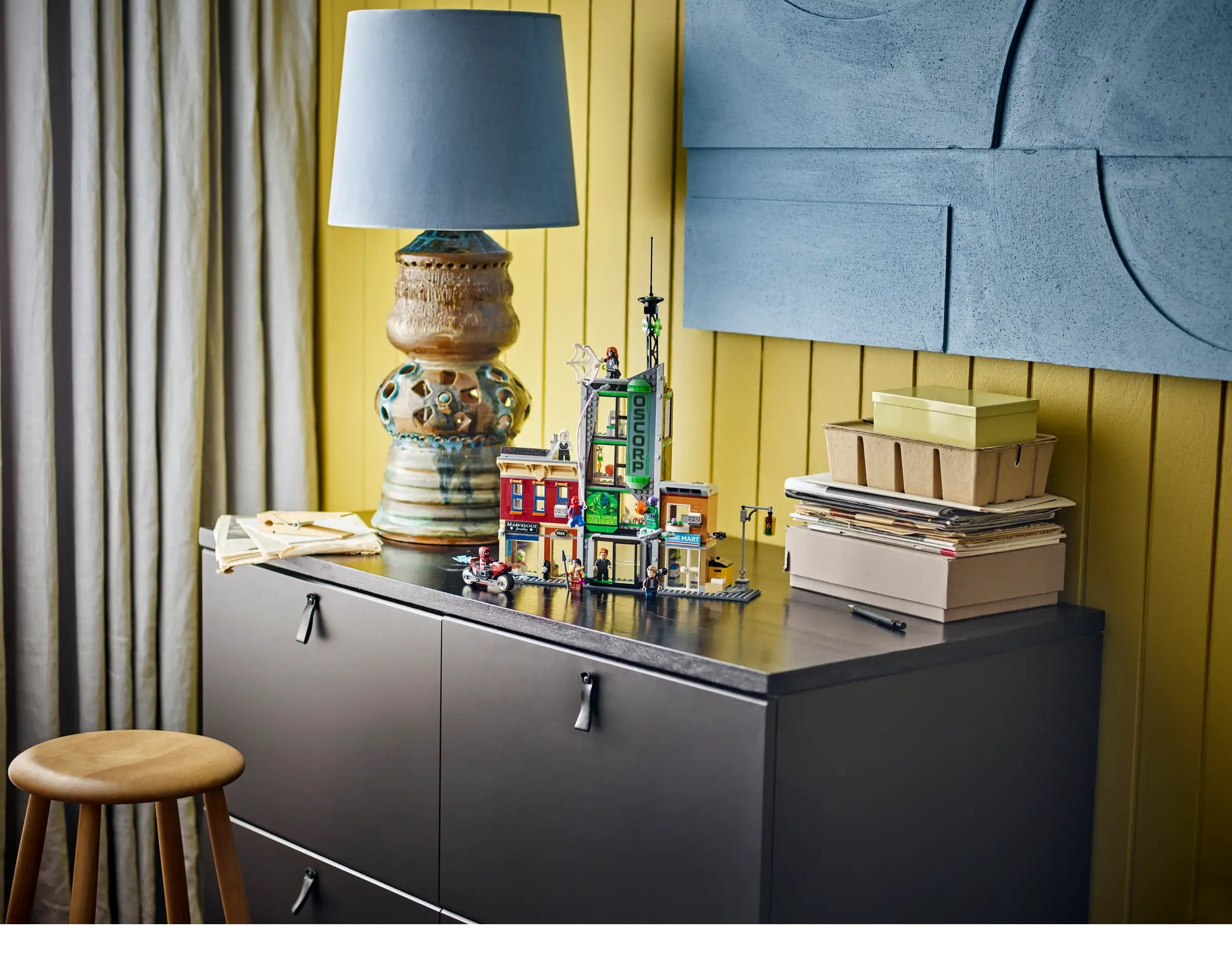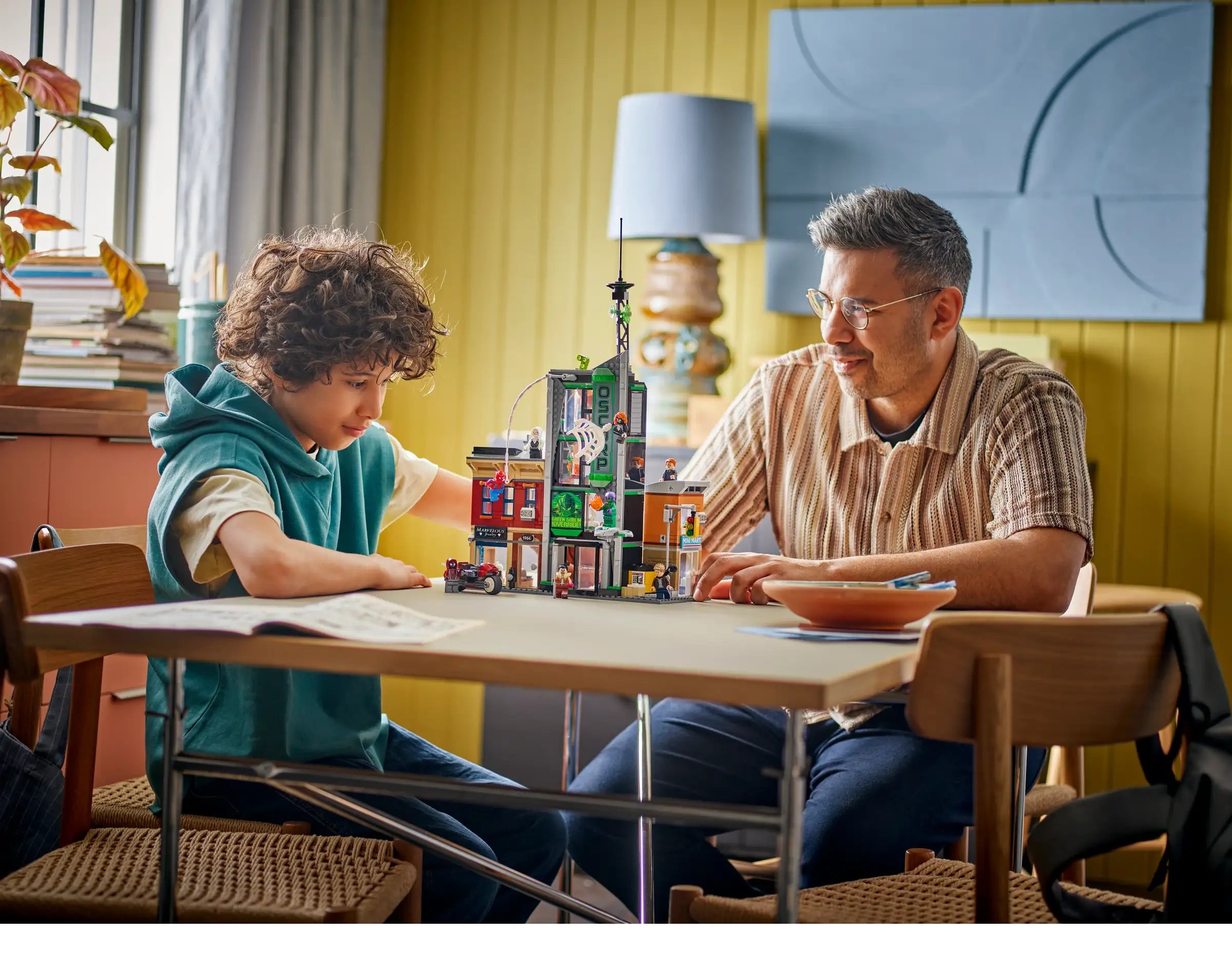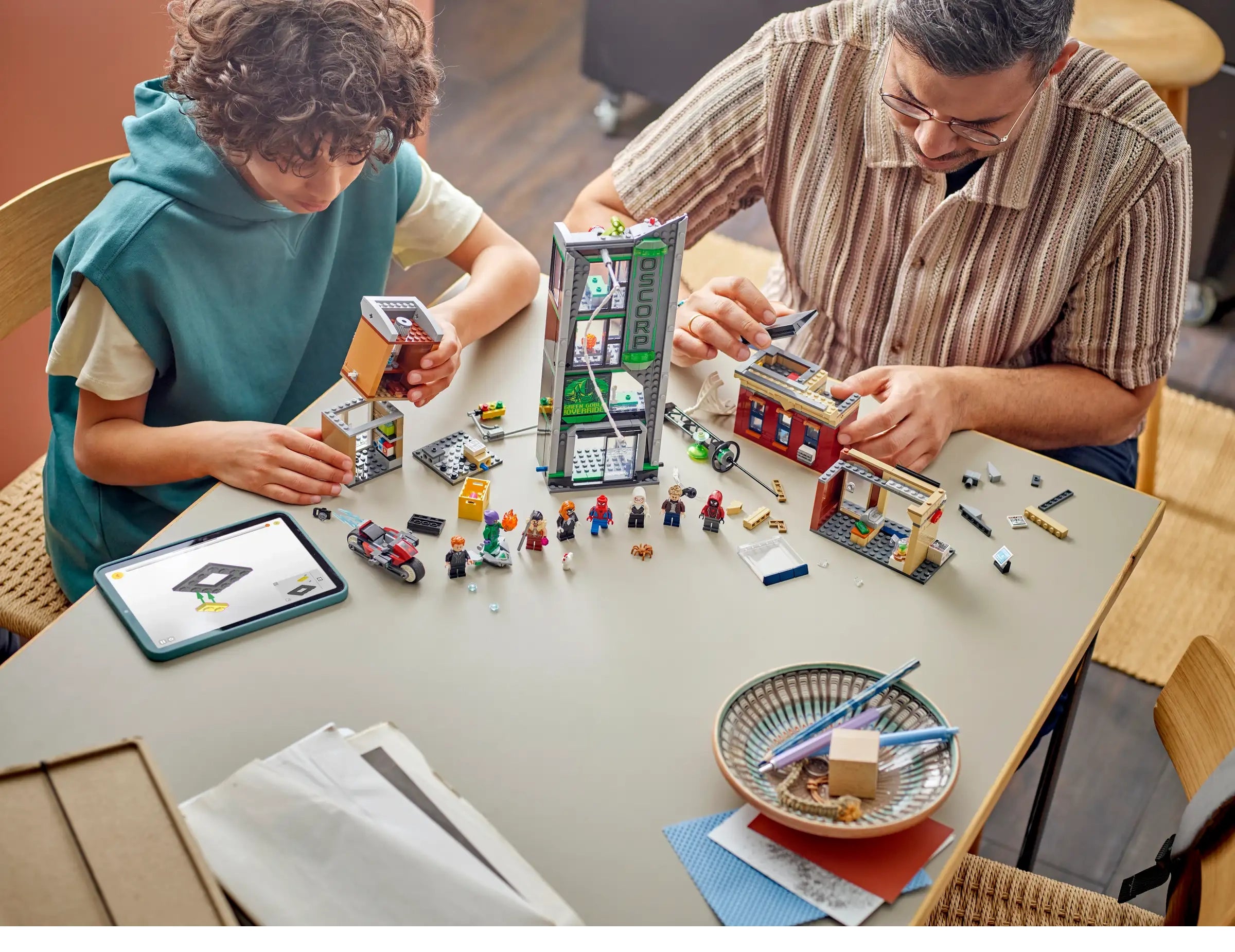 The street scene comprises 3 separate buildings: Miles Morales’s apartment with a jewelry store underneath, the Oscorp building, and Venom’s apartment with a convenience store below. Each room is furnished with relevant equipment and accessories. 8 LEGO minifigures from the Marvel movies ensure endless web-slinging action: Spider-Man, Spider-Woman, Miles Morales with his motorbike, Eddie Brock, Ghost-Spider, Norman Osborn, Kraven the Hunter and Green Goblin with his glider. Transparent sticks allow kids to position and pose characters with realistic ease. Build Together on the LEGO Builder app lets friends and family share the creative fun. Contains 808 pieces.