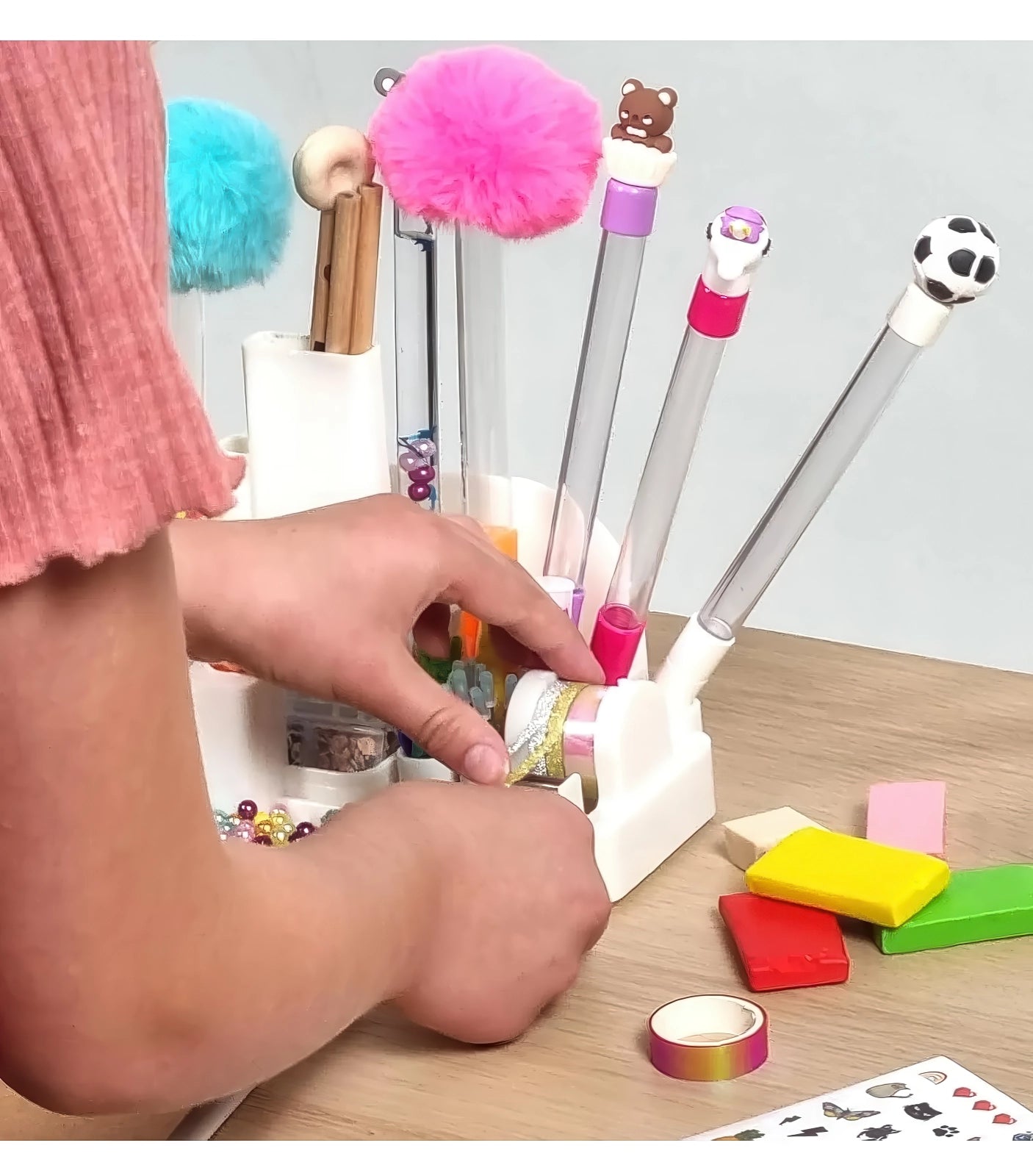 • Interactive Pen Customisation Station - Place any pen in the central holder, insert the funnel, and fill with your chosen decorations