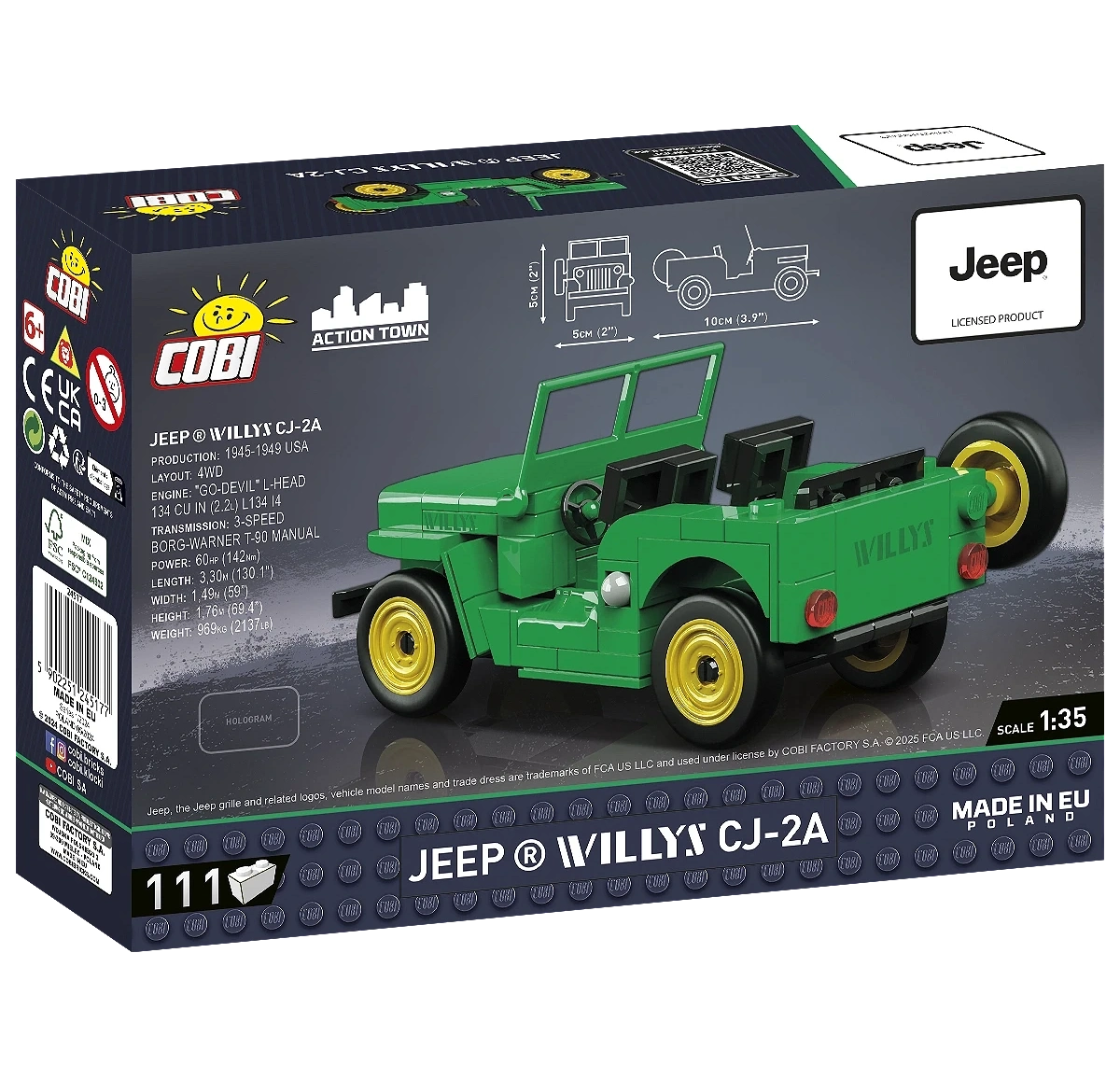 Το μοντέλο Jeep Willys CJ-2A COBI δημιουργήθηκε με άδεια της θρυλικής μάρκας JEEP, σχεδιάστηκε με γνώμονα τους συλλέκτες και τους λάτρεις της κατασκευής, αλλά λειτουργεί εξαιρετικά και ως πολύτιμο εκπαιδευτικό παιχνίδι.