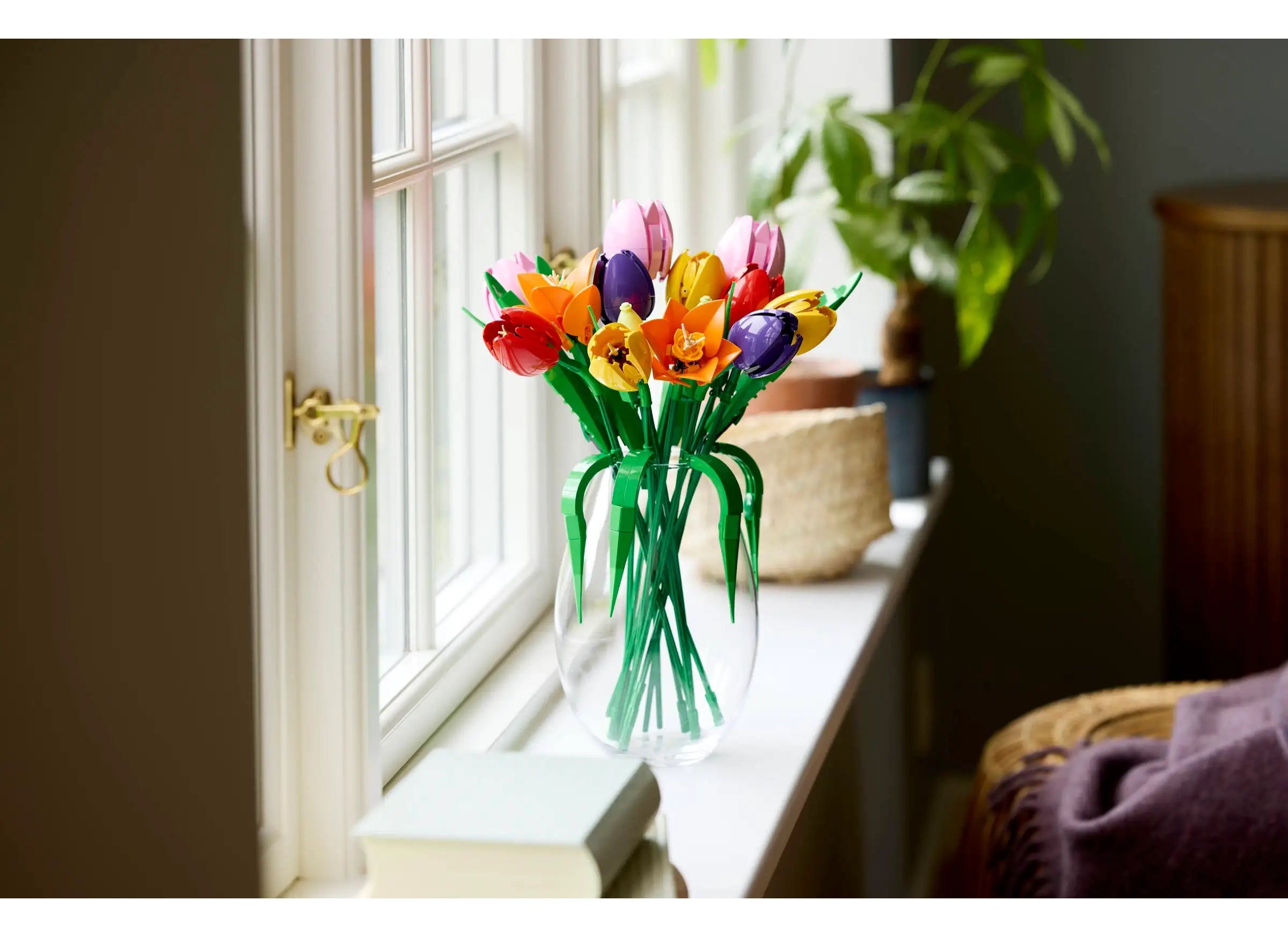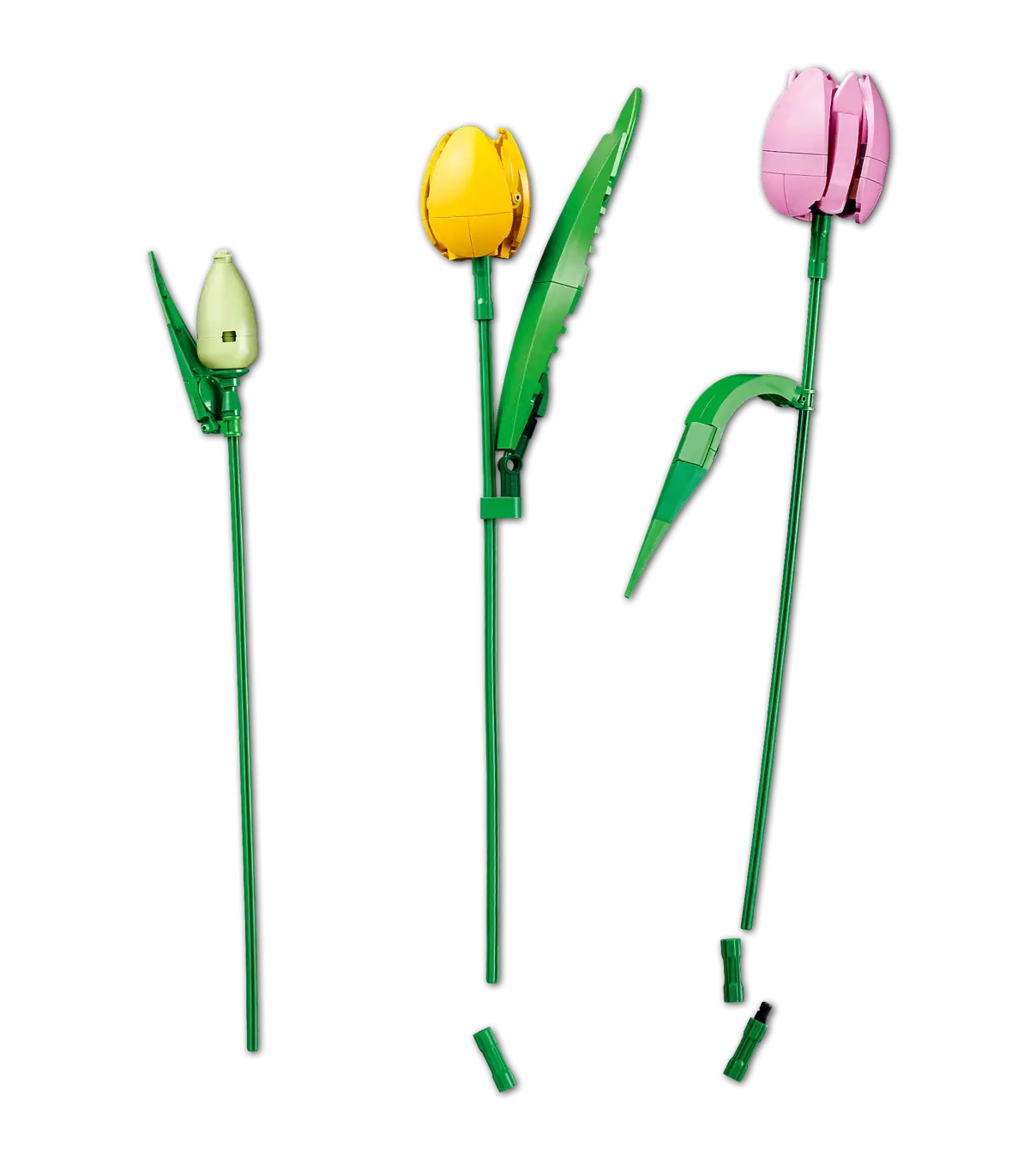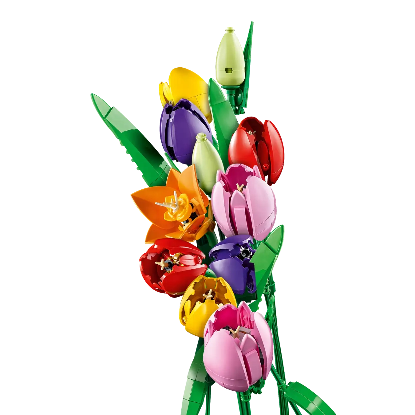 • 5 LEGO® ΤΟΥΛΙΠΕΣ – Το μπουκέτο περιλαμβάνει 5 ποικιλίες τουλίπας σε διάφορα χρώματα και στάδια άνθισης: πράσινα μπουμπούκια, μοβ κλειστές τουλίπες και κόκκινες, κίτρινες και ροζ ανοιχτές τουλίπες