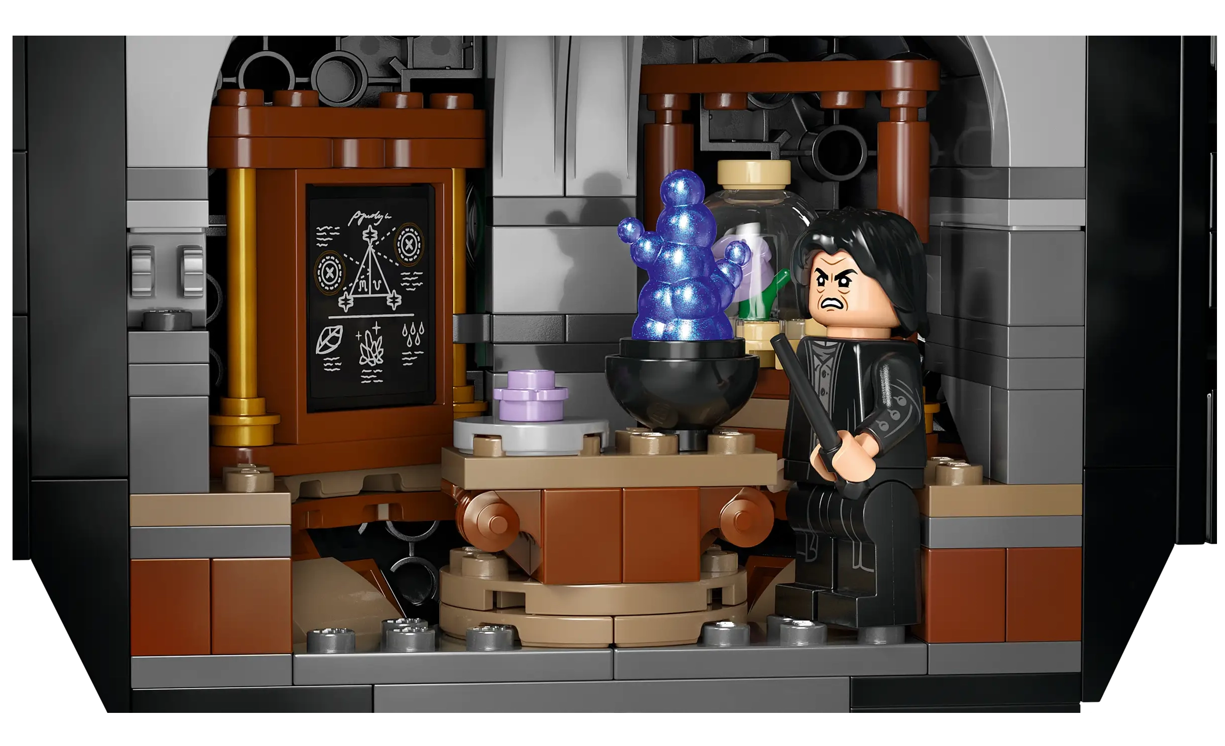 • ΜΥΣΤΙΚΗ ΤΑΞΗ – Κινήστε το κουτάλι ανάδευσης και αποκαλύψτε την αίθουσα με αποσπώμενα τραπέζια για εύκολο παιχνίδι, έναν πίνακα, φιάλες φίλτρων και υλικά LEGO® για φίλτρο λύκου, Πολυχυμό και φίλτρο αγάπης