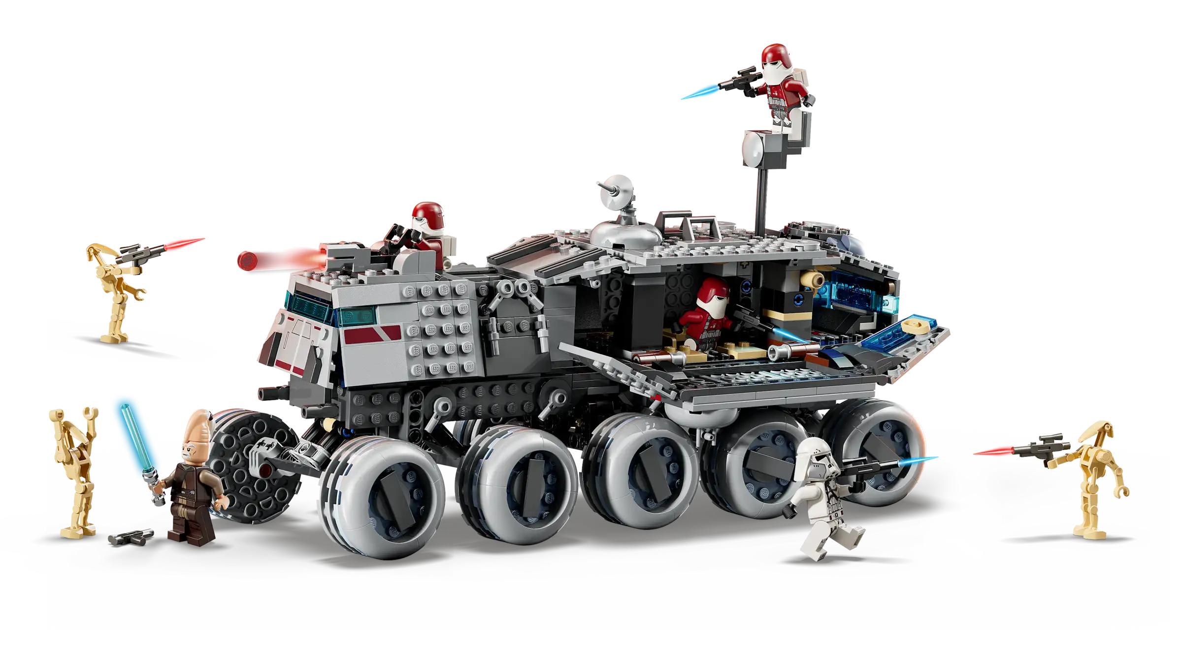• Κατασκευασμένο για δράση – Κλίστε το όχημα με 10 τροχούς για να το στρίψετε και τοποθετήστε τις μινιφιγούρες LEGO® στα εμπρός και πίσω πιλοτήρια, στο ανυψούμενο παρατηρητήριο και στον πύργο με το όπλο με καρφίτσα.