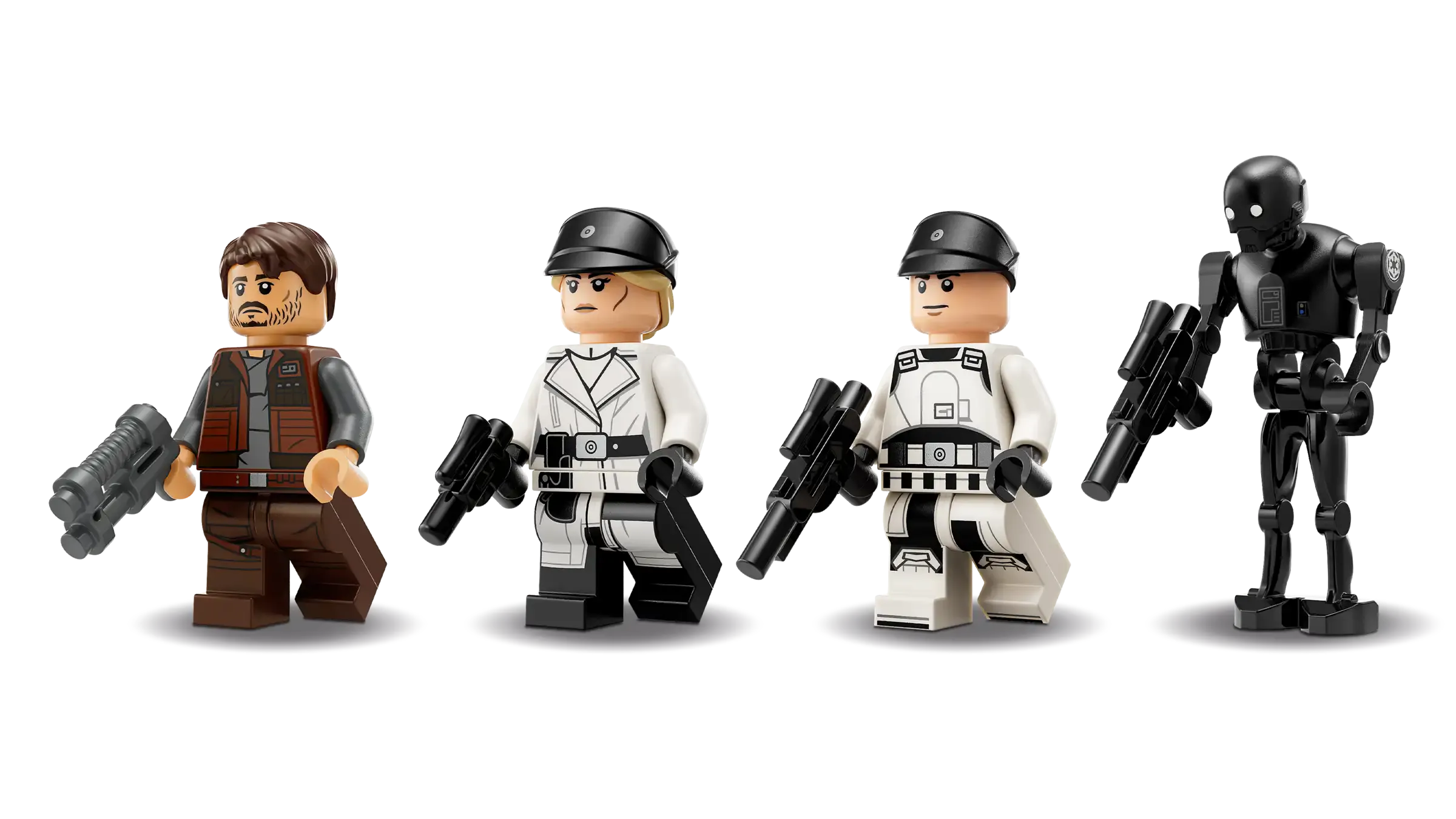 • 4 χαρακτήρες LEGO® Star Wars™ – Οι μινιφιγούρες Cassian Andor και Dedra Meero, η κάθε μία με πιστόλι μπλάστερ, καθώς και η μινιφιγούρα ISB Tactical Agent και η φιγούρα ρομπότ K-2SO, η κάθε μία με μπλάστερ.