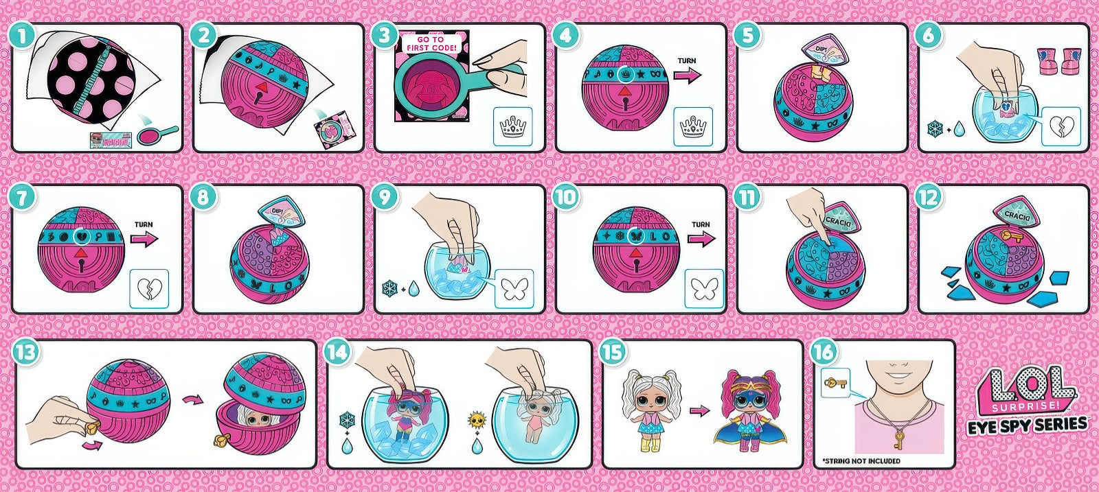 Αποκαλύψτε τον φανταστικό, μυστικό κόσμο της σειράς L.O.L. Surprise! Doll Tots Eye Spy! Θα χρειαστεί να σπάσετε κωδικούς, να λύσετε γρίφους και να ξεκλειδώσετε μυστικά ένα προς ένα καθώς ξεπακετάρετε χαριτωμένα ρούχα, αξεσουάρ και άλλα. Συλλέξτε όλα τα 8 αξιολάτρευτα Tots (πωλούνται ξεχωριστά). Μην ξεχάσετε να αναζητήσετε την υπερσπάνια χρυσή μπάλα που κρατά τον χαρακτήρα Spy chase, ο οποίος γίνεται από εντελώς διαφανής σε χρωματιστός όταν βυθίζεται σε κρύο νερό!