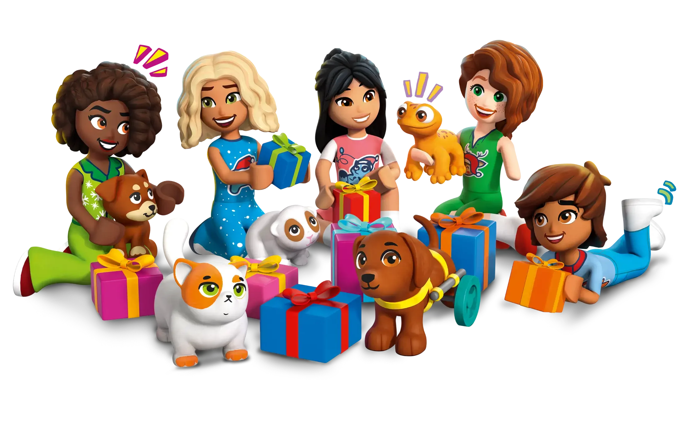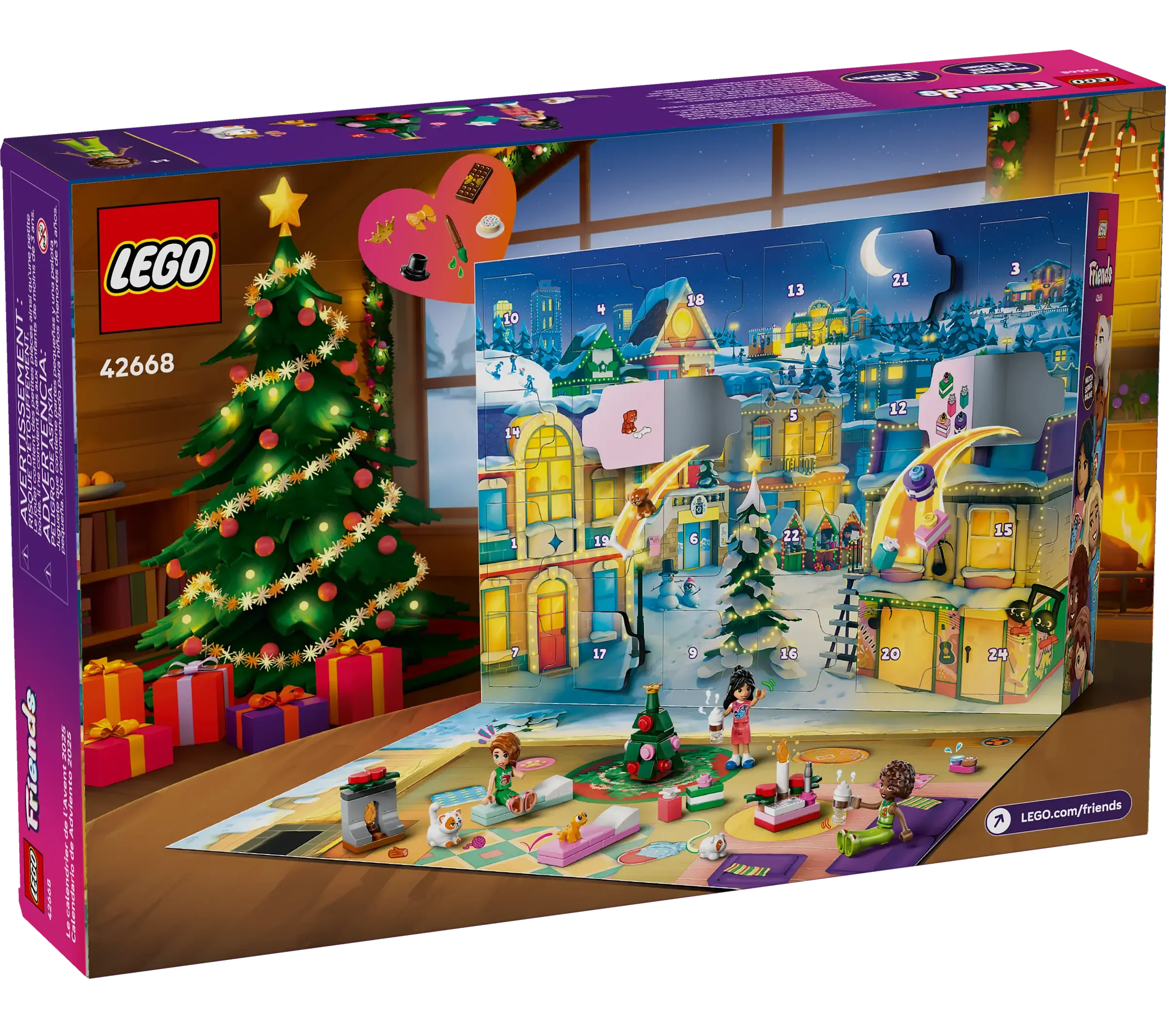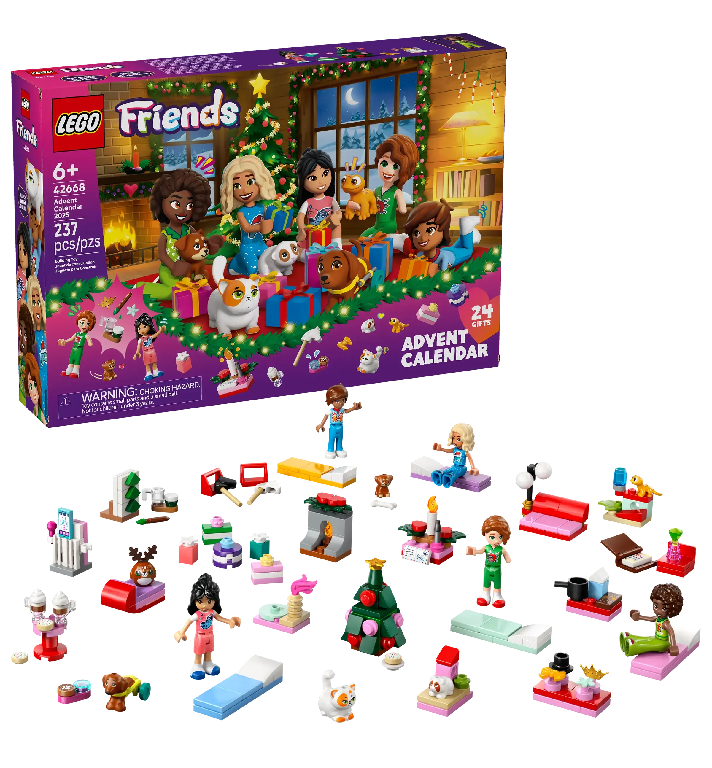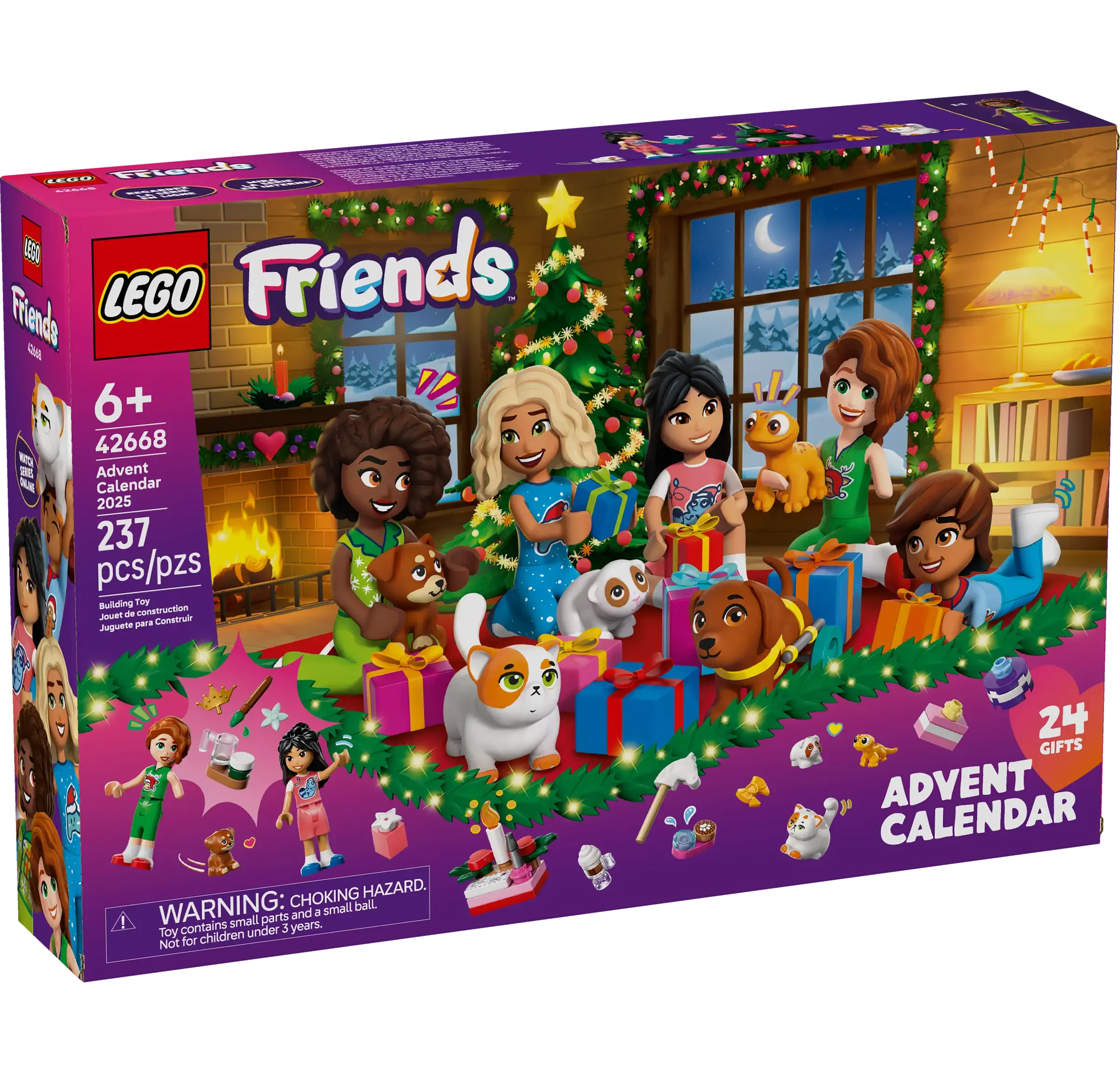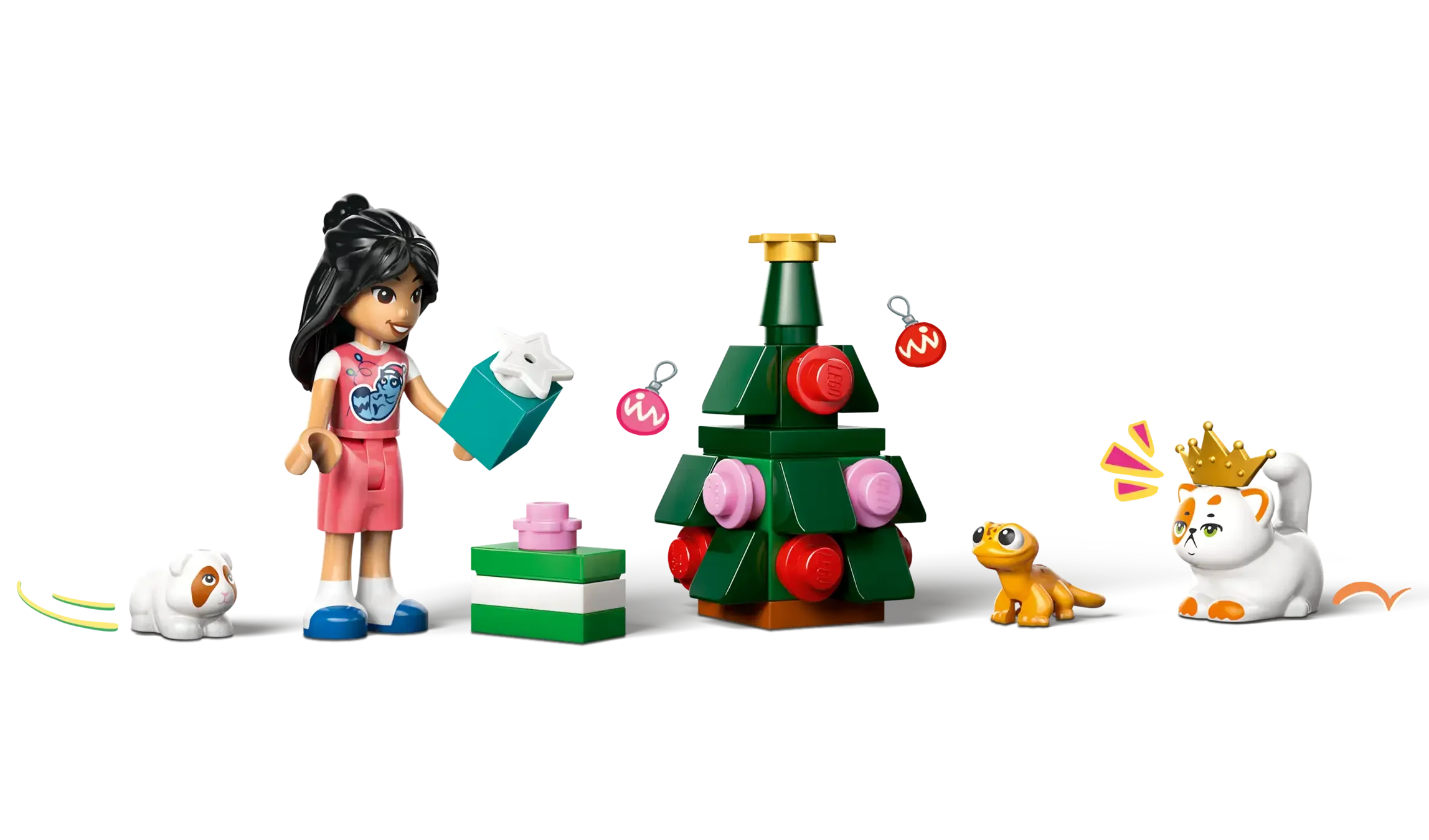 Εμπνεύστε γιορτινή διάθεση και ζεστές στιγμές για κορίτσια και αγόρια ηλικίας 6 ετών και άνω καθώς ανοίγουν τις πόρτες του σετ κατασκευής LEGO® Friends Advent Calendar 2025 (42668). Περιλαμβάνει 5 μινικούκλες, τις Aliya, Autumn, Liann, Nova και Leo, καθώς και 5 LEGO ζώα, ανάμεσά τους 2 σκύλους, ένα ινδικό χοιρίδιο, έναν γκέκο και μια φιγούρα γάτας. Ανοίξτε μια πόρτα κάθε μέρα για να χτίσετε την ιστορία της γιορτινής νυχτερινής συνάντησης.