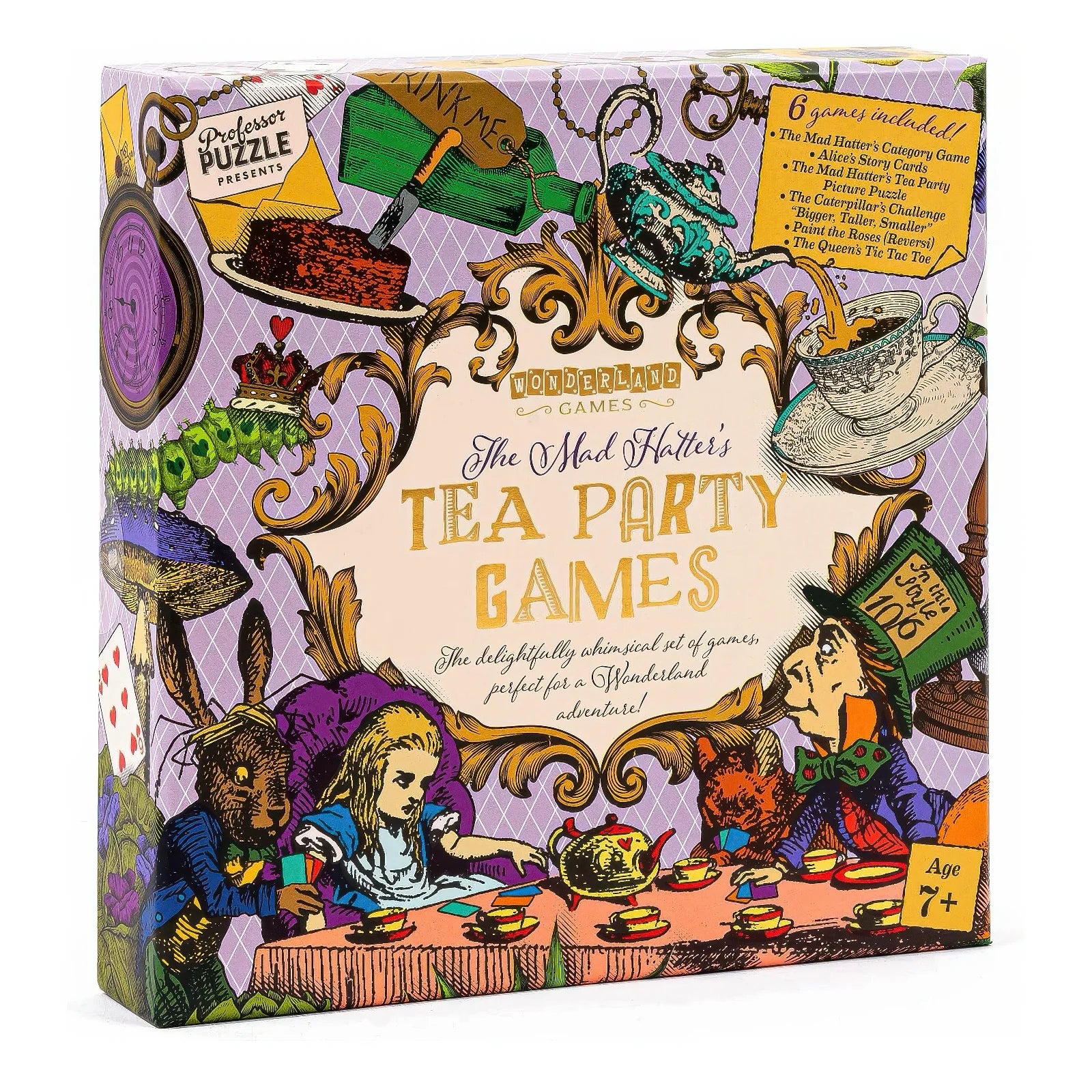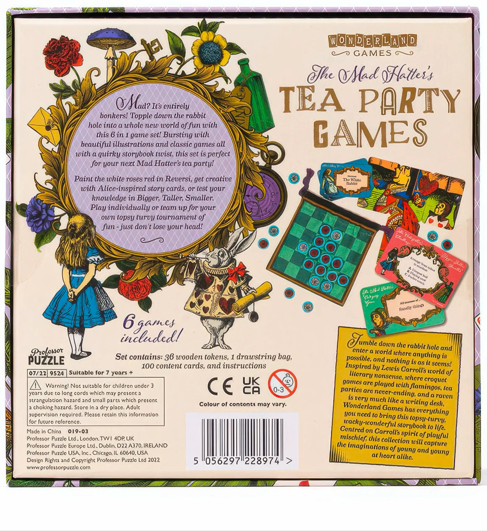 Τρελό; Είναι εντελώς τρελό! Καταρρεύστε στη λαγότρυπα σε έναν ολοκαίνουργιο κόσμο διασκέδασης με αυτό το σετ παιχνιδιών 5 σε 1! Γεμάτο όμορφες εικονογραφήσεις και κλασικά παιχνίδια με μια παιχνιδιάρικη αφήγηση, αυτό το σετ είναι ιδανικό για το επόμενο τσάι του Hatter! Βάψτε τα λευκά τριαντάφυλλα κόκκινα στο Reversi, ταιριάξτε τις κάρτες ιστοριών εμπνευσμένες από την Alice ή δείξτε πόσο καλά γνωρίζετε τους αγαπημένους σας λογοτεχνικούς χαρακτήρες στο Bigger Taller Smaller. Παίξτε κάθε παιχνίδι ξεχωριστά ή διοργανώστε το δικό σας ανατρεπτικό τουρνουά διασκέδασης – απλώς μην χάσετε το κεφάλι σας!