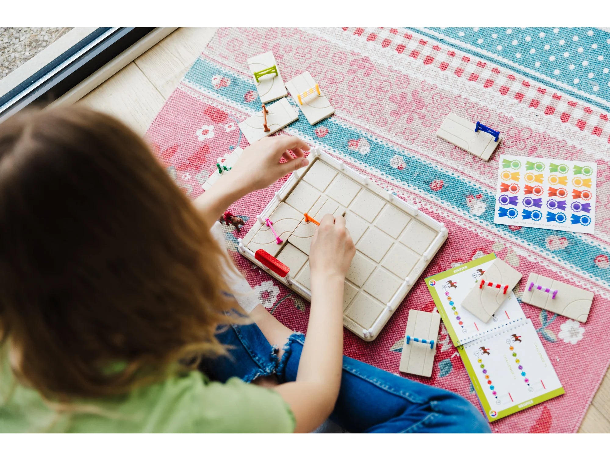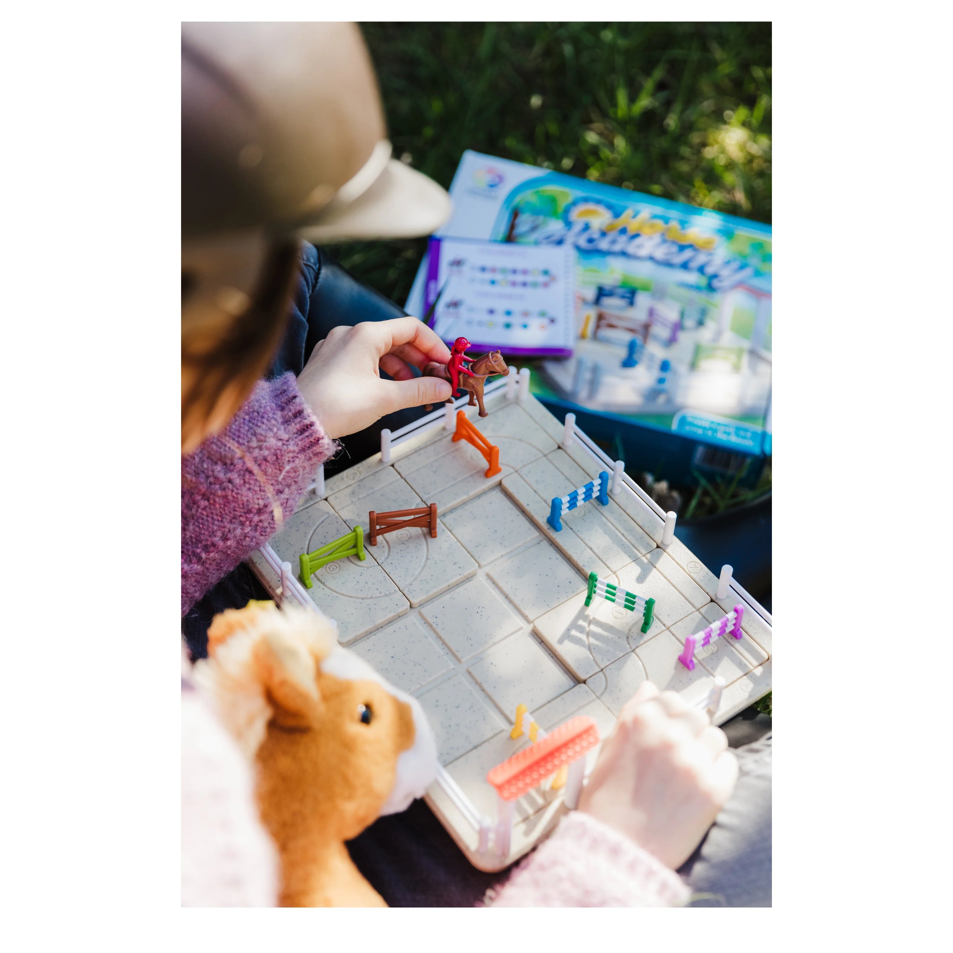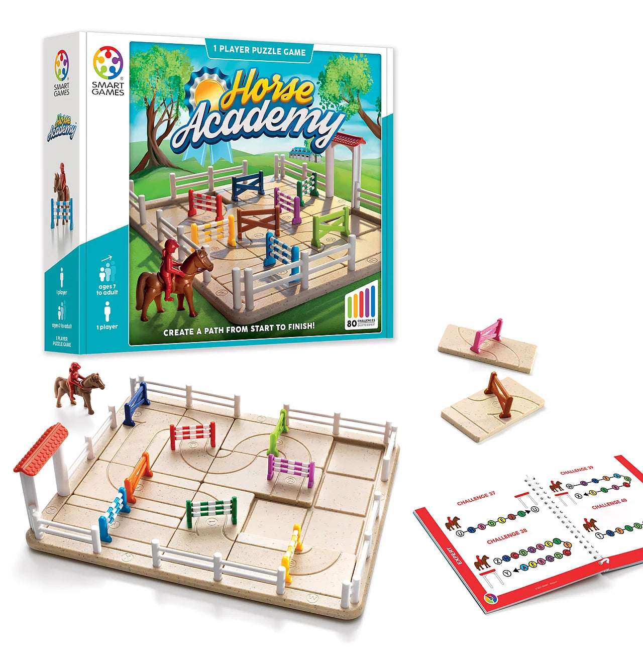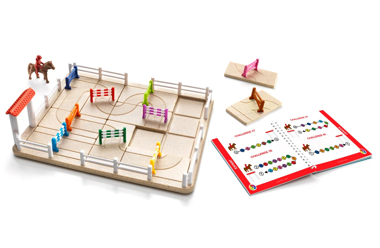 Μέσα στο κουτί: 1 ταμπλό παιχνιδιού, 1 πύλη εξόδου, 10 κομμάτια παζλ με εμπόδια και διαδρομές, 1 άλογο με αναβάτη, φυλλάδιο με 80 προκλήσεις.