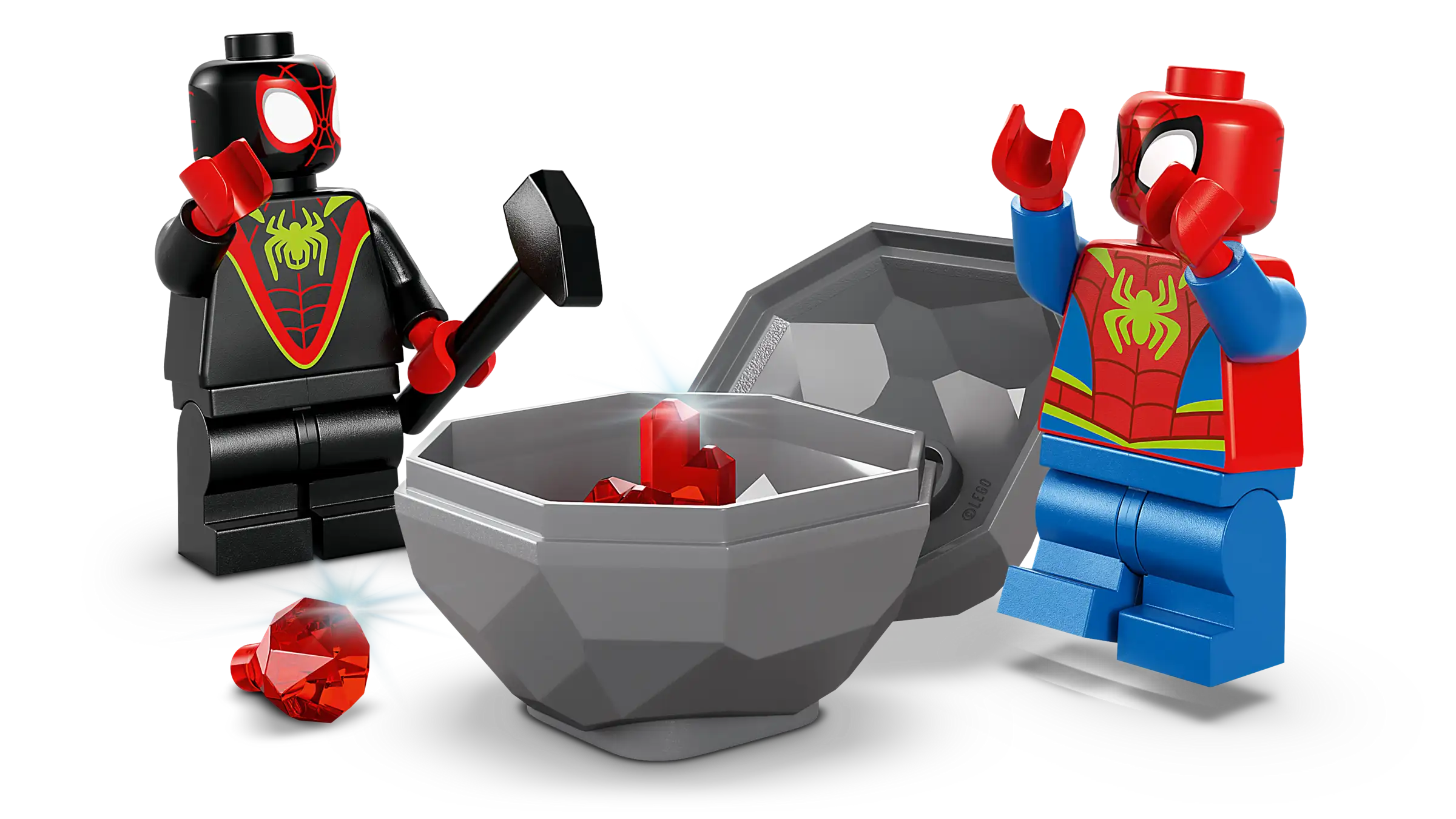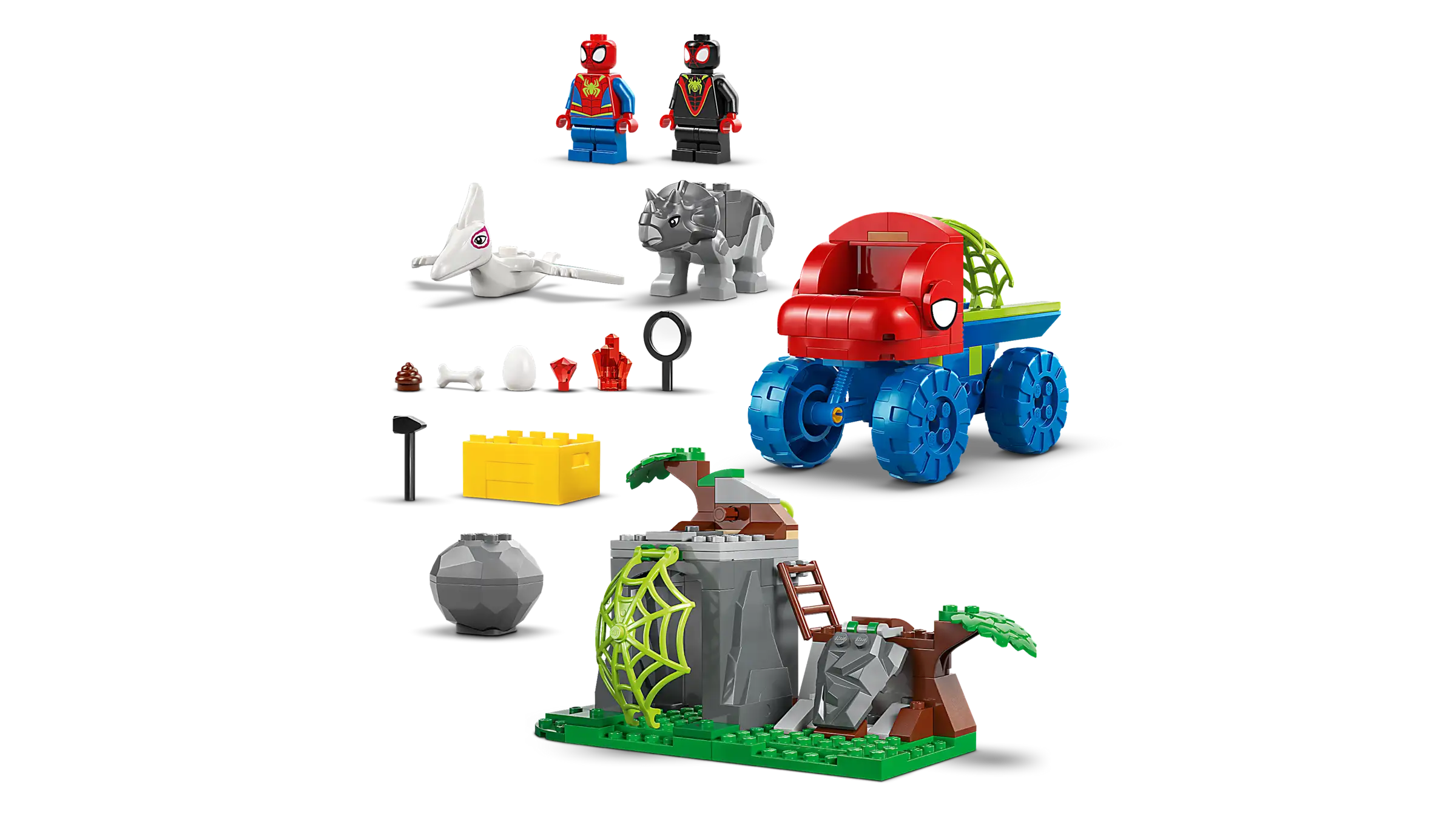 Αυτό το κατασκευάσιμο σετ LEGO® περιλαμβάνει τις μινιφιγούρες Spidey και Miles "Spin" Morales και 2 κατασκευάσιμες φιγούρες δεινοσαύρων: Ghost-Spider ως πτεροδάκτυλο και Rhino ως τρικεράτωπα. Υπάρχει το φορτηγό LEGO Dino Crawler του Spidey με έναν μεγάλο ιστό στο πίσω μέρος, μια πέτρα που πέφτει με μοχλό, ένα αυγό δεινοσαύρου για να αποκαλυφθεί και ένας ιστός που κατεβαίνει για να παγιδεύσει τον κακό. Οι οδηγίες είναι διαισθητικές σε μορφή πολύχρωμου οδηγού με εικόνες και ξεχωριστές σακούλες περιέχουν τουβλάκια και ένα μεγάλο Starter Brick για γρήγορη και εύκολη κατασκευή.
