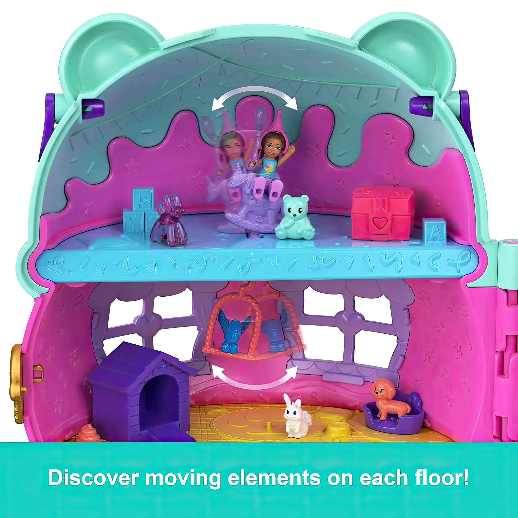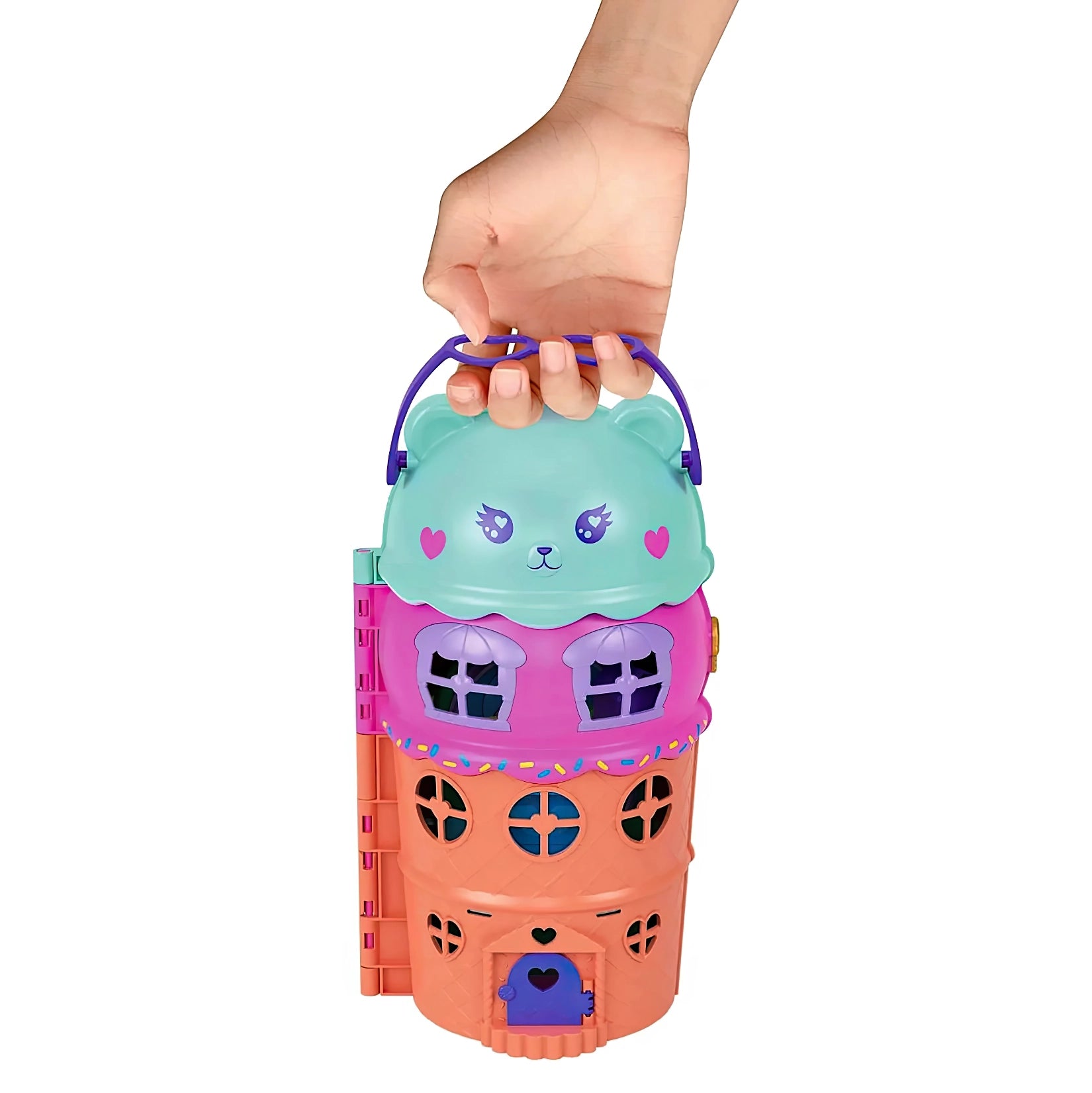 Ελάτε μέσα και γιορτάστε μαζί μας! Το Polly Pocket Gelato House έχει σχήμα χωνάκι παγωτού με χαριτωμένο θέμα αρκούδας. Τα γυαλιά της αρκούδας σε σχήμα καρδιάς λειτουργούν και ως χερούλι για διασκέδαση εν κινήσει! Πάρτε το ασανσέρ για να ανοίξετε το κερασάκι στην κορυφή και… έκπληξη! Αποκαλύψτε κομφετί από το κερασάκι πριν ανακαλύψετε 4 ορόφους διασκέδασης μέσα στο συμπαγές σετ!