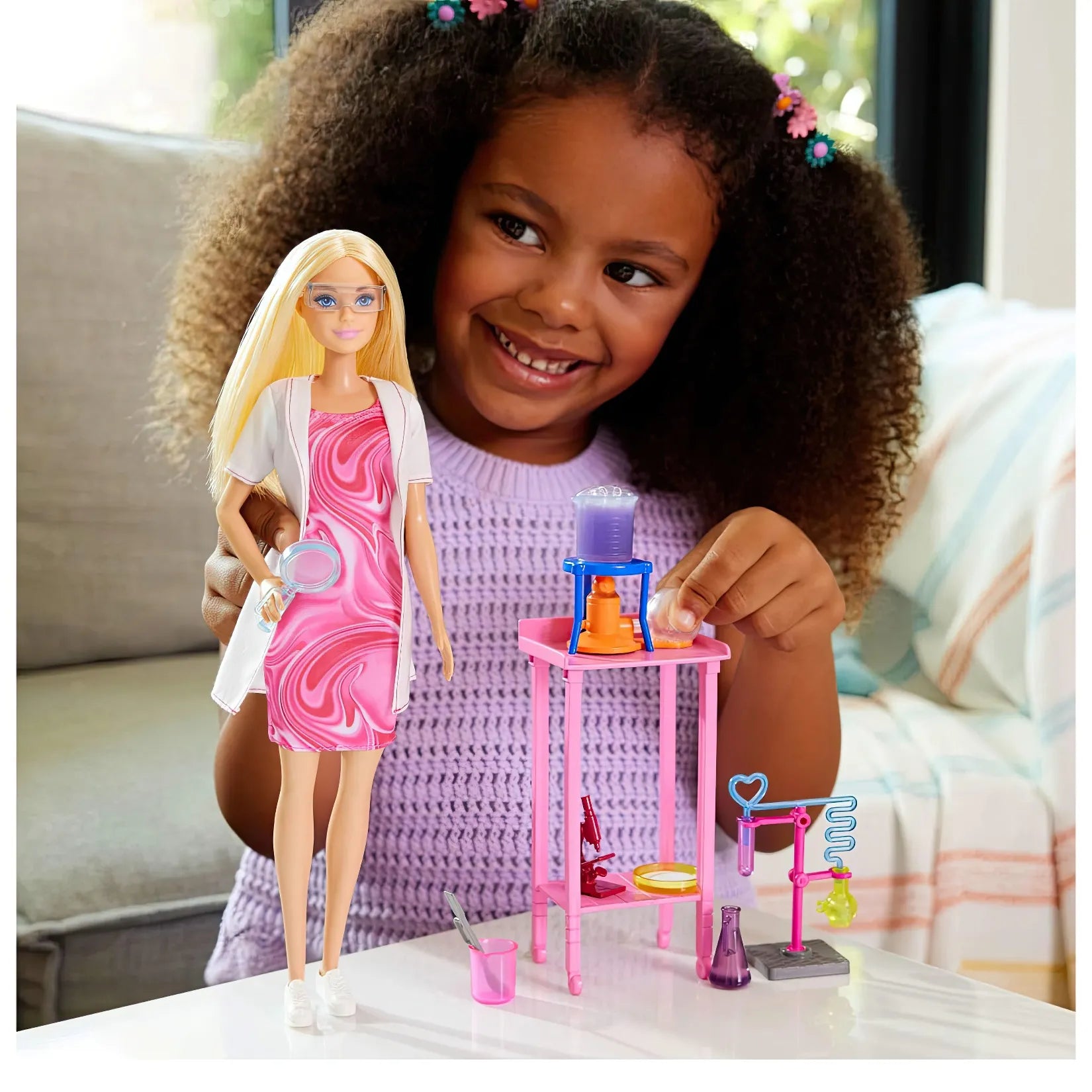 • Η κούκλα Barbie® Scientist και τα αξεσουάρ της επιτρέπουν στα παιδιά να φανταστούν το επάγγελμά τους ως Επιστήμονας!