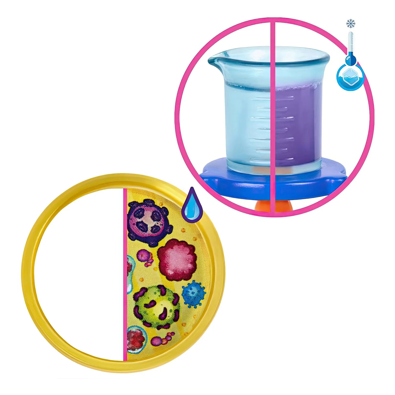 • Δημιουργήστε διάφορα πειράματα με το ποτήρι μέτρησης που αλλάζει χρώμα, το πιάτο Petri και άλλα επιστημονικά αξεσουάρ.