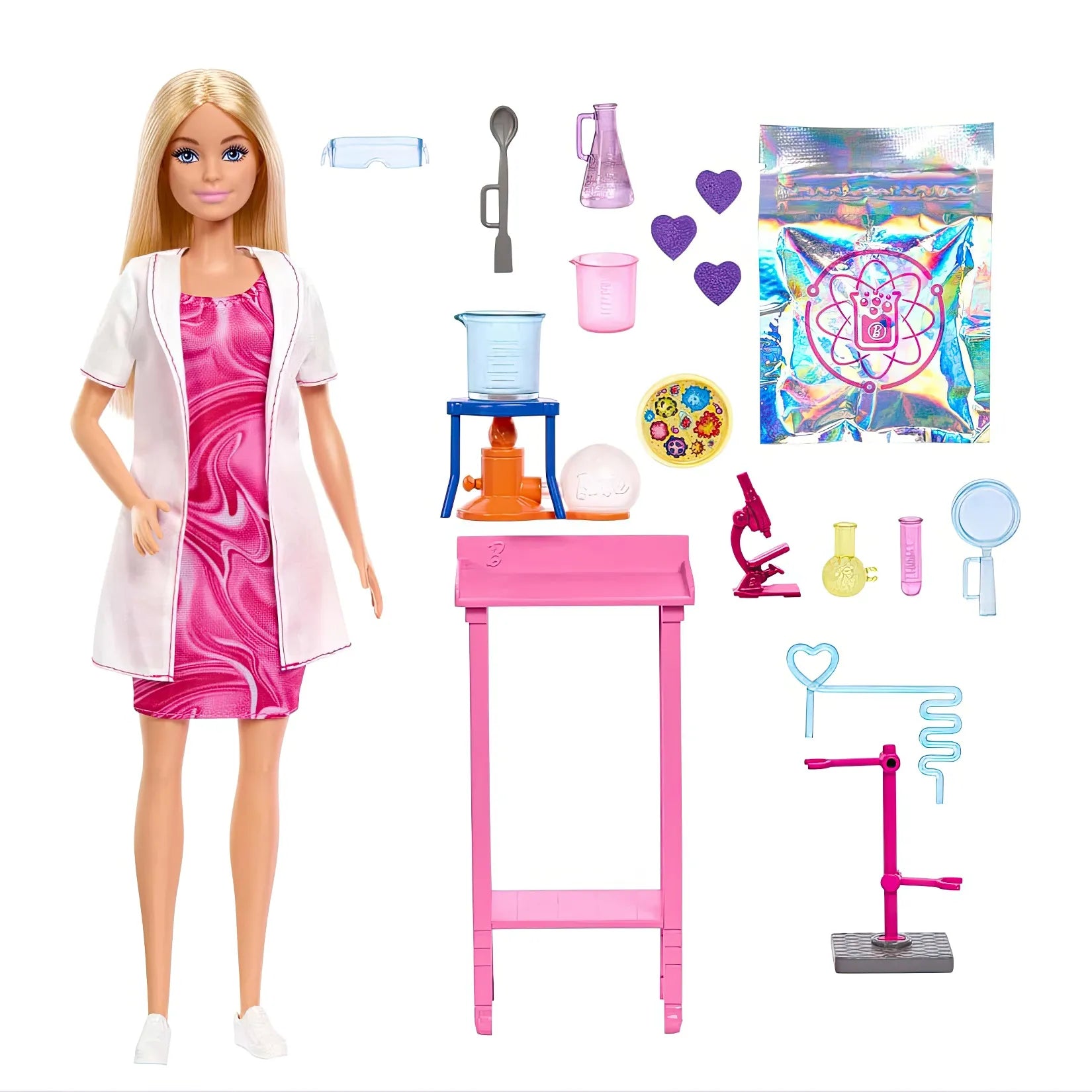 • Περιλαμβάνει 1 κούκλα Barbie® με φόρεμα, λευκό παλτό και παπούτσια, 1 ζευγάρι γυαλιά προστασίας, 1 τραπέζι, 1 πιάτο Petri. Η κούκλα δεν μπορεί να σταθεί μόνη της. Τα χρώματα και οι διακοσμήσεις μπορεί να διαφέρουν.