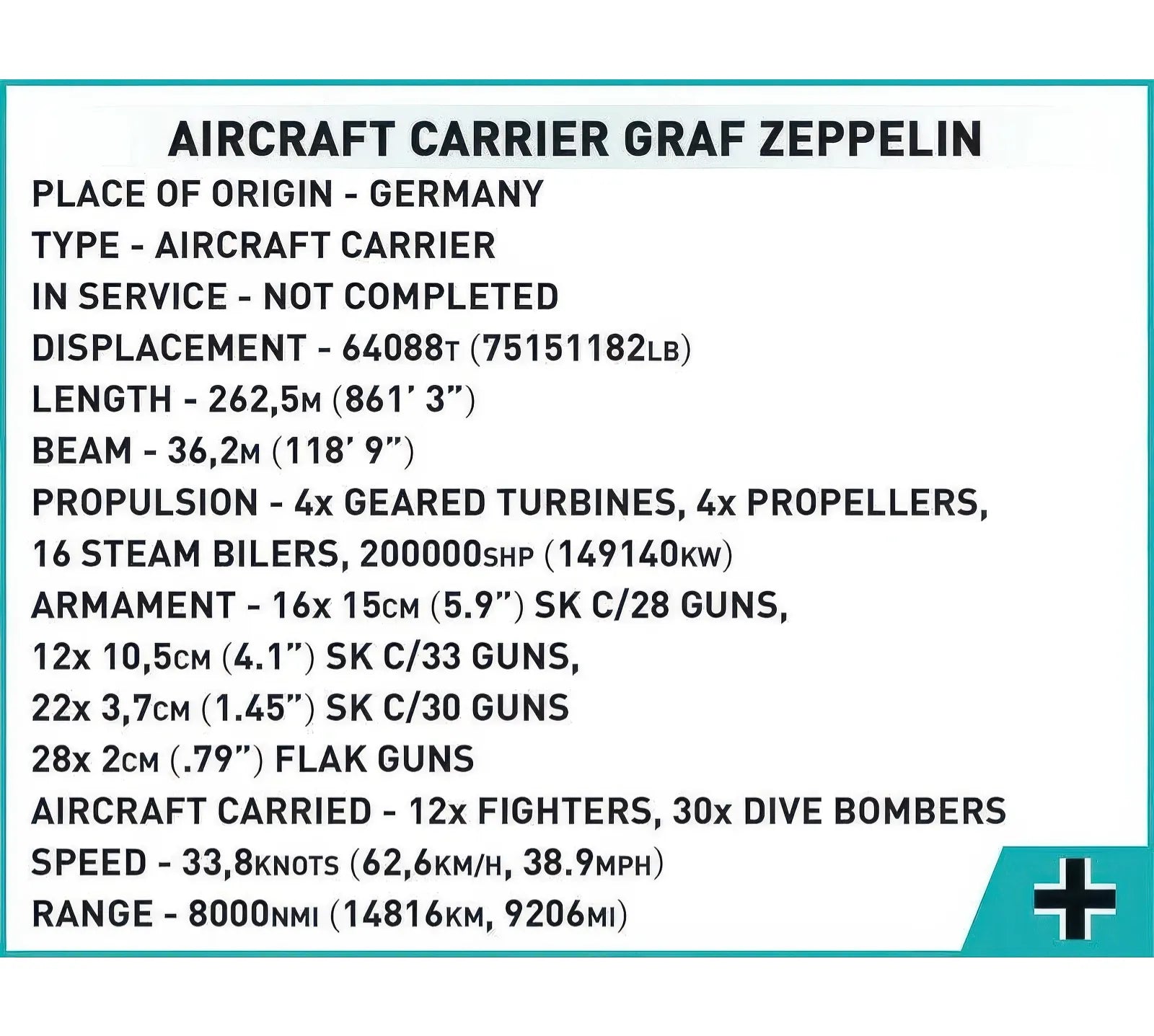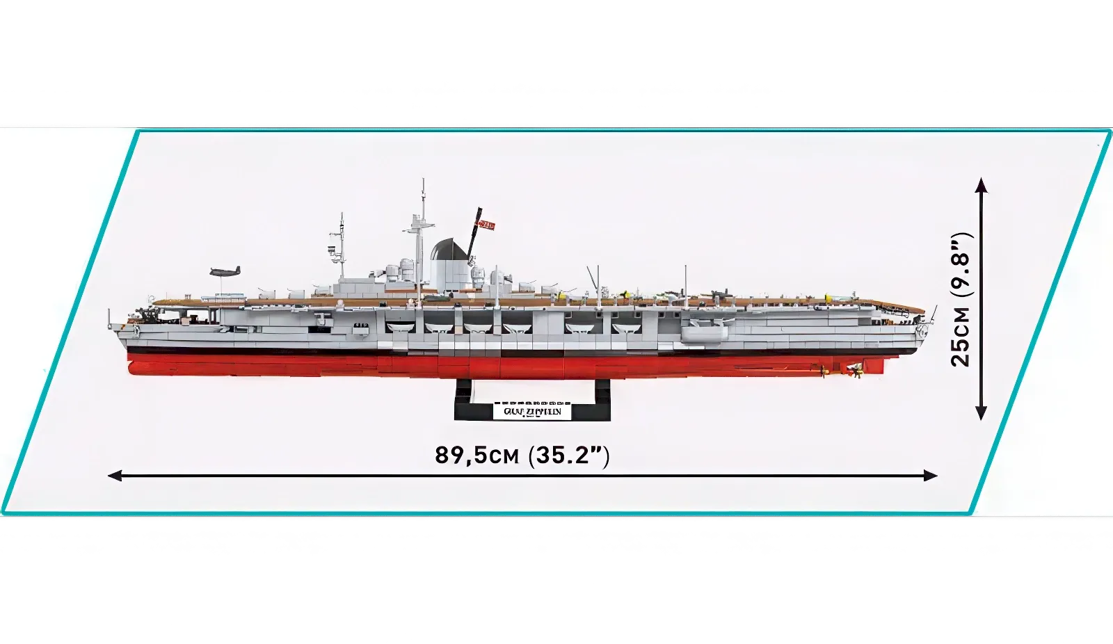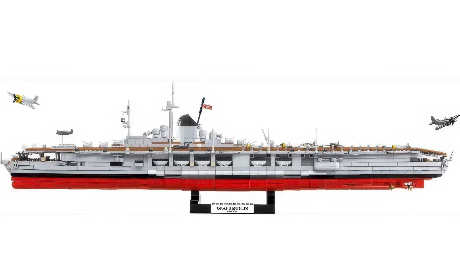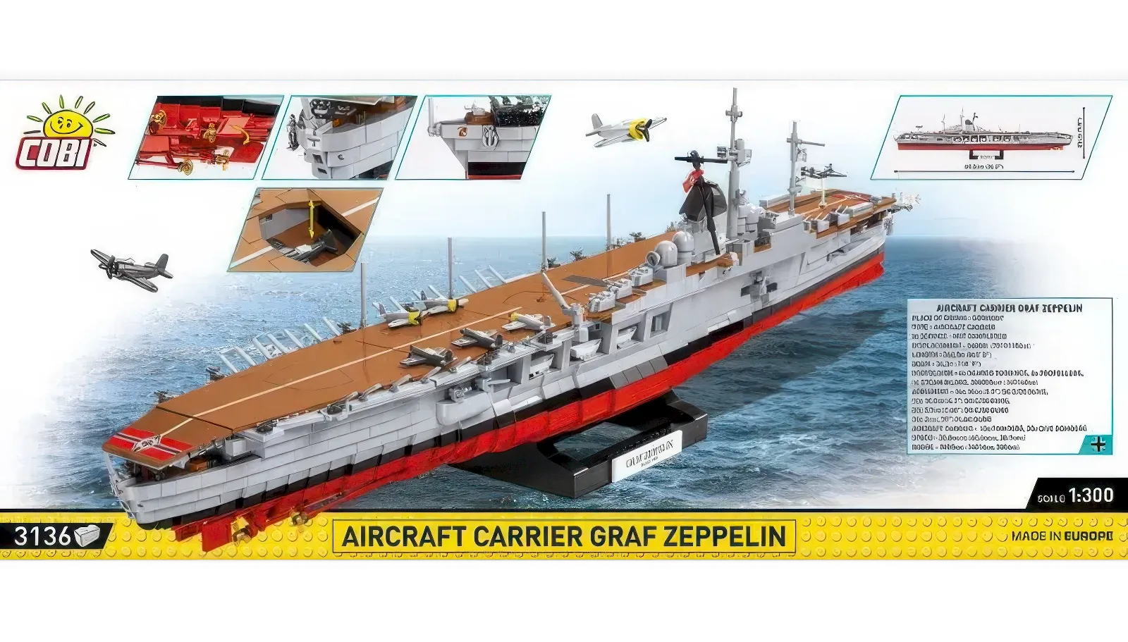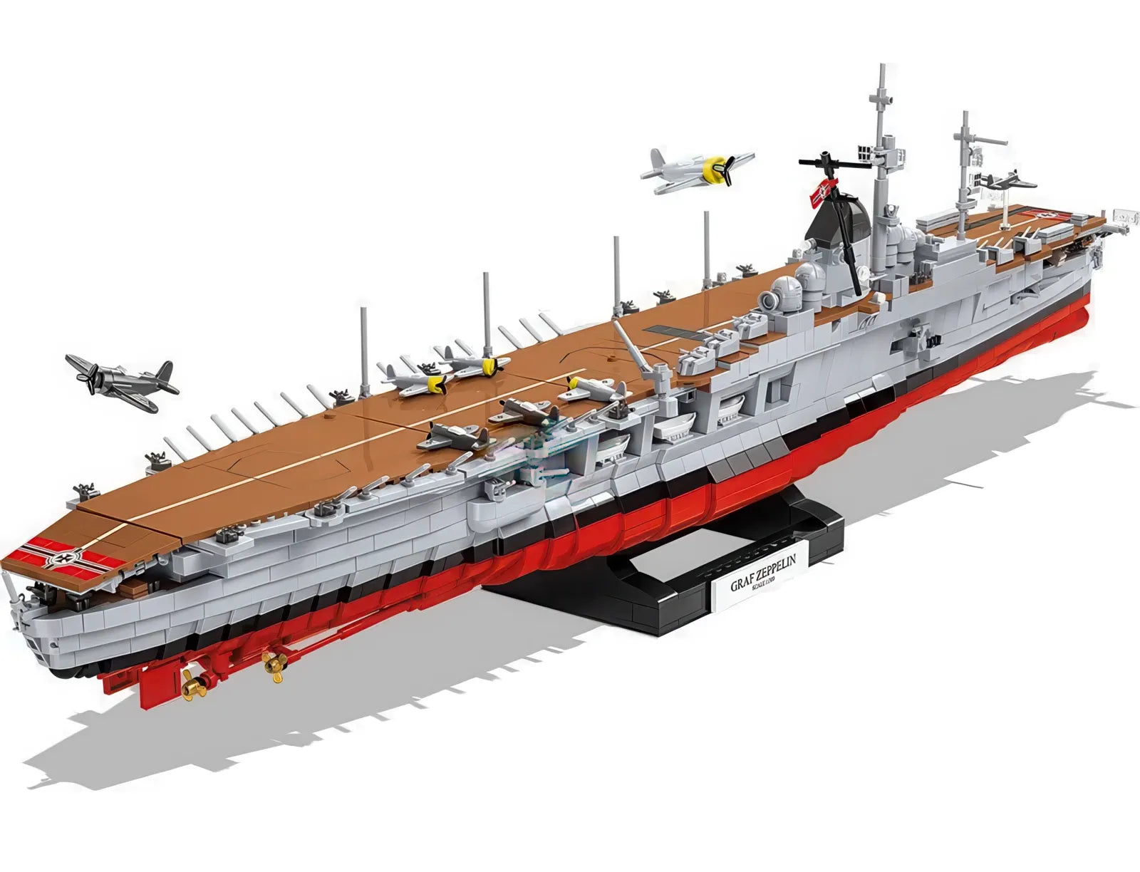 Αποκτήστε ένα σετ κατασκευαστικών τουβλακίων COBI και φτιάξτε το μοντέλο του θρυλικού γερμανικού αεροπλανοφόρου Graf Zeppelin! Το μοντέλο έχει σχεδιαστεί στην τυπική κλίμακα 1:300. Το ρεκόρ σετ που αποτελείται από 3136 τουβλάκια θα προσφέρει πολλές ώρες συναρπαστικής κατασκευής. Πρόκειται για νέα έκδοση με βελτιώσεις, όπως το νέο χρώμα των καφέ πλακιδίων στη γέφυρα. Έχει αλλάξει επίσης η δομή των καπνοδόχων.