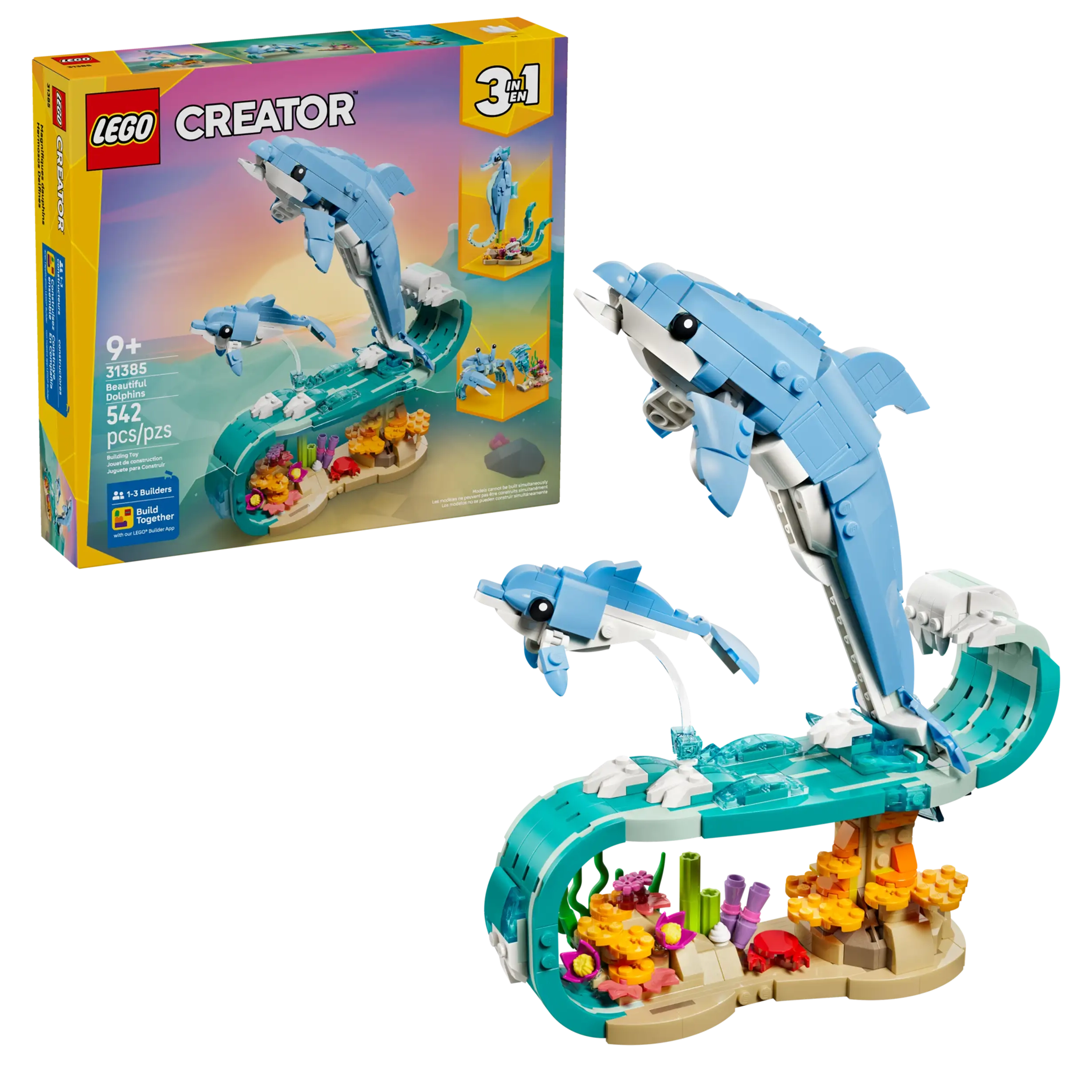 Το σετ κατασκευής LEGO® Creator 3 σε 1 Θαλάσσια ζώα: Όμορφα δελφίνια (31385) επιτρέπει σε παιδιά από 9 ετών και άνω να ζήσουν διασκεδαστικές ιστορίες. Αυτό το σετ με φιγούρες θαλάσσιων ζώων για κορίτσια και αγόρια προσφέρει 3 διαφορετικές επιλογές κατασκευής με τα ίδια τουβλάκια. Μπορούν να επιλέξουν να φτιάξουν ένα εντυπωσιακό μοντέλο ενήλικου και μικρού δελφινιού με κινούμενα μέρη, που πηδούν πάνω από κύμα με κοράλλια.