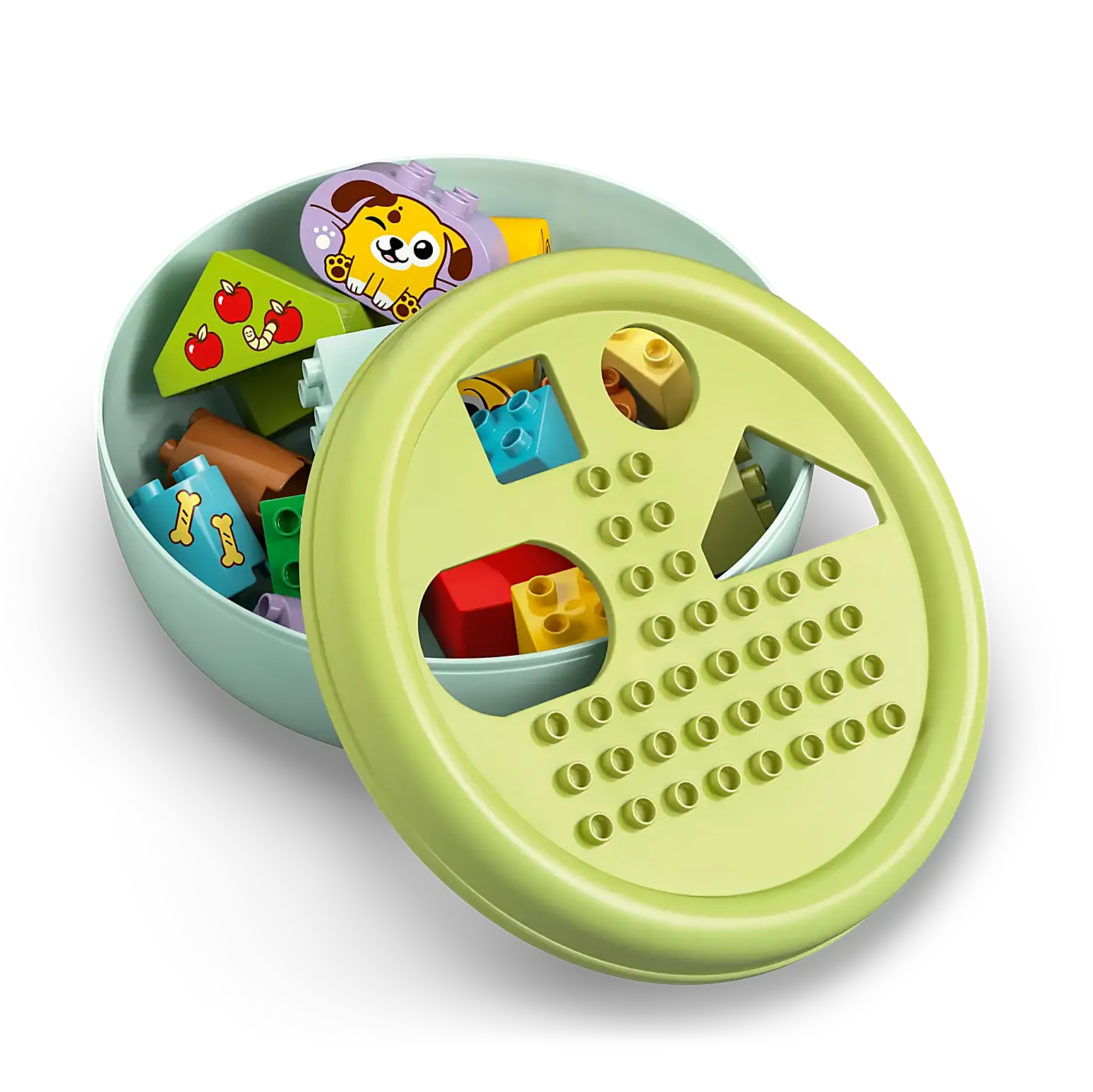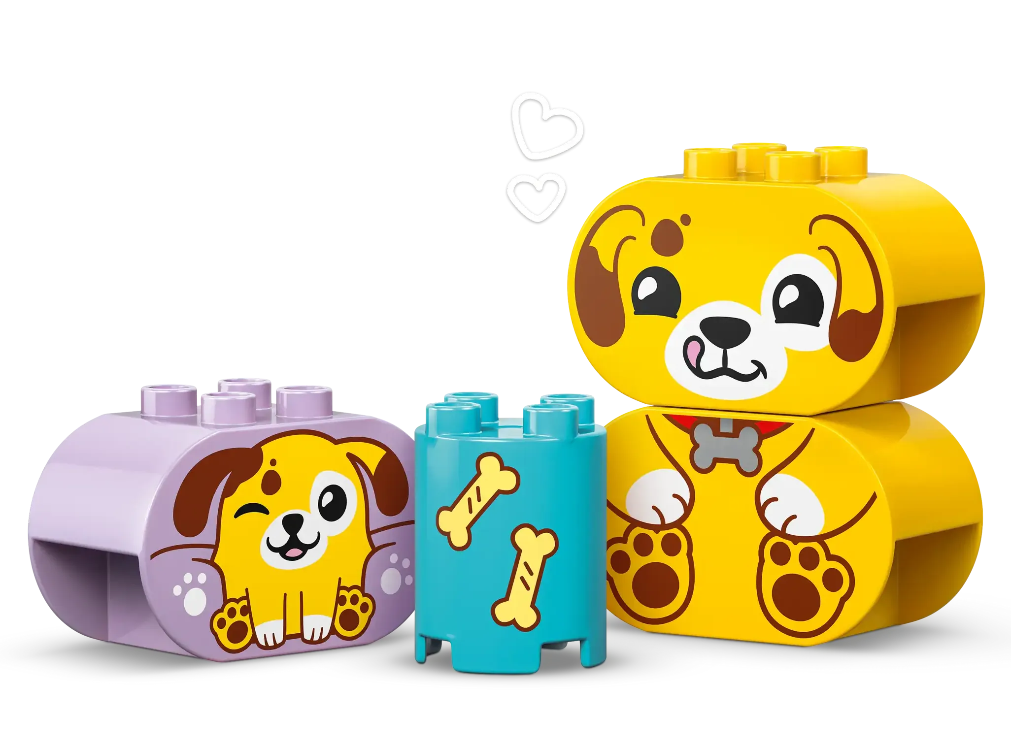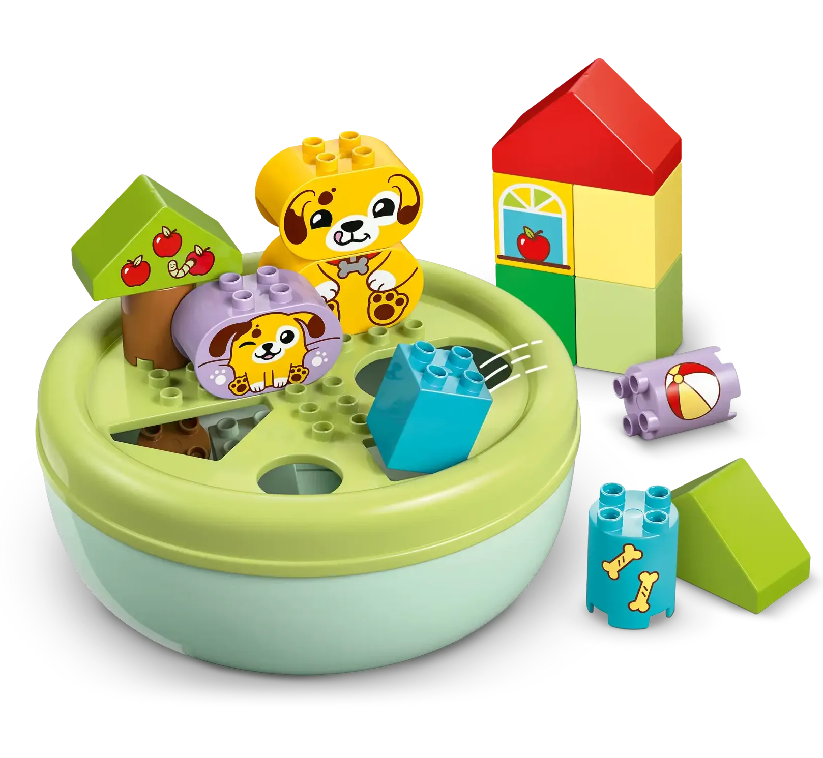 Αυτό το παιχνίδι χωρικής σκέψης για νήπια είναι γεμάτο διασκεδαστικές οικογενειακές μαθησιακές δραστηριότητες. Οι γονείς μπορούν να δείξουν όλα τα διαφορετικά σχήματα του σετ καθώς τα νήπια τα χρησιμοποιούν για να φτιάξουν δέντρα, φιγούρες σκύλων και ακόμα και ένα σπίτι. Στη συνέχεια, μπορούν να απολαύσουν δημιουργικό παιχνίδι ρόλων με τα χαριτωμένα LEGO® DUPLO® σκυλάκια τους, κυλώντας μια μπάλα για αυτά και ταΐζοντάς τα με ένα κόκαλο.