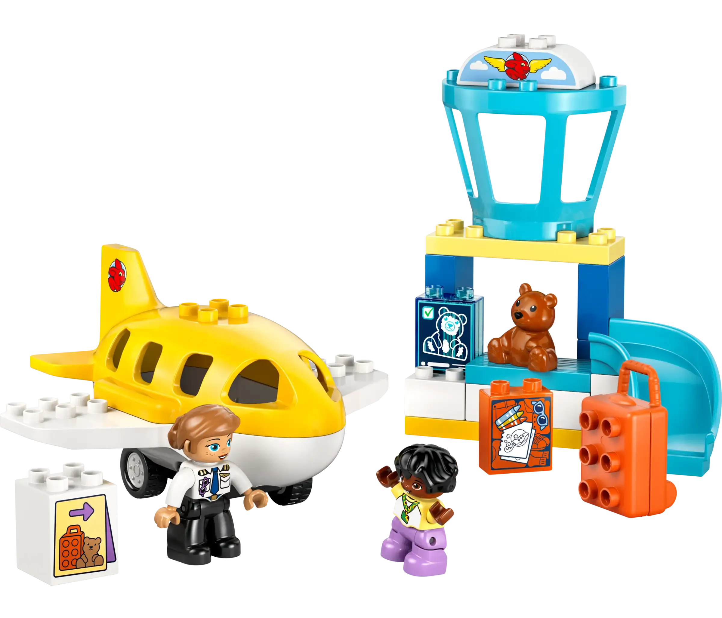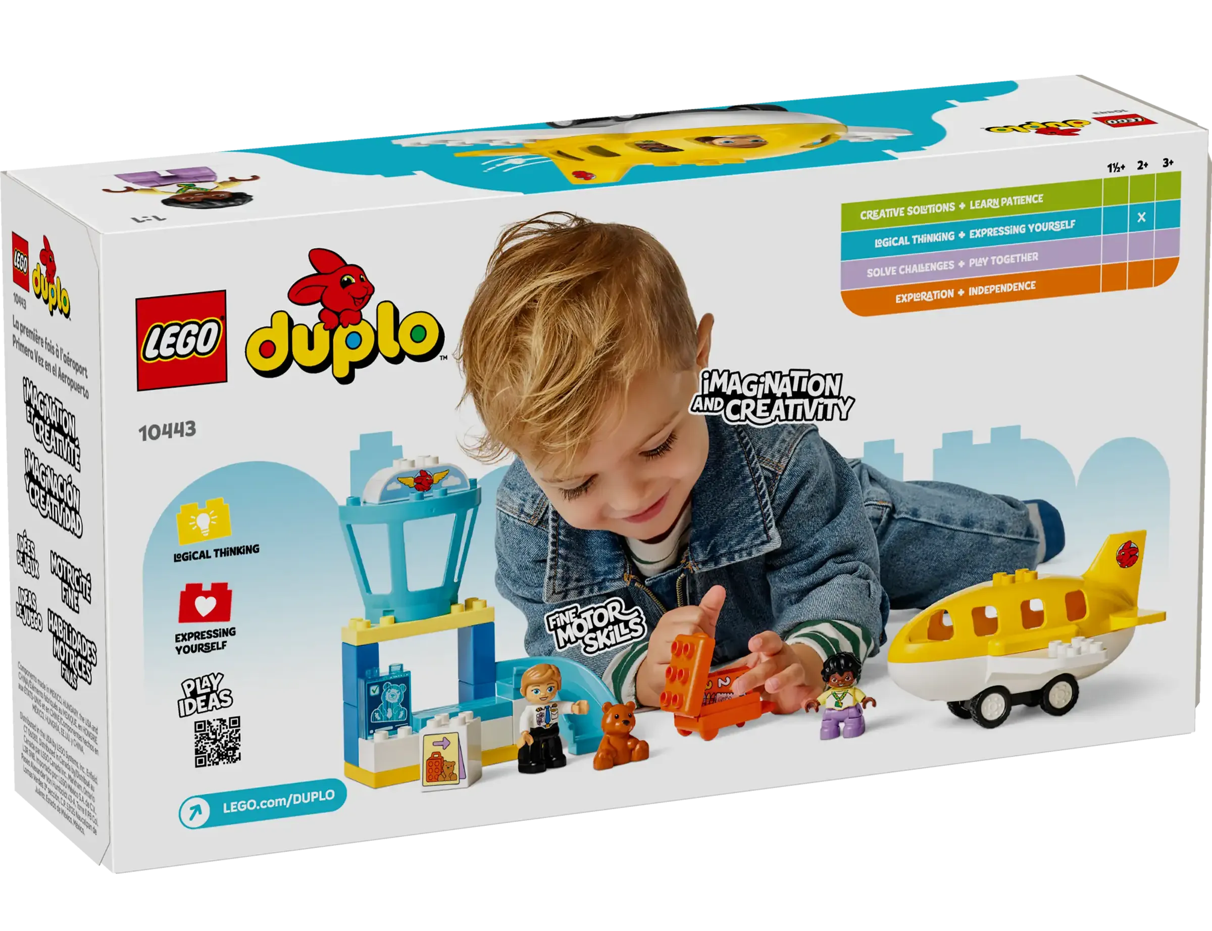 Αυτό το σετ παιχνιδιού αεροδρομίου LEGO® DUPLO® έχει πολλές λειτουργίες που πυροδοτούν το φανταστικό παιχνίδι. Περιλαμβάνει γραφείο ασφαλείας όπου τα νήπια μπορούν να παίζουν ότι σαρώσουν τη βαλίτσα και να την σπρώχνουν στην τσουλήθρα, πύργο ελέγχου εναέριας κυκλοφορίας και ένα κινητό αεροπλάνο παιχνιδιού που χωράει την αρκουδίτσα, το παιδί και τις φιγούρες πιλότου.